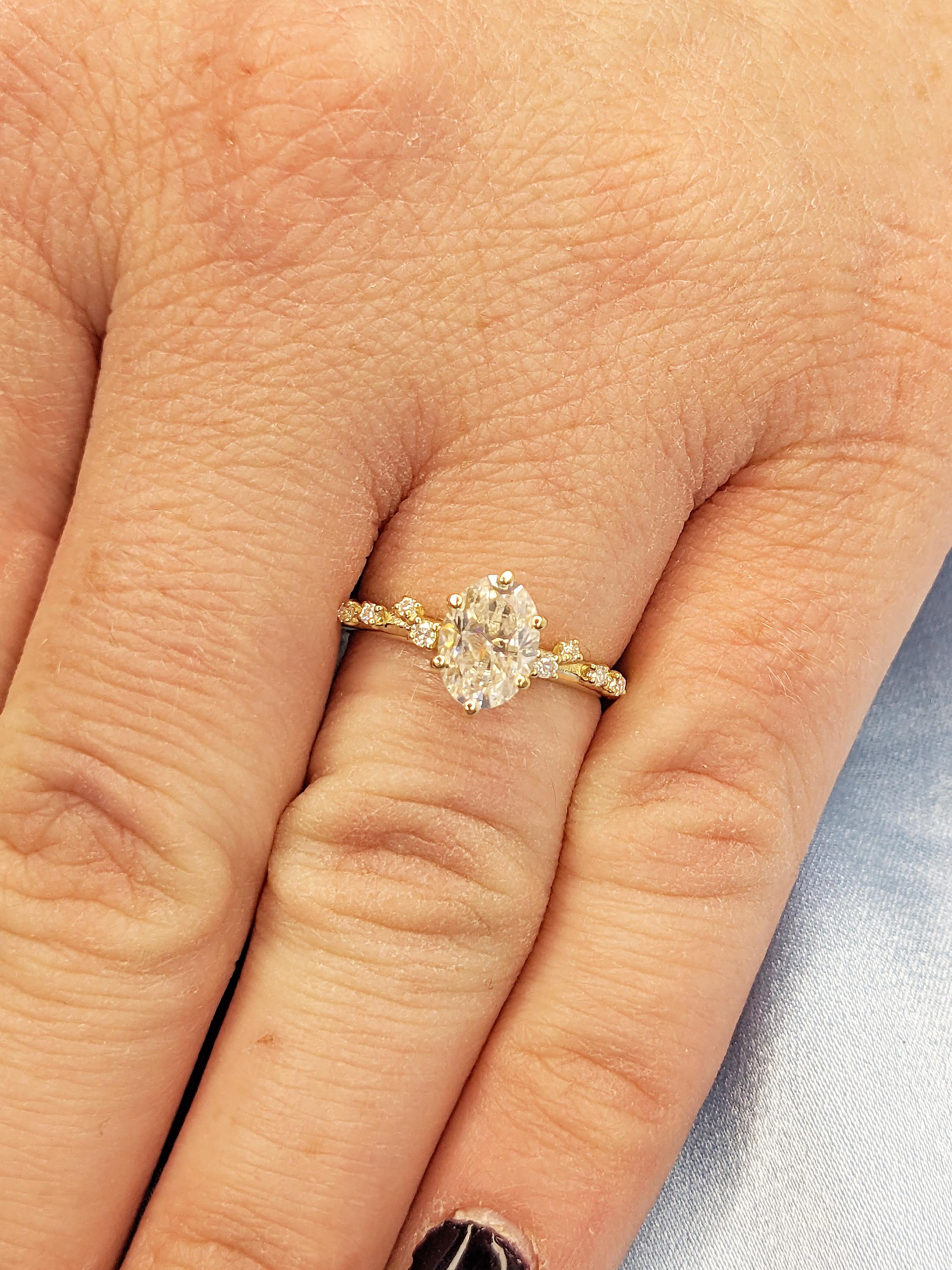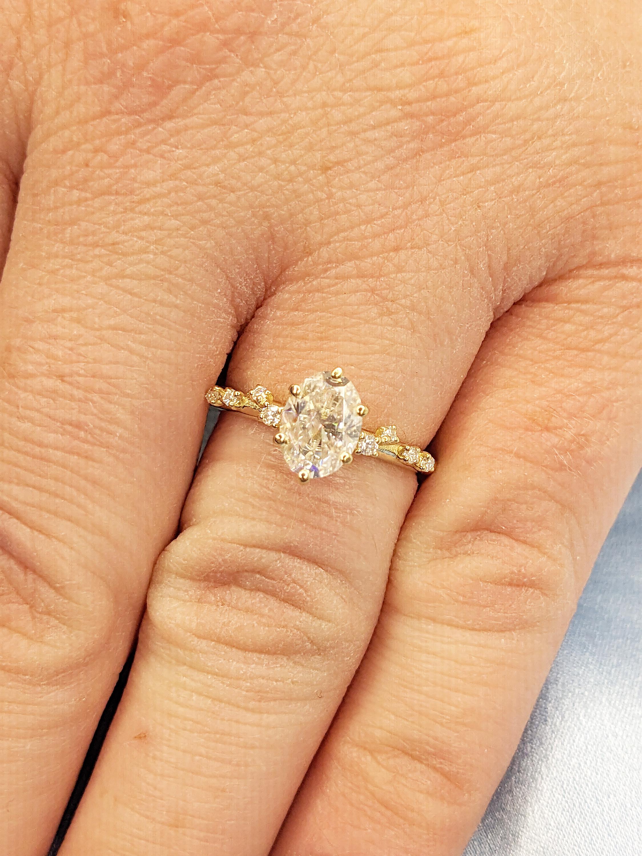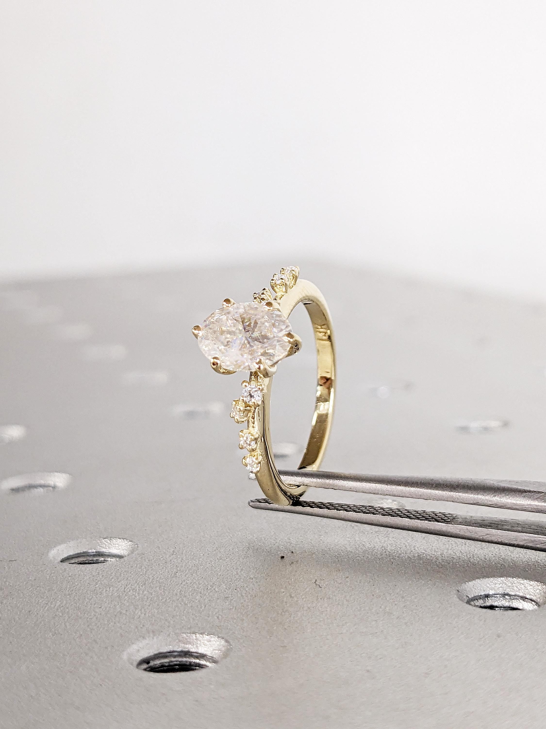 This stunning ring showcases an oval cut Lab Grown Diamond at its center, surrounded by a delicate sparkling Natural Diamonds, Lab Grown Diamonds, or Moissanites. The unique zigzag arrangement creates a mesmerizing and distinctive design, perfect for proposals or cherished milestones. Crafted to leave a lasting impression, this exquisite piece exudes timeless elegance.