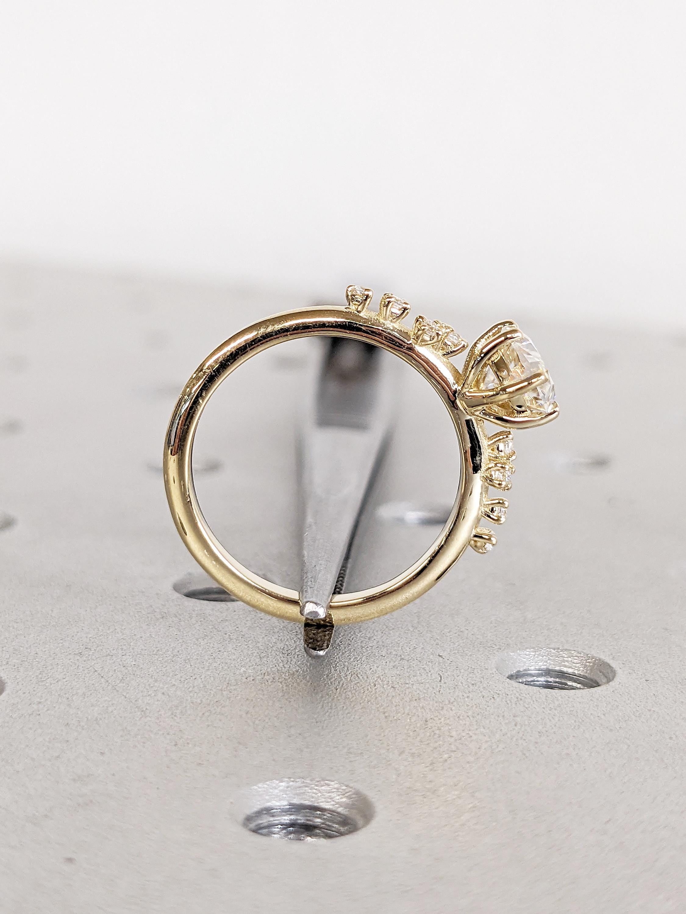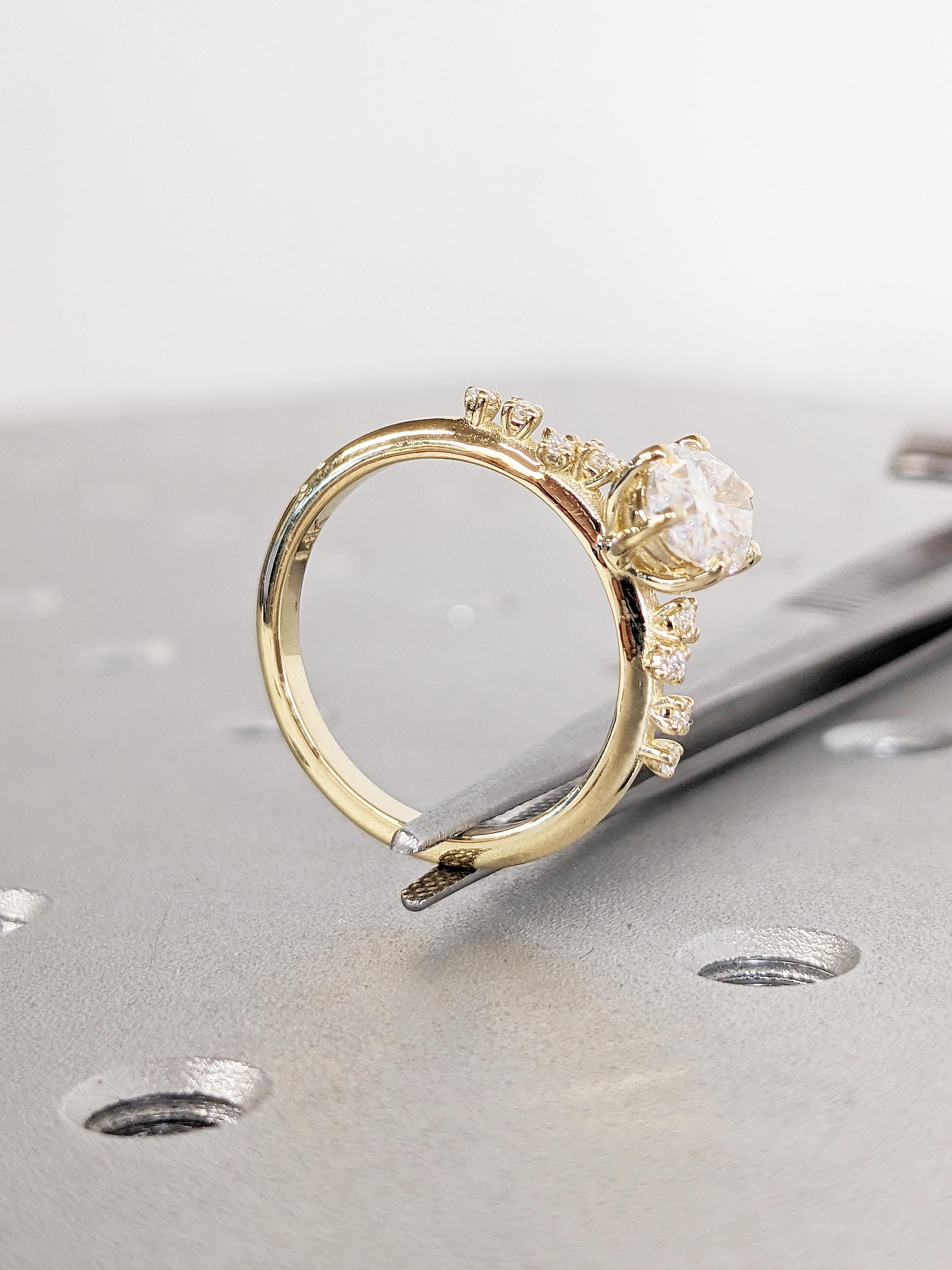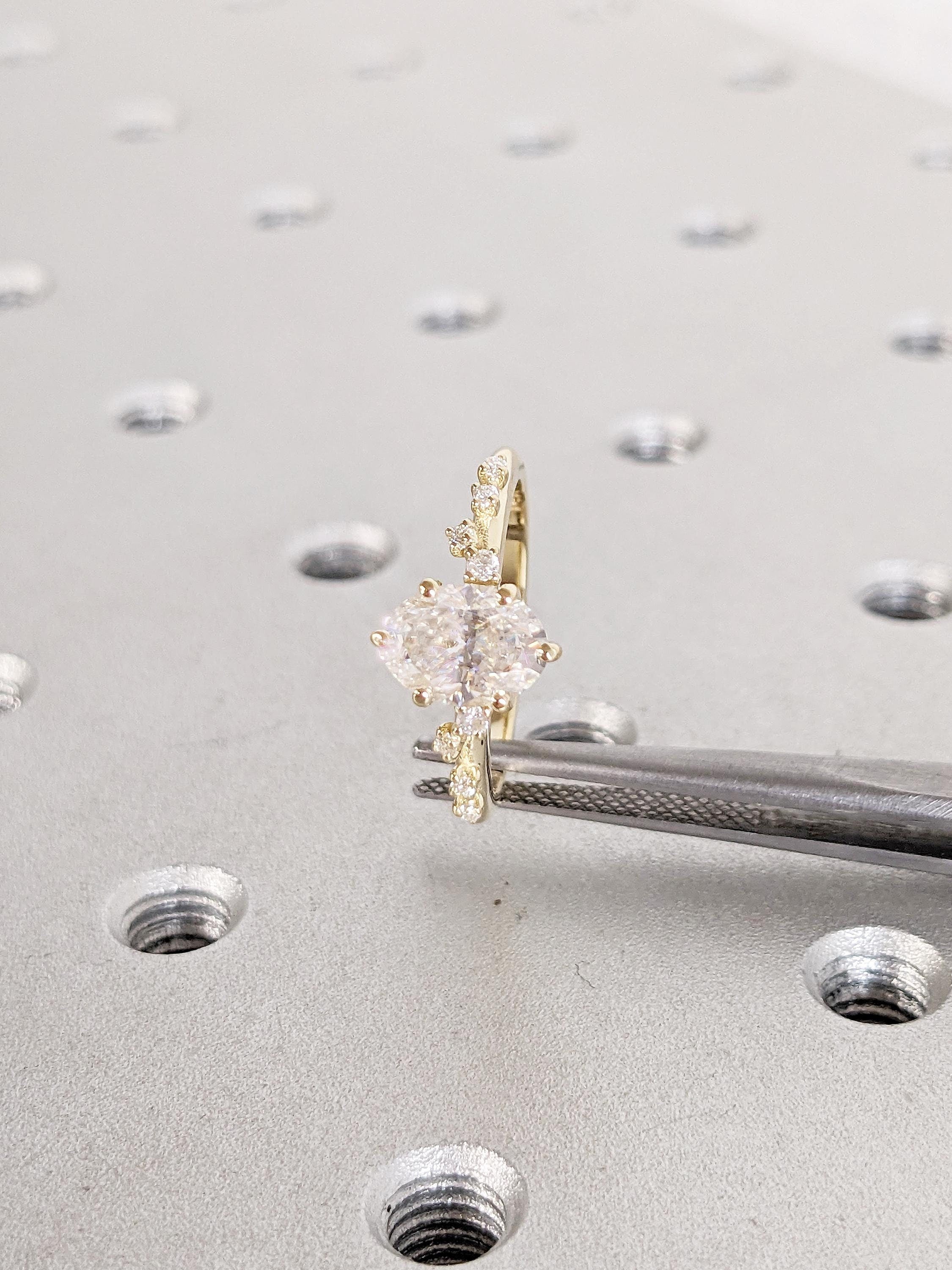 This stunning ring showcases an oval cut Lab Grown Diamond at its center, surrounded by a delicate sparkling Natural Diamonds, Lab Grown Diamonds, or Moissanites. The unique zigzag arrangement creates a mesmerizing and distinctive design, perfect for proposals or cherished milestones. Crafted to leave a lasting impression, this exquisite piece exudes timeless elegance.