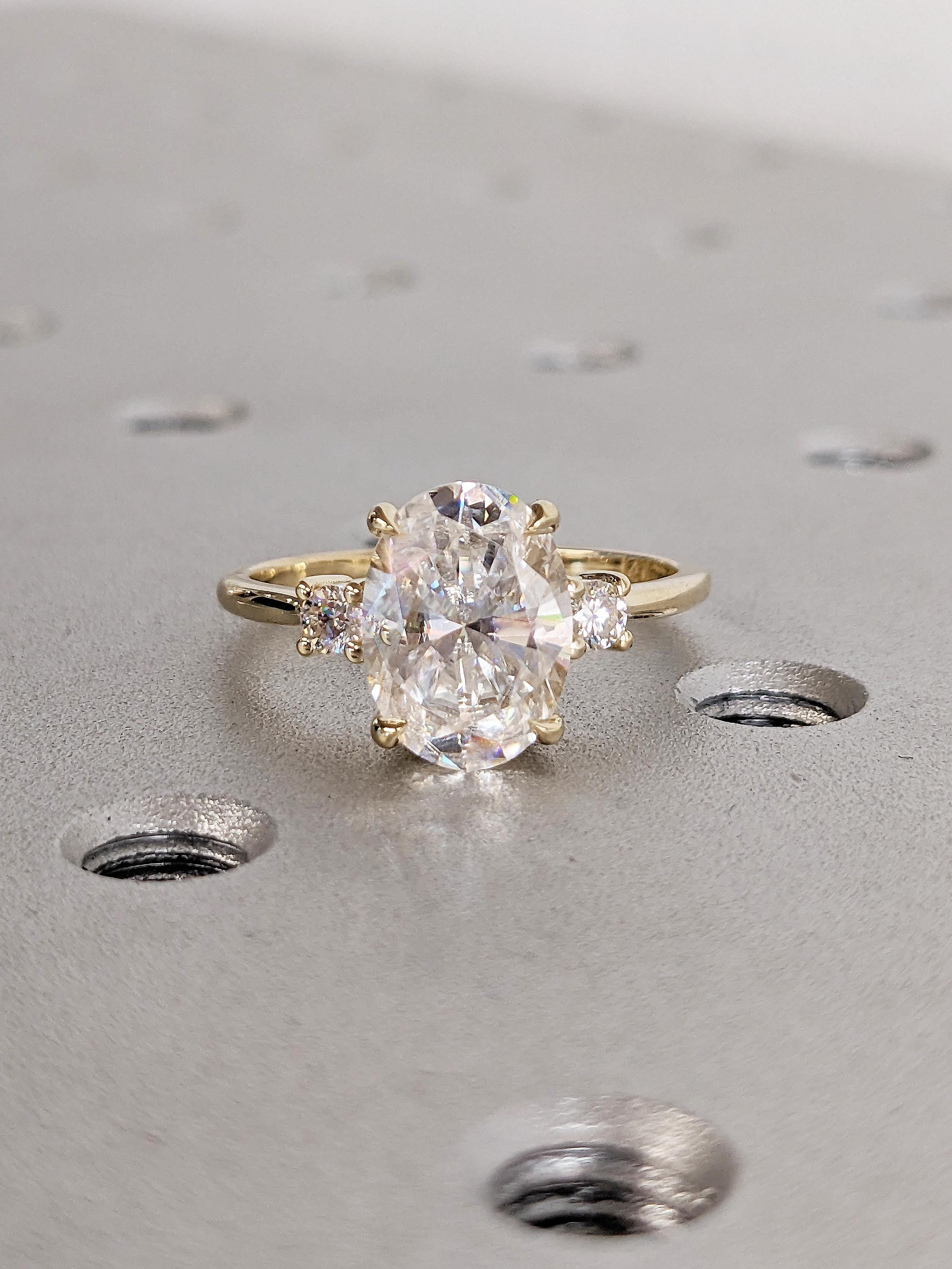 This stunning engagement ring features an oval cut Lab Grown Diamond center stone, elegantly secured in a talon prong setting for a sleek and modern look. Flanking the center stone are two round accent gems, available in your choice of Natural Diamonds, Lab Grown Diamonds, or Moissanites, adding extra brilliance and depth. The thoughtfully crafted design balances timeless sophistication with contemporary elegance, making it a perfect symbol of your enduring love.