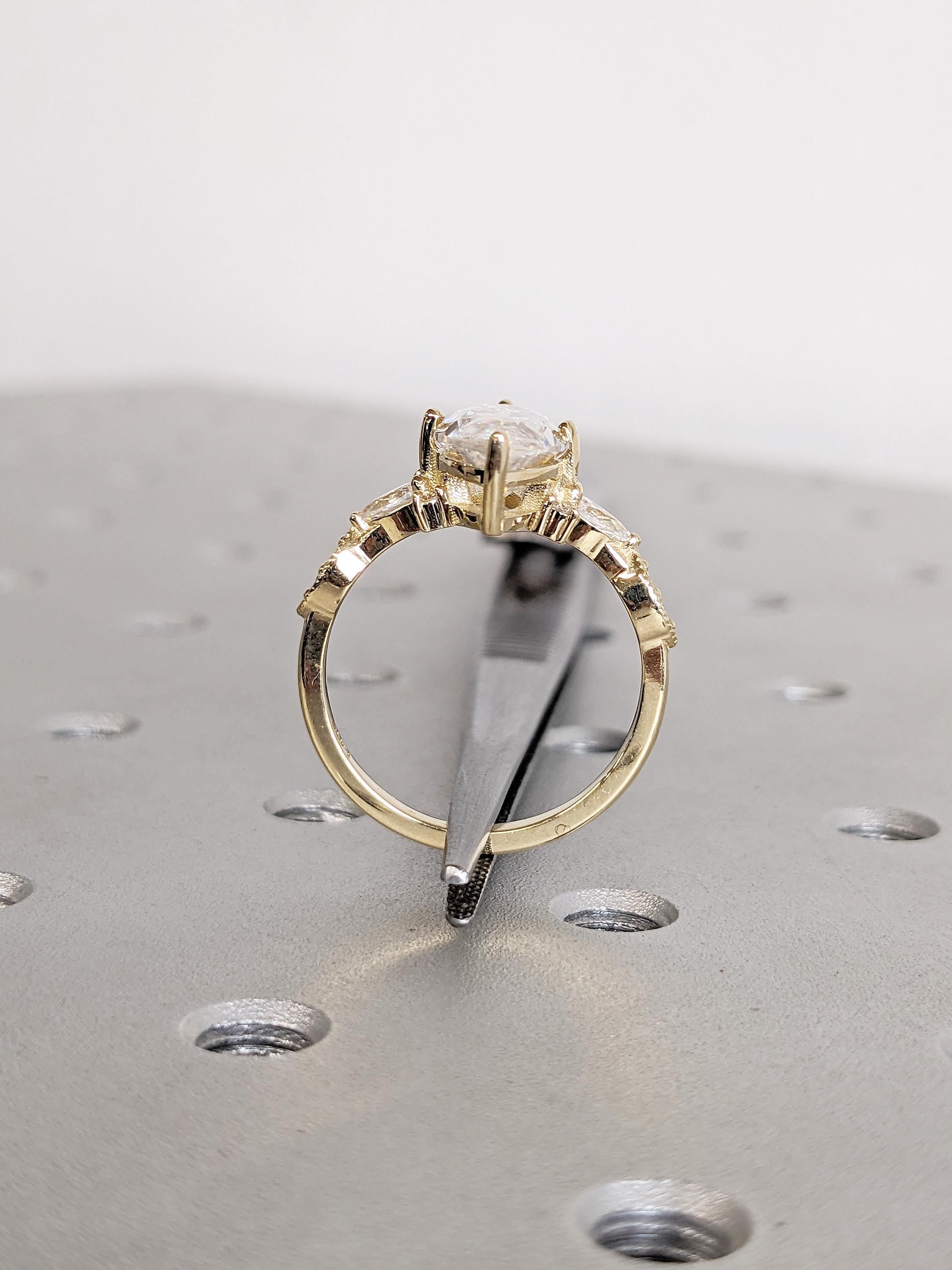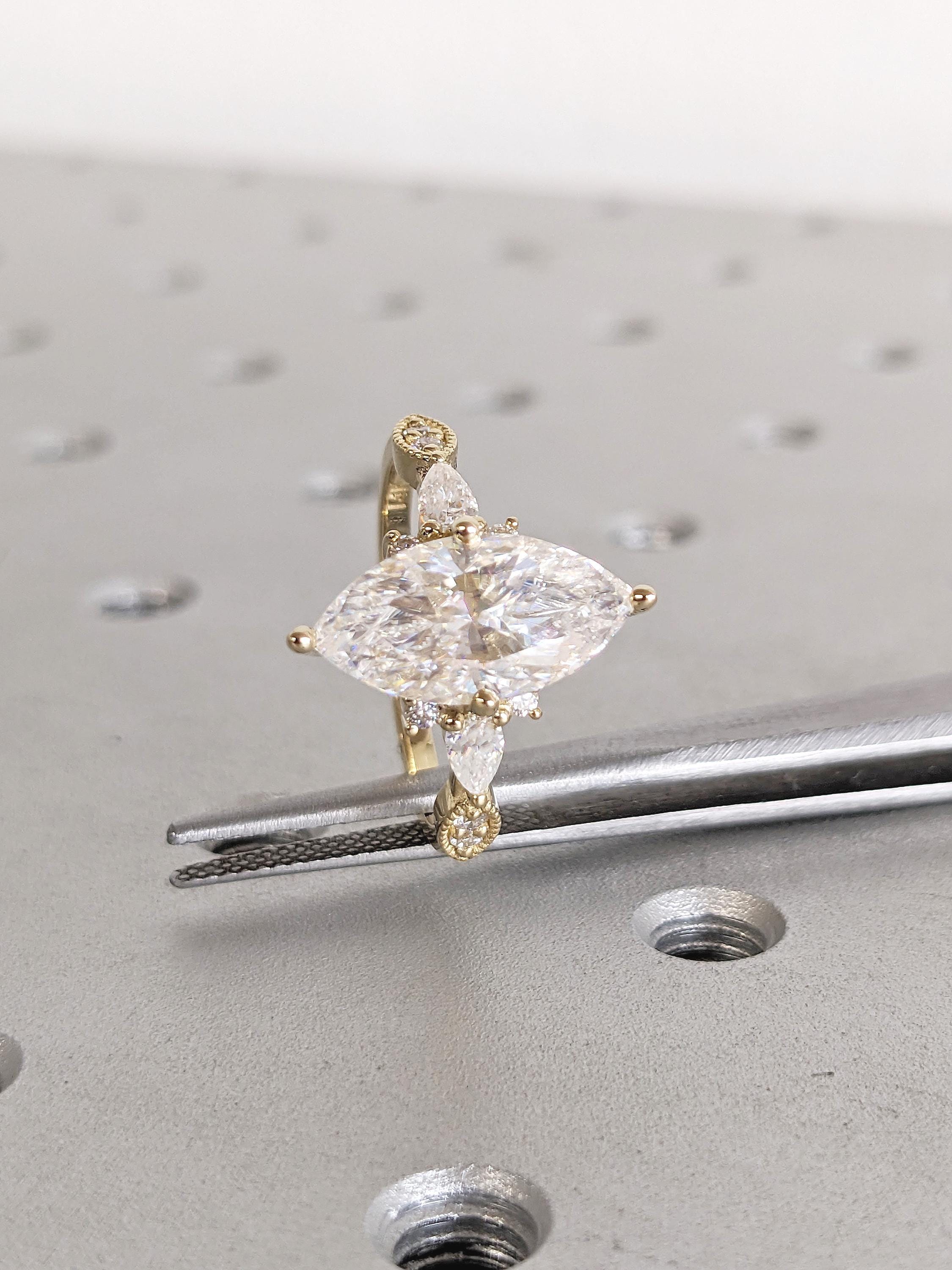 A vintage inspired statement ring, features a marquise cut Lab Grown Diamond focal stone, accented by round and pear cut side stones available in Natural Diamonds, Lab Grown Diamonds or Moissanites of your choice. With delicate hand engraved milgrain detailing, this fashionable jewelry effortlessly complements your style for any occasion.