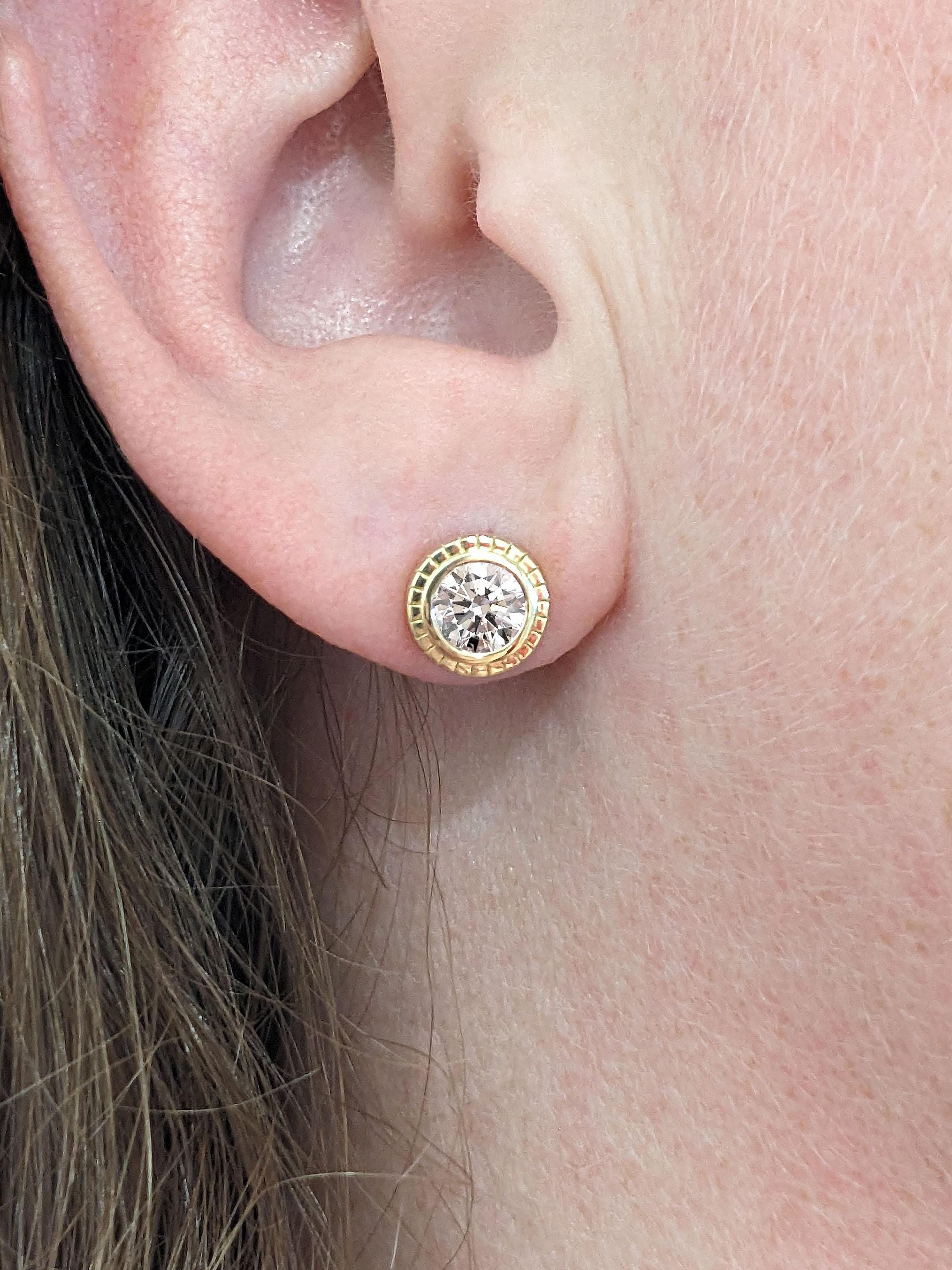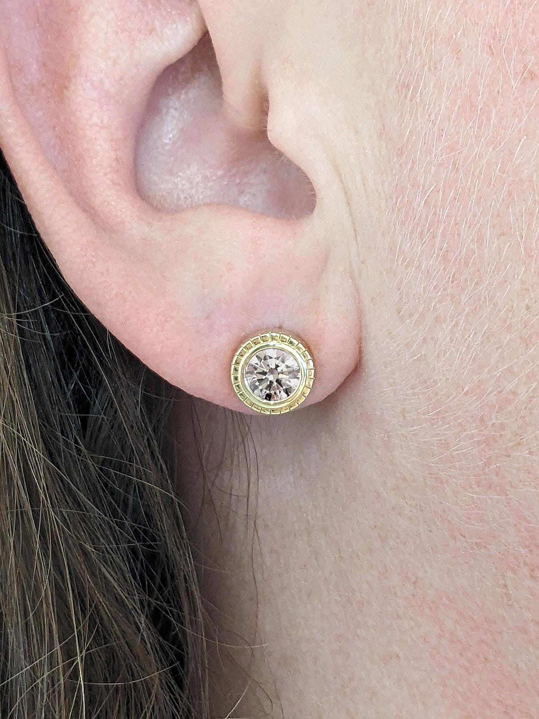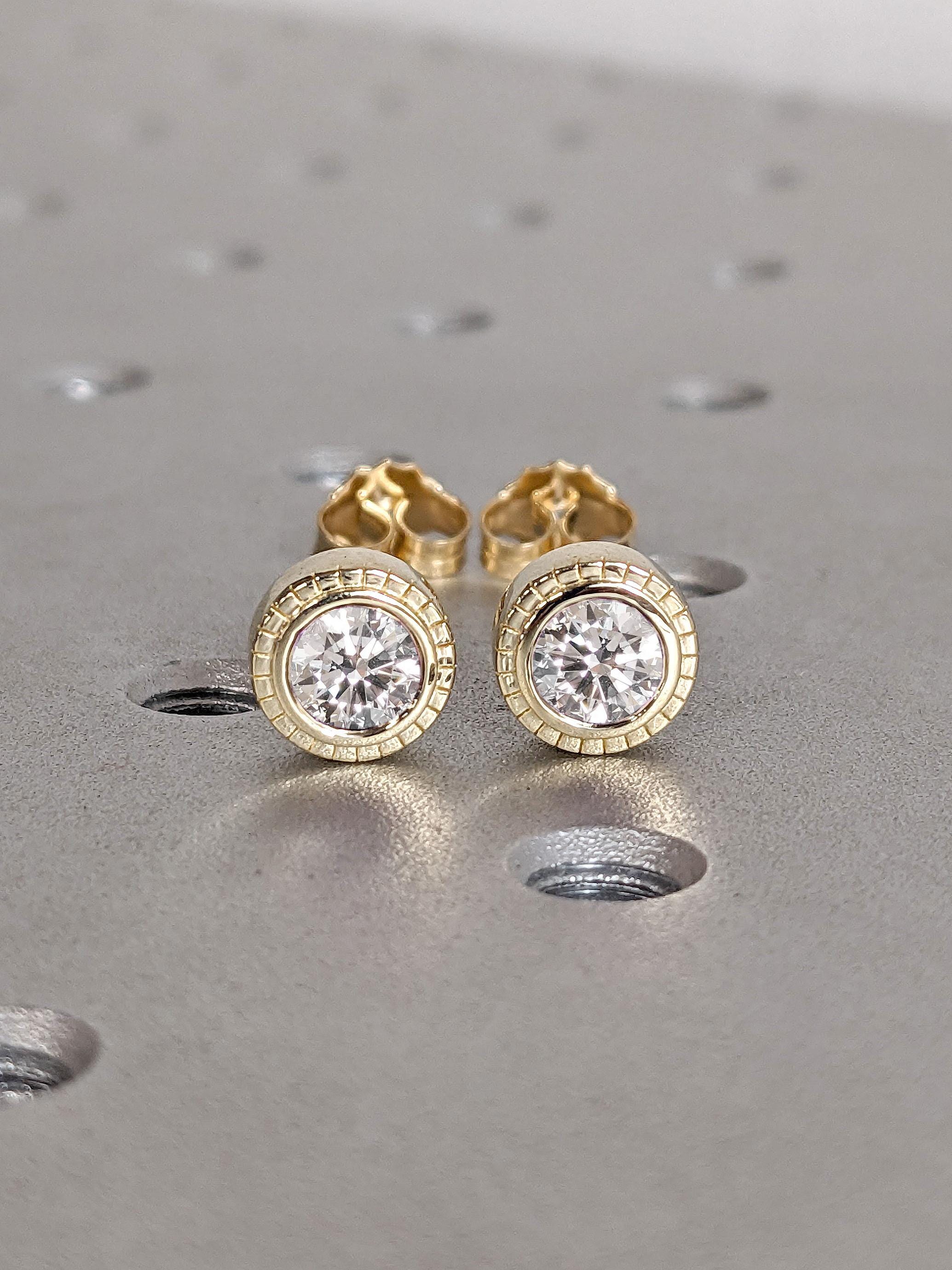 Classic with a modern twist, these stud earrings feature round cut Lab Diamond solitaires encircled by a sculpted ridged halo. The textured design adds depth and dimension, giving timeless studs a fresh, contemporary edge. Perfect for everyday wear or as a gift for special occasions.