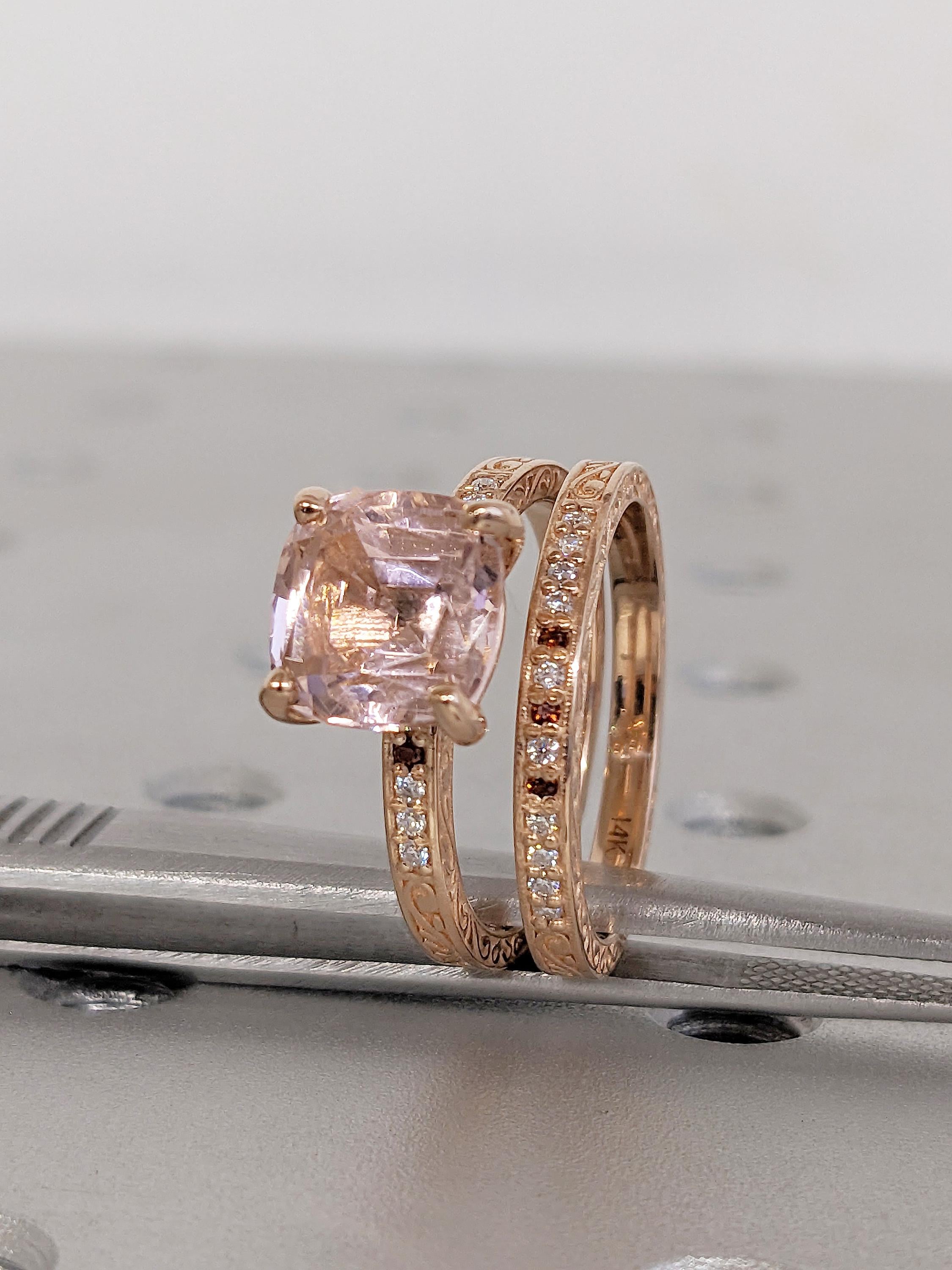 Lab Morganite Engagement Ring Set, 18k/14k Rose Gold Cushion Cut Ring, Bridal Set Filigree Ring, Diamond, Garnet, Peachy Pink Morganite Ring