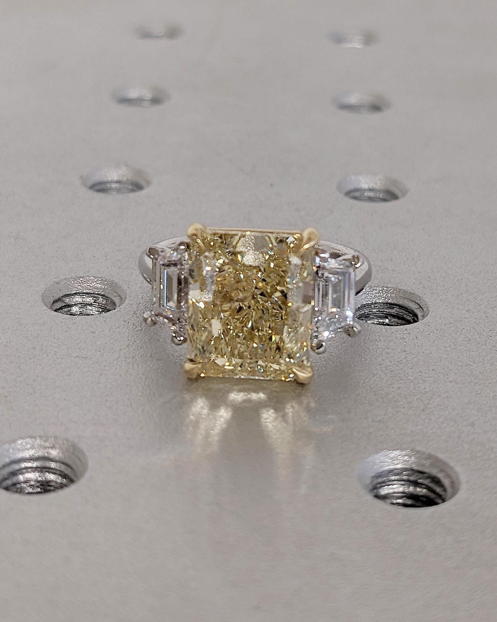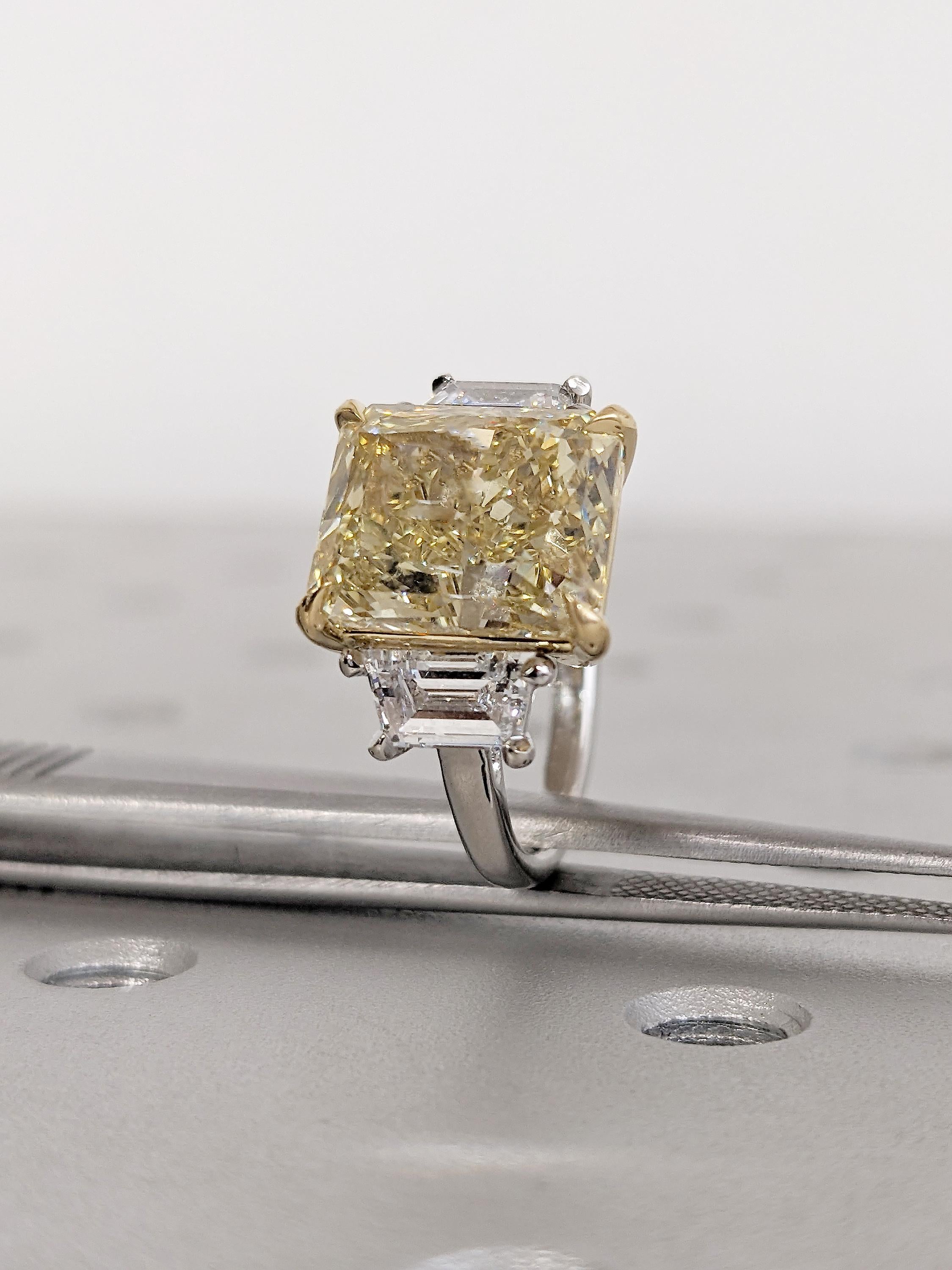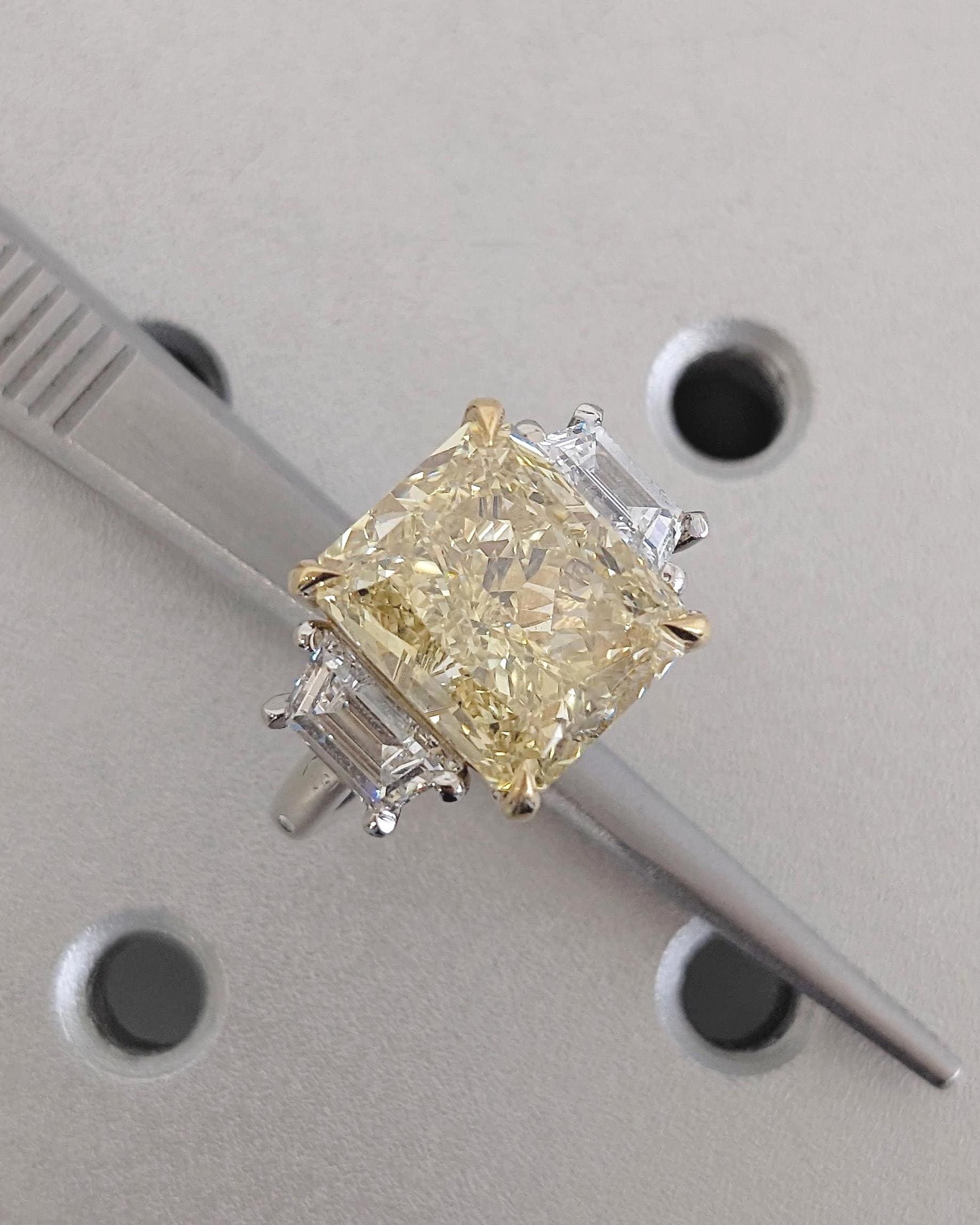 This radiant cut yellow Lab Grown Diamond engagement ring makes a bold yet refined statement. The vivid yellow center stone is beautifully framed by sleek trapezoid-cut lab grown diamond side stones that enhance its brilliance and symmetry. Finished in an elegant two-tone design, the contrasting head and shank add depth and sophistication, creating a timeless ring that feels both modern and luxurious.