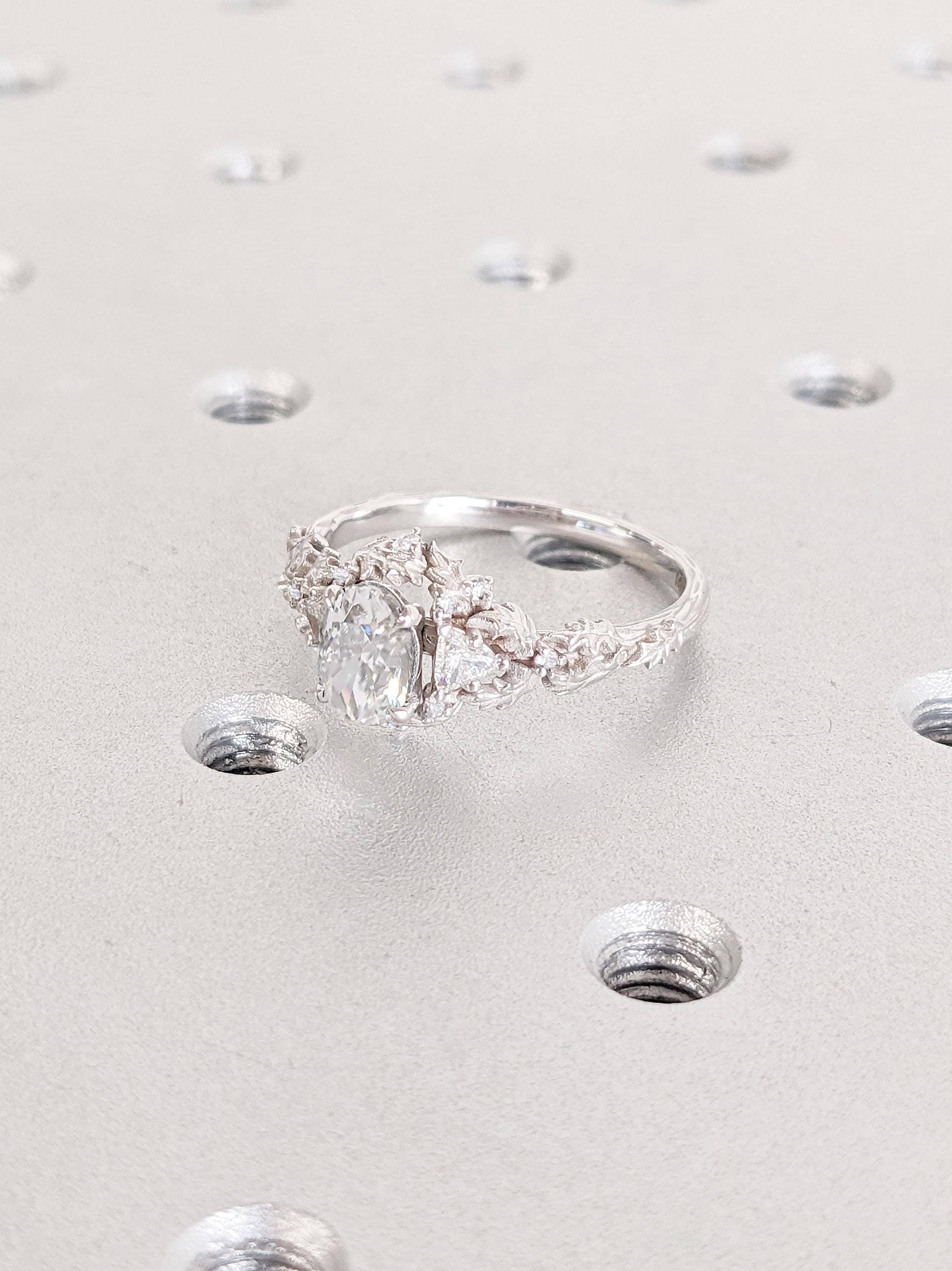 Leaf and Twigs Ring | Rustic Engagement Ring | 14k 18k White Gold Moissanite and Diamond Cluster Ring | Oval cut Moissanite Promise Ring