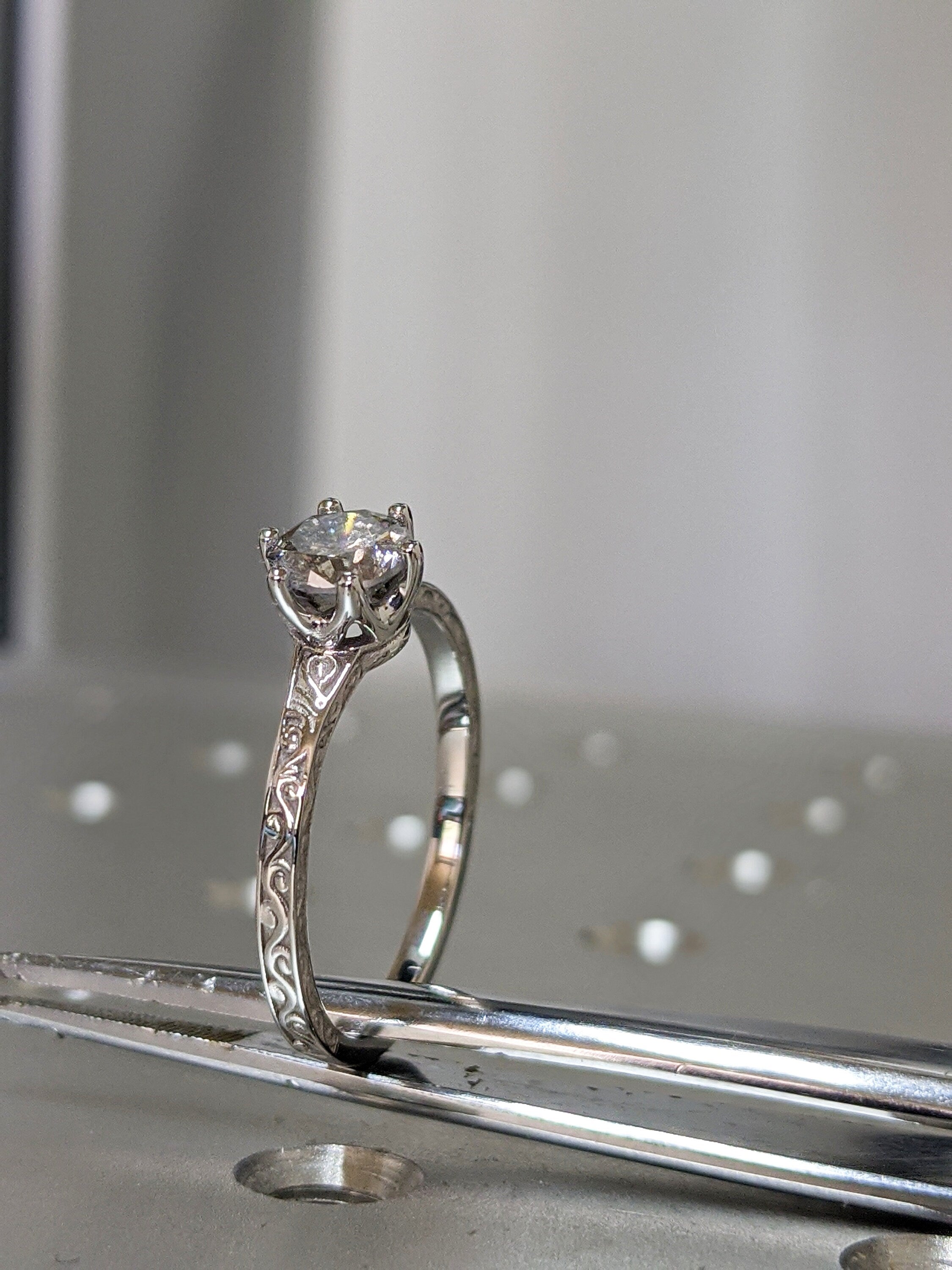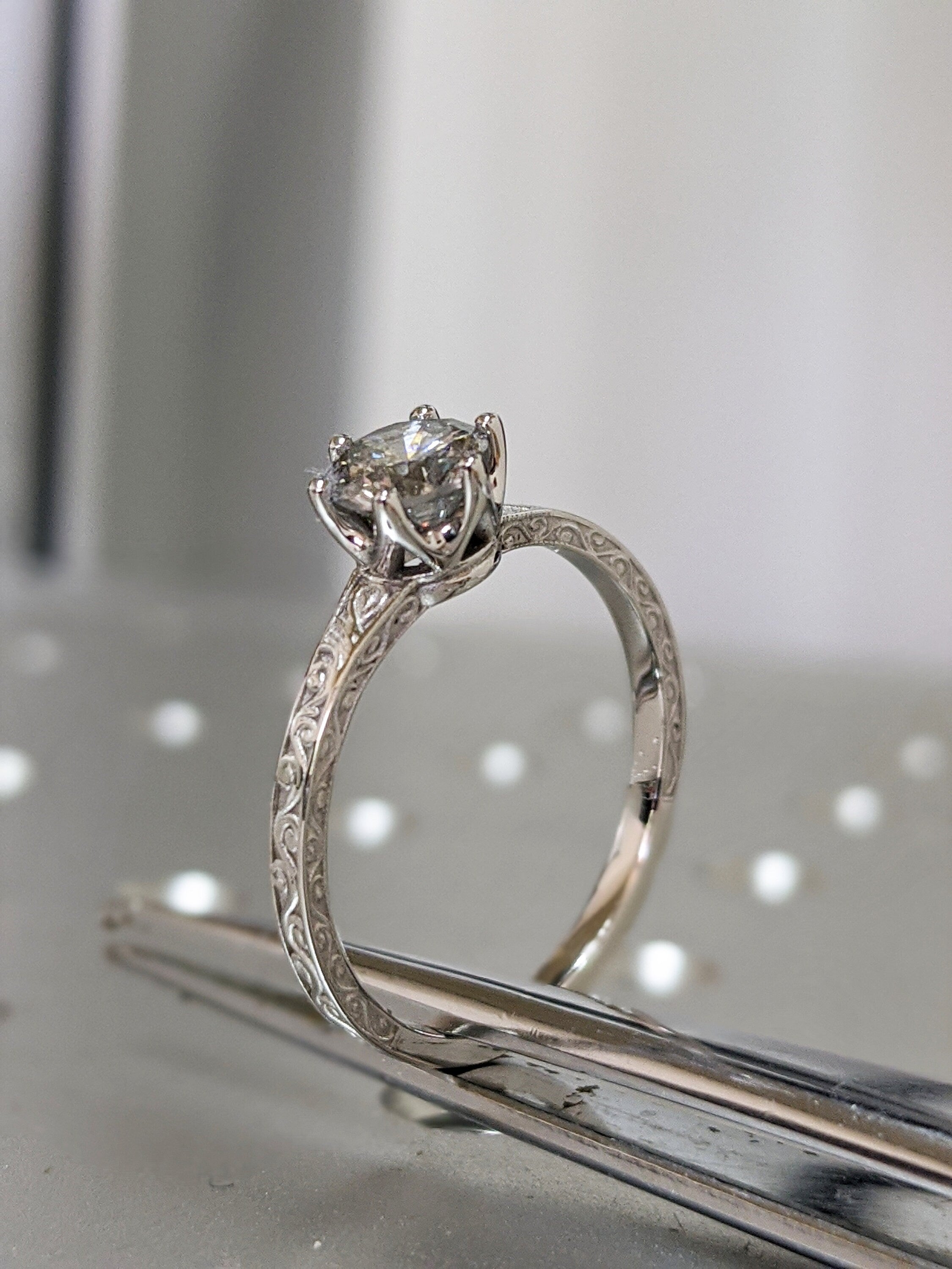This hand made ring is crafted of the finest quality 14k gold. This antique-inspired engagement ring features a basket setting, held on a square-shaped band, adorned with undulating wave filigree and edged with milgrain.