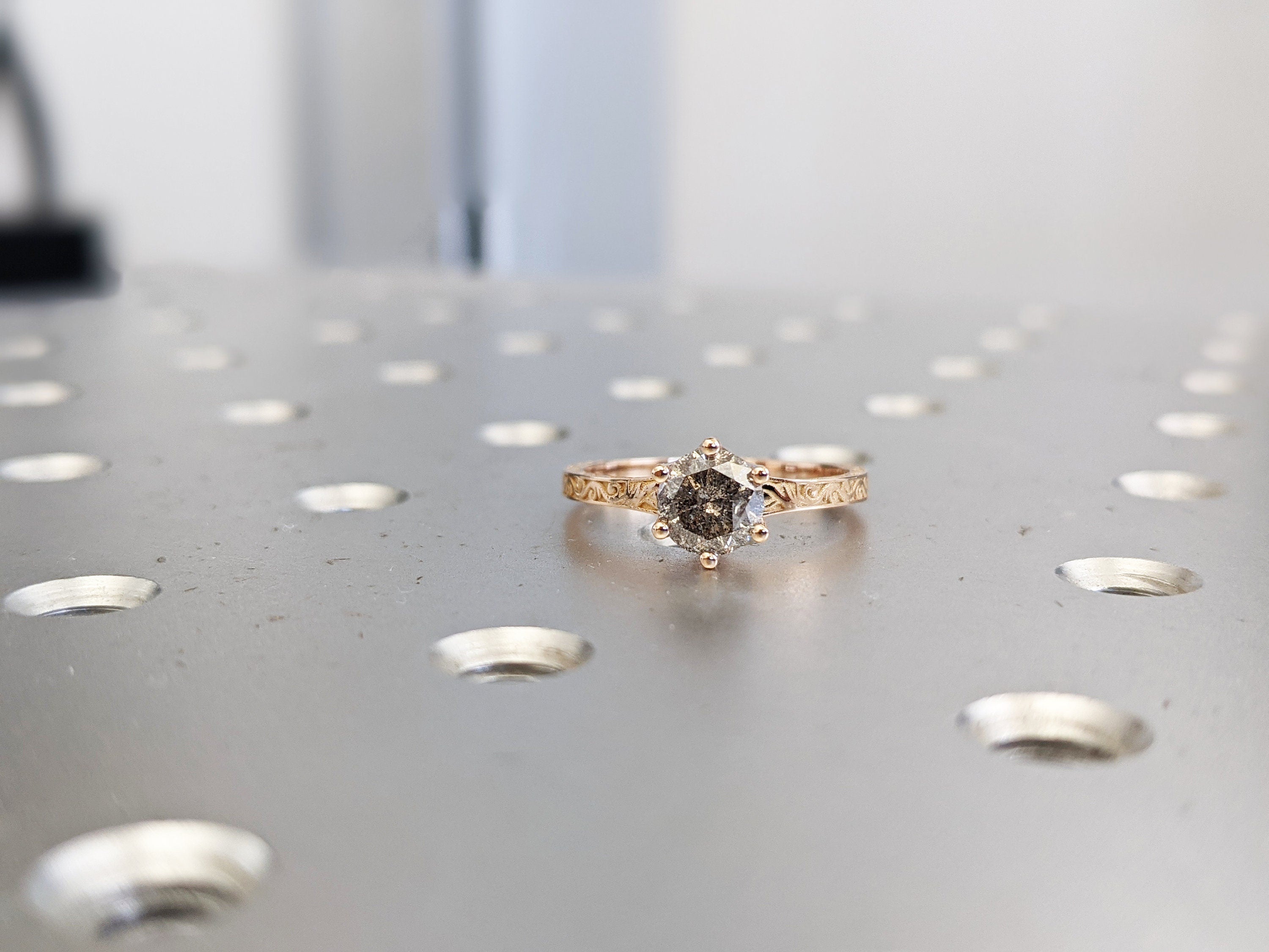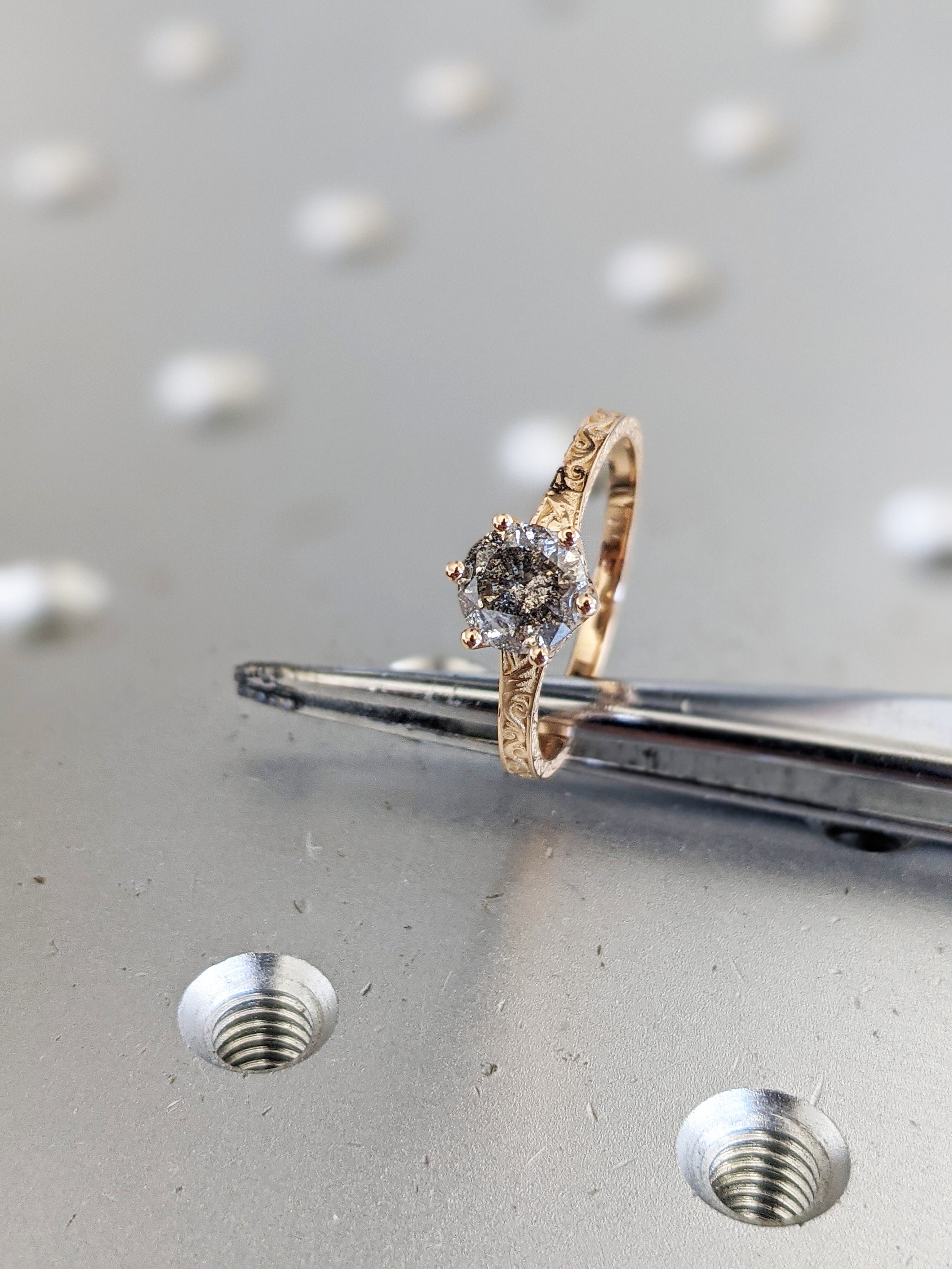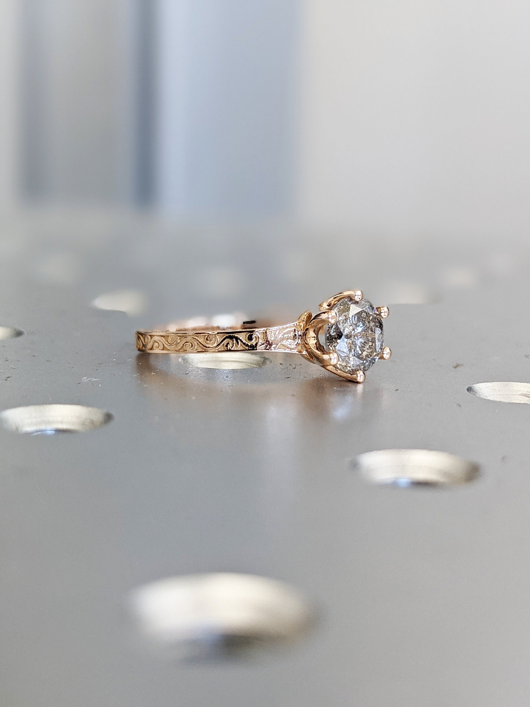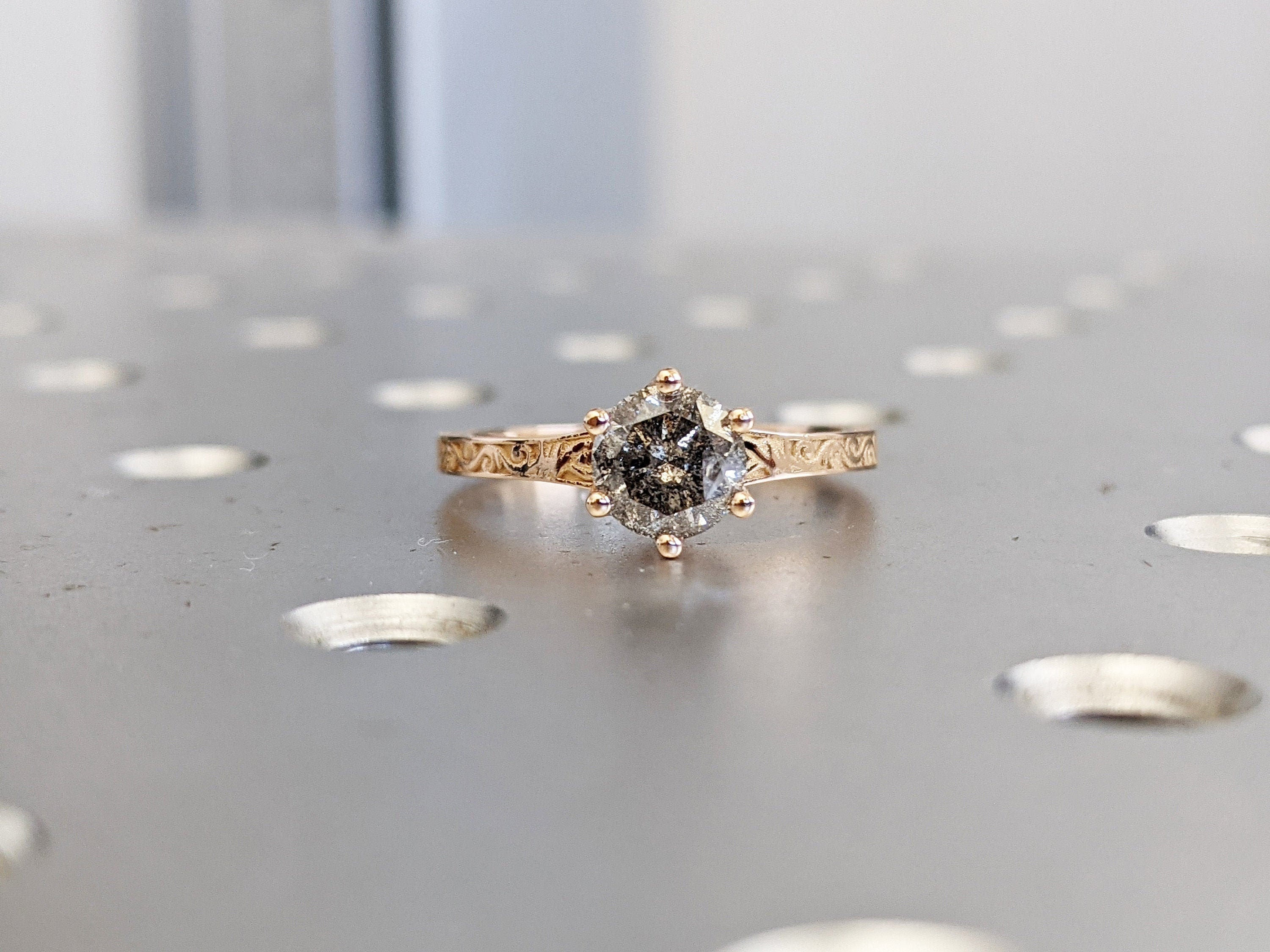 Light Raw Salt and Pepper Diamond Rose /White /Yellow Gold Engagement Ring Art Deco 1920's Inspired Thin Petite Band 18k Unique Ring for Her - CORINNE