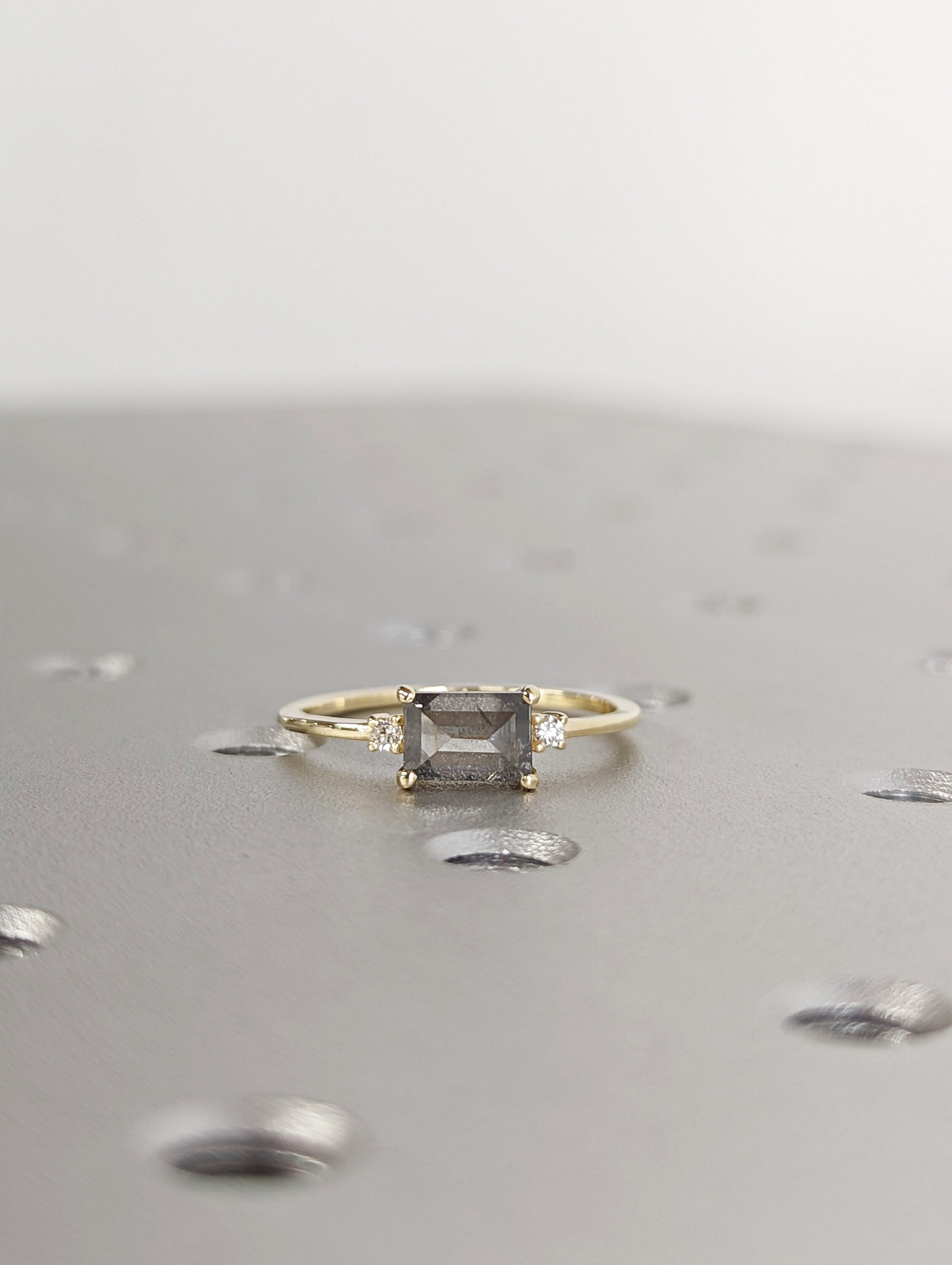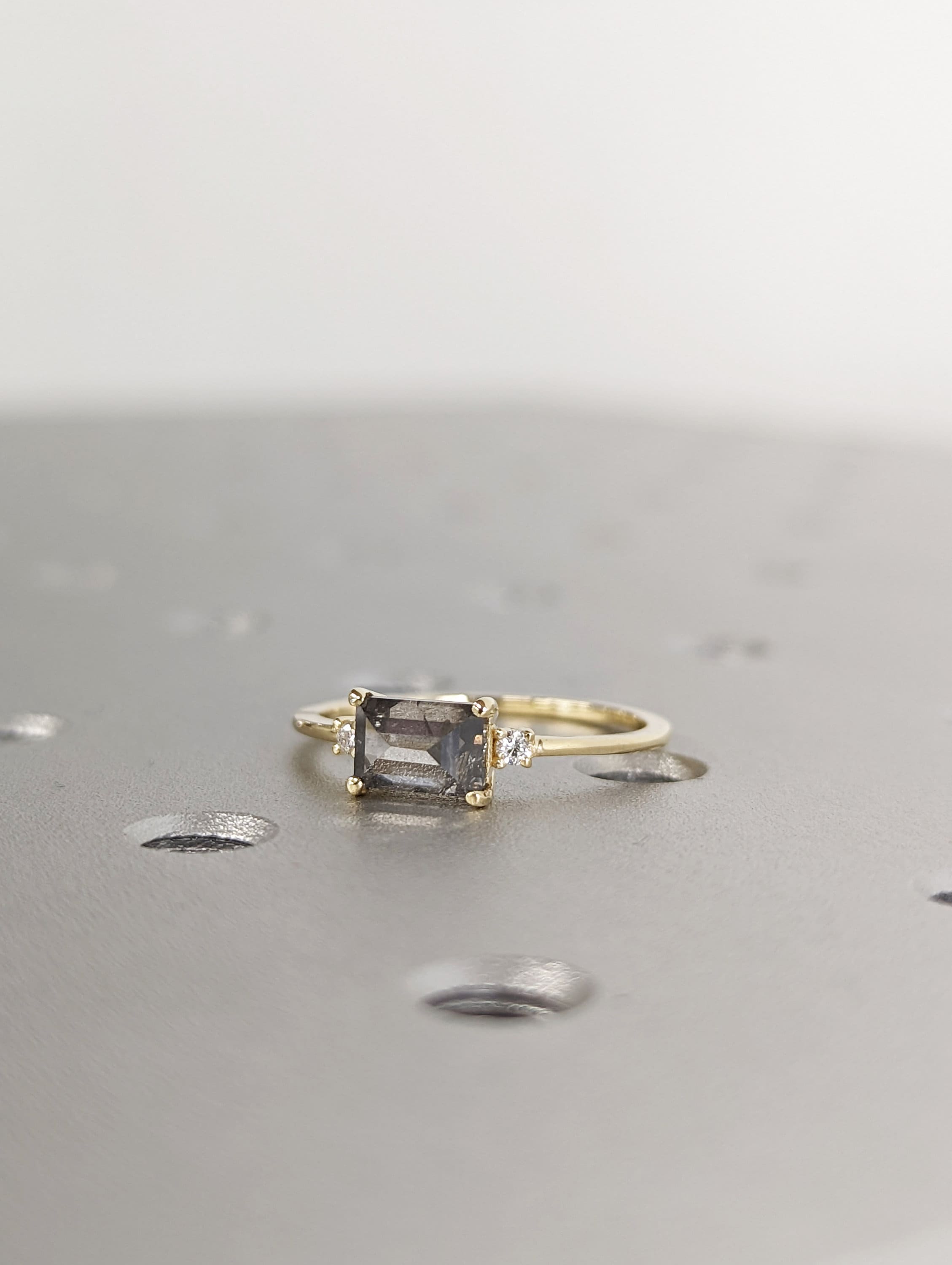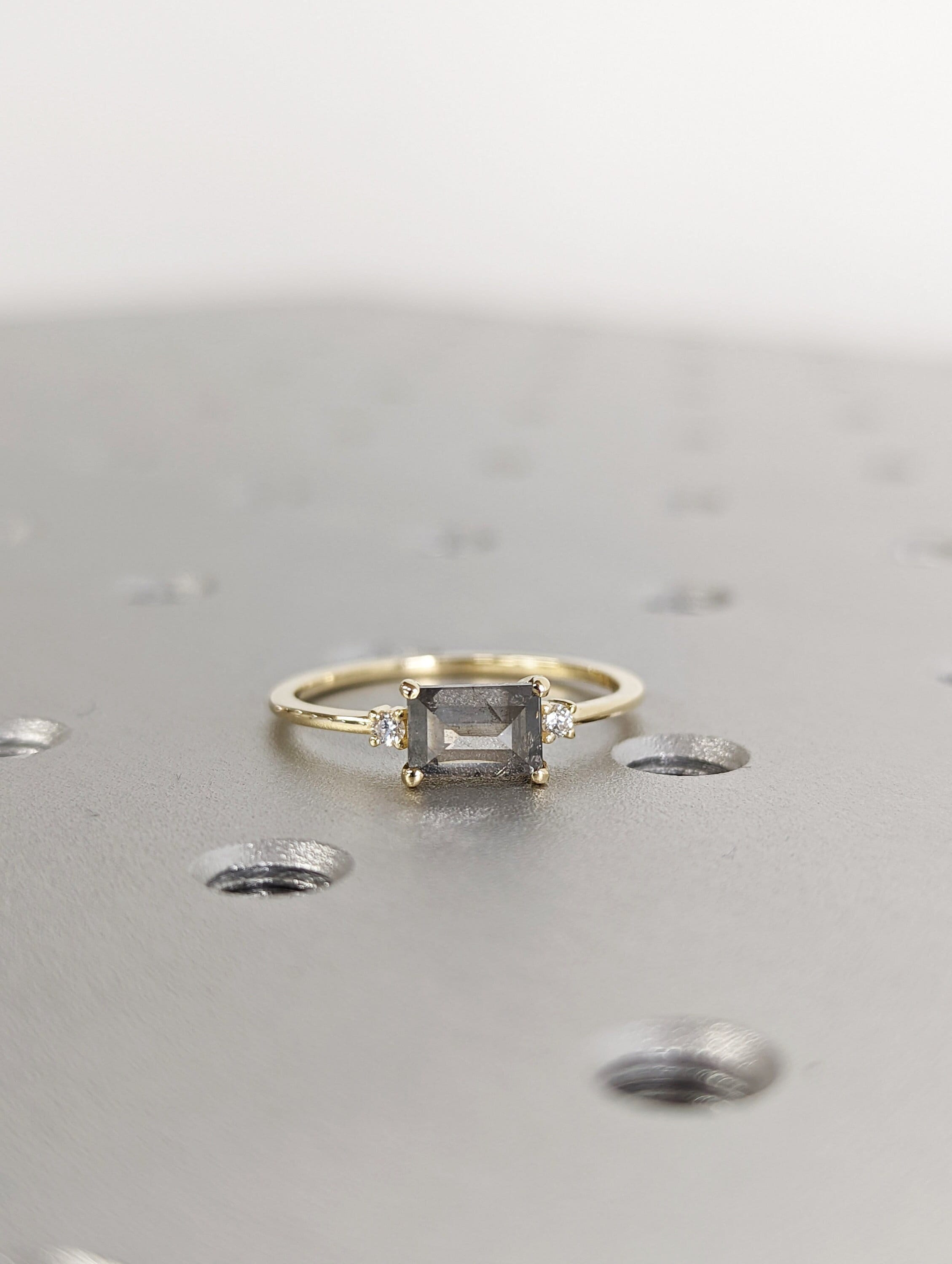 A stunningly beautiful vintage inspired design, petite band with a baguette cut Salt & Pepper diamond, adorned by 2 beautiful diamonds to contrast the center diamond.