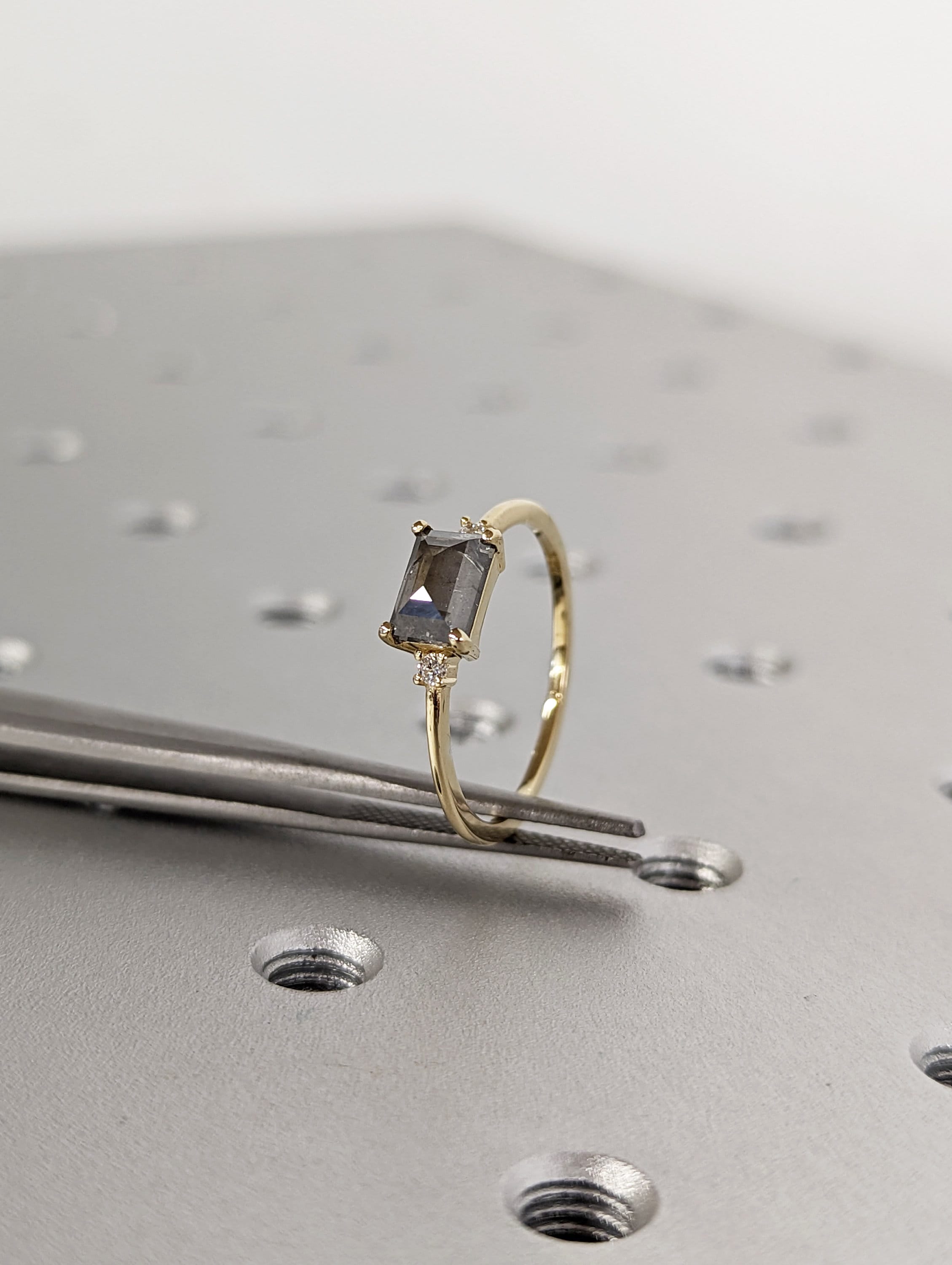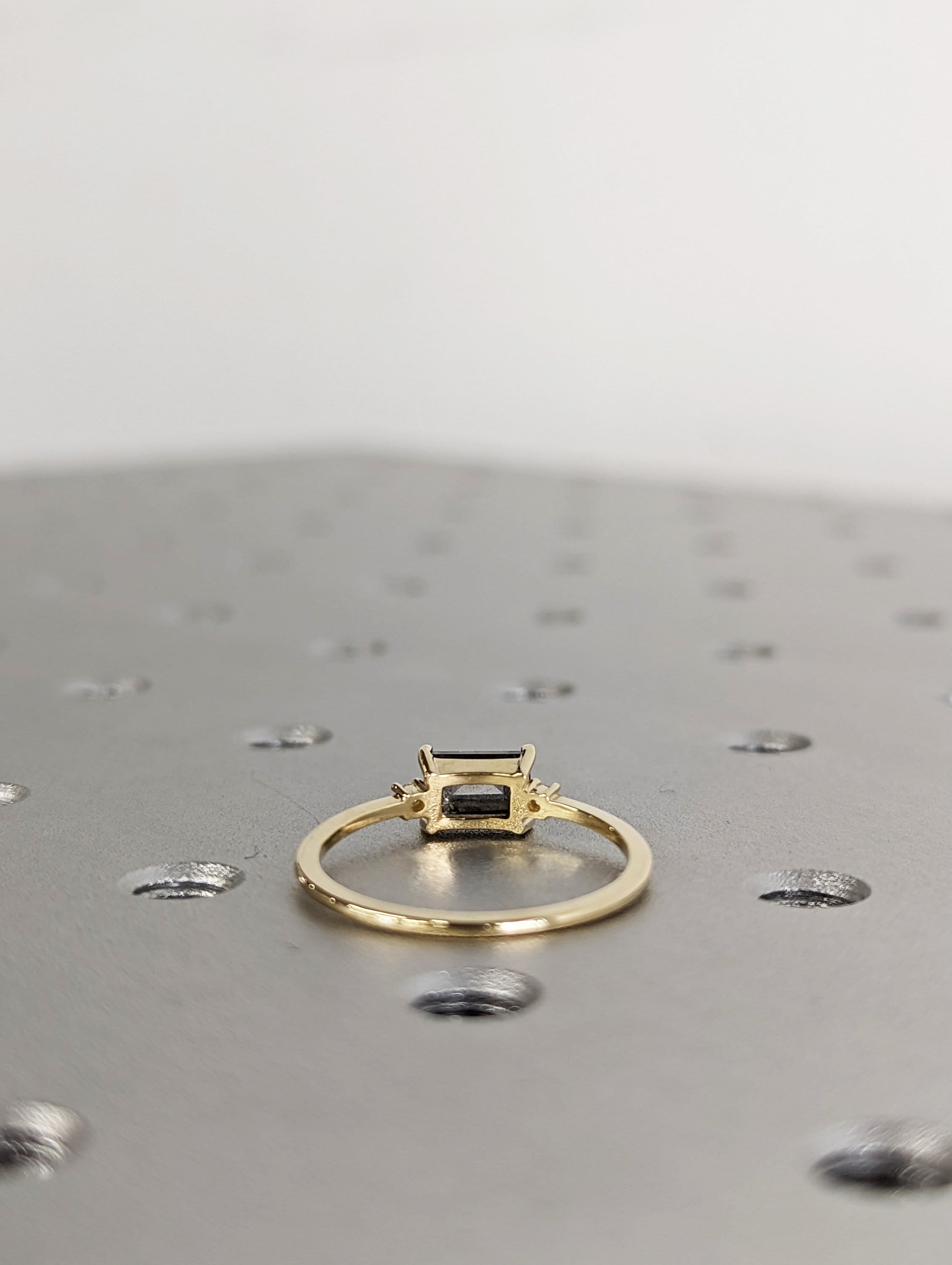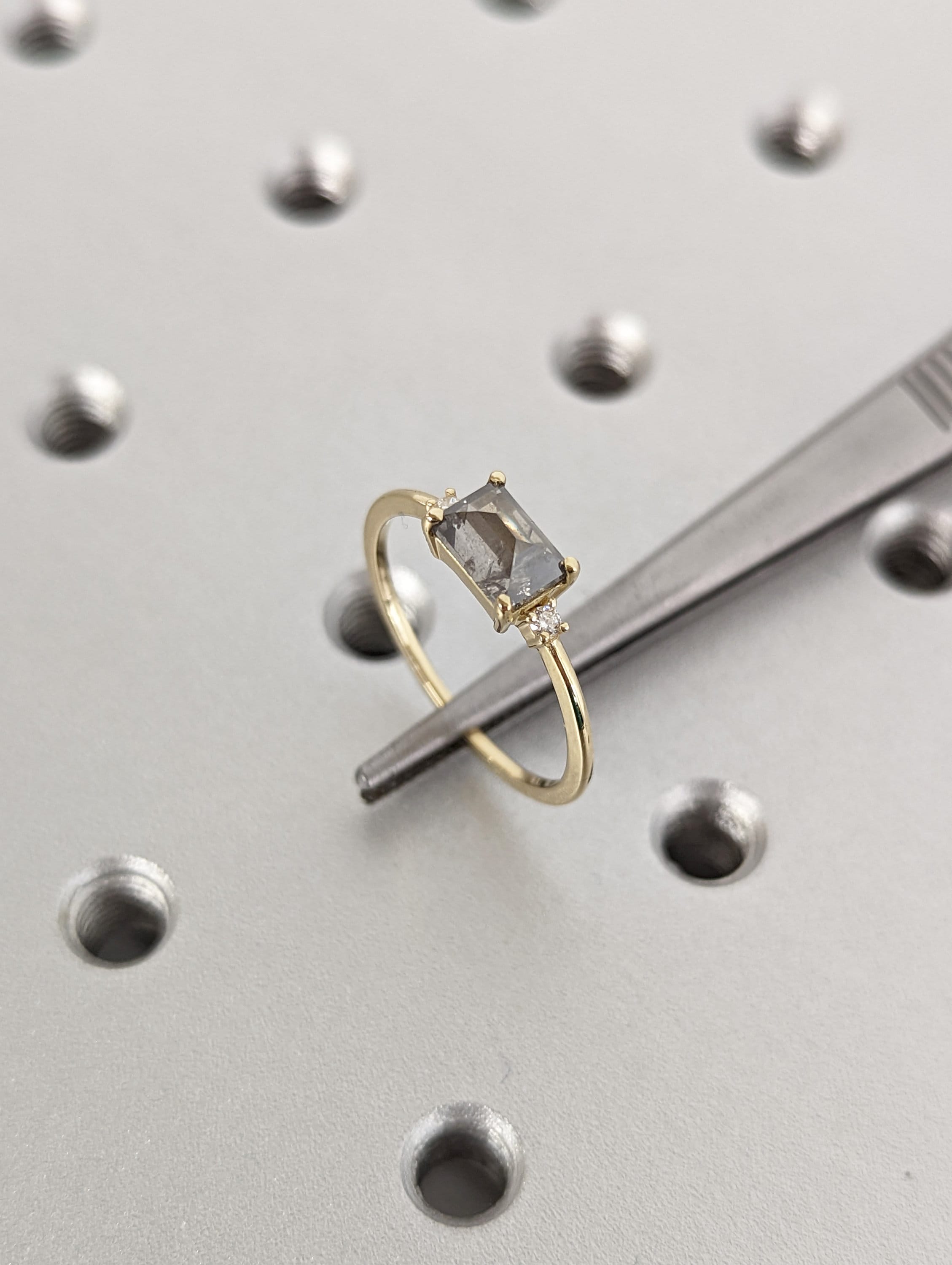 A stunningly beautiful vintage inspired design, petite band with a baguette cut Salt & Pepper diamond, adorned by 2 beautiful diamonds to contrast the center diamond.