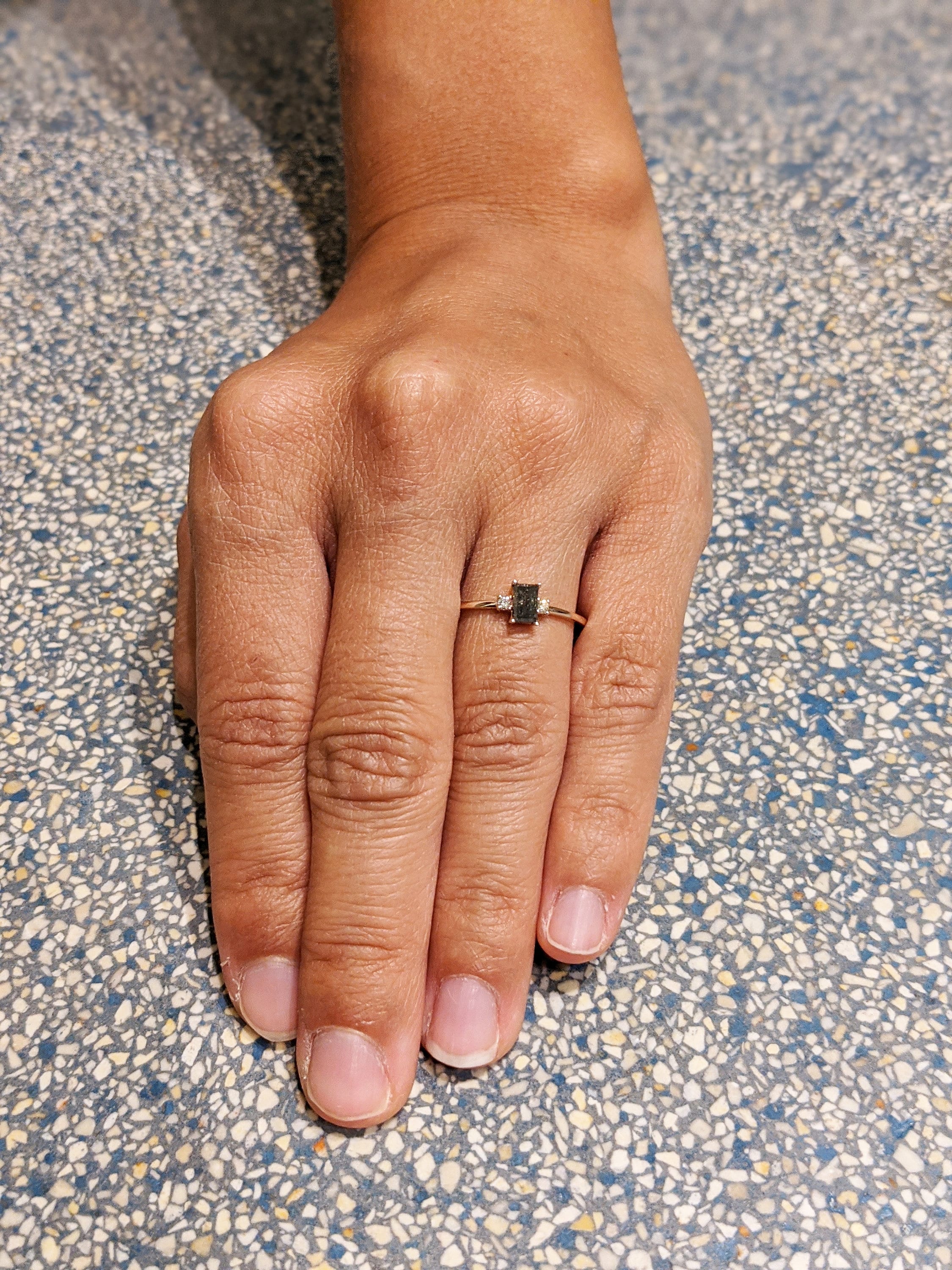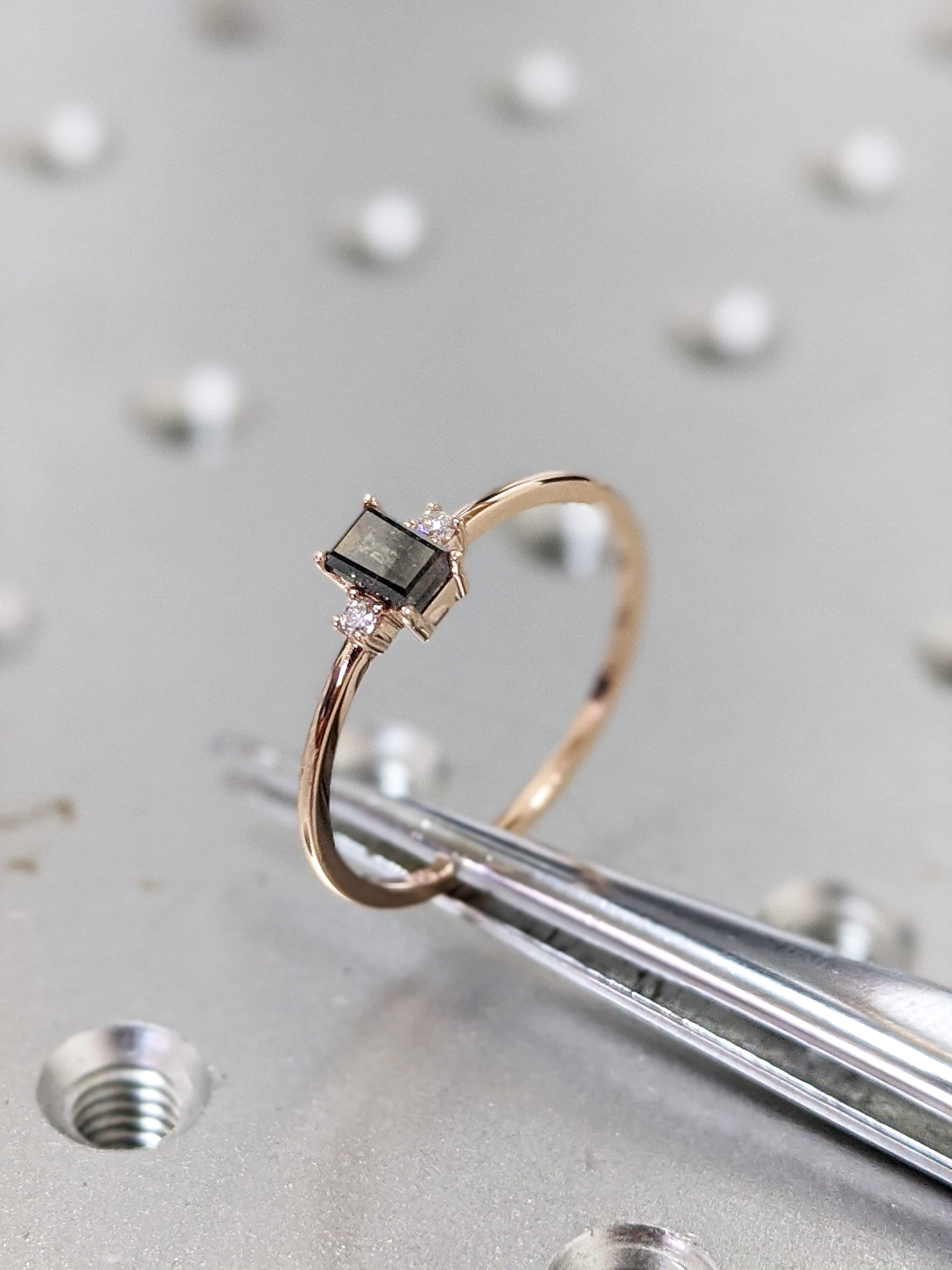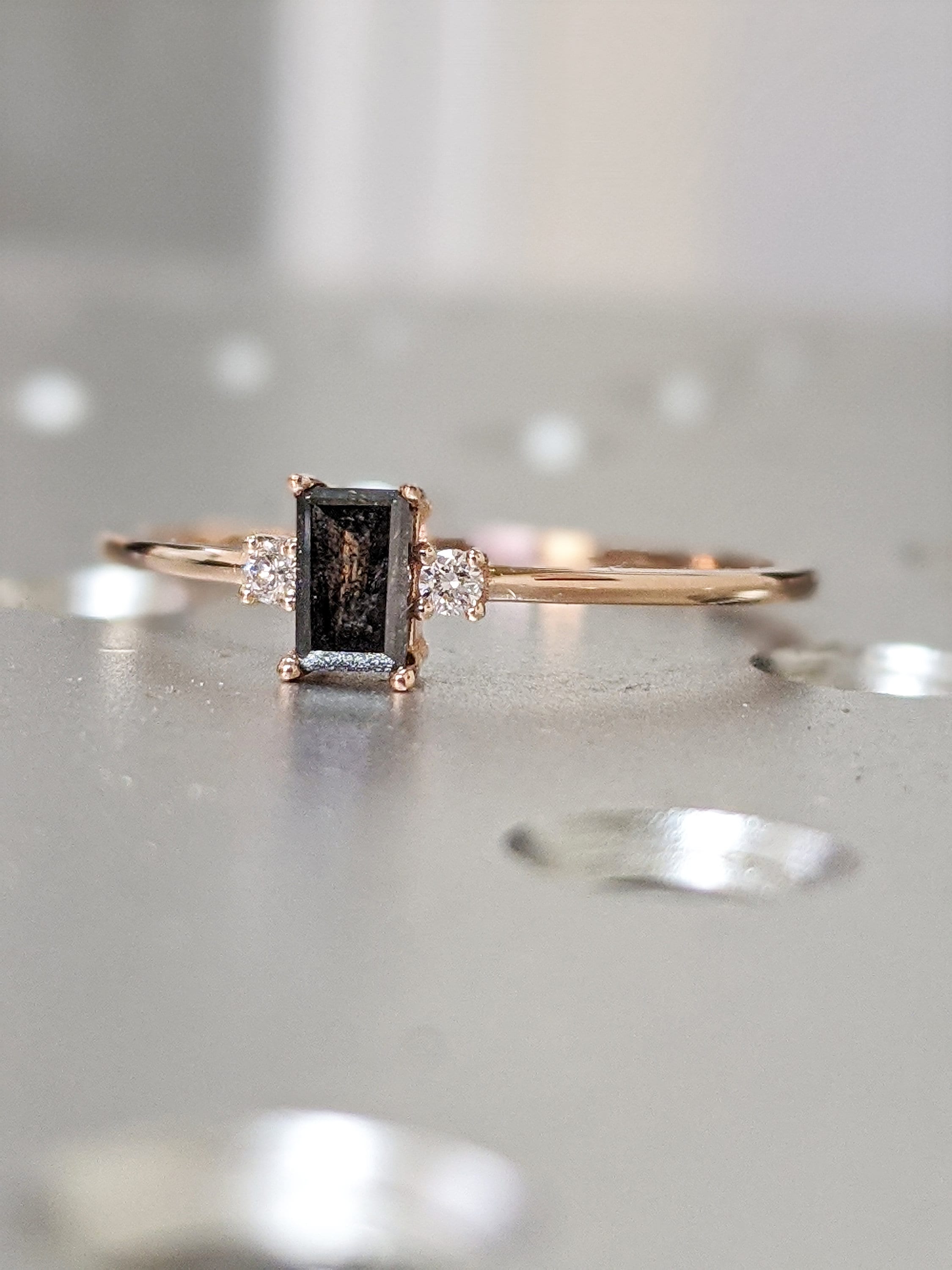 A stunningly beautiful vintage inspired design, petite band with a baguette cut Salt & Pepper diamond, adorned by 2 beautiful diamonds to contrast the center diamond.