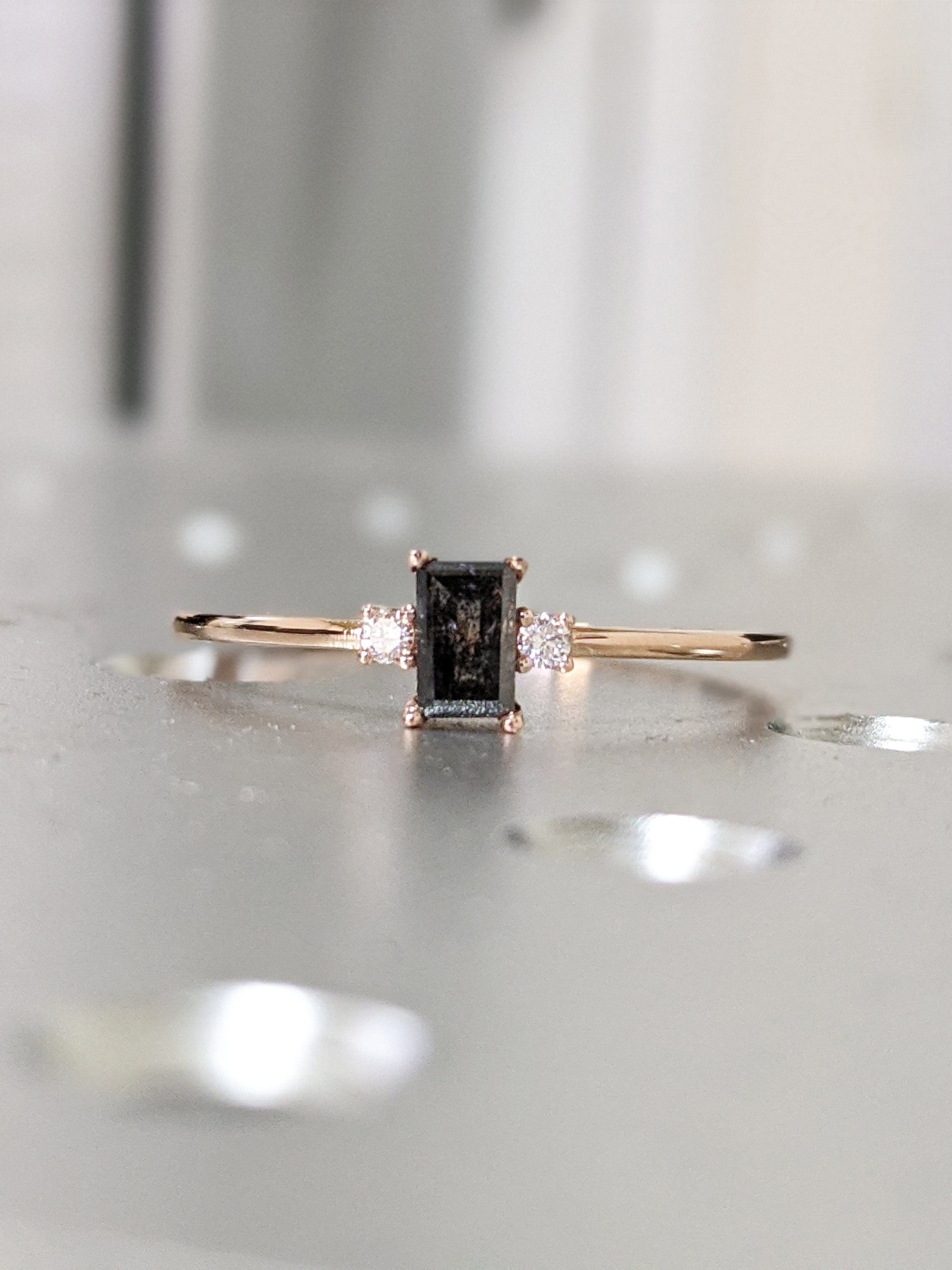 Long Emerald Baguette Raw Salt and Pepper Diamond Gold Engagement Ring Art Deco 1920's Inspired Thin Petite Band 14k Unique Ring for Her