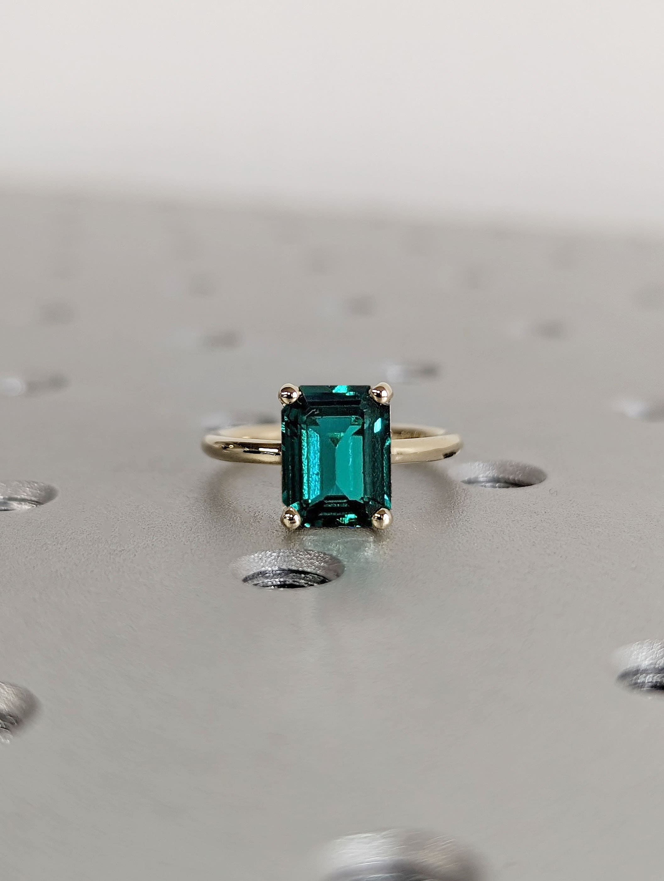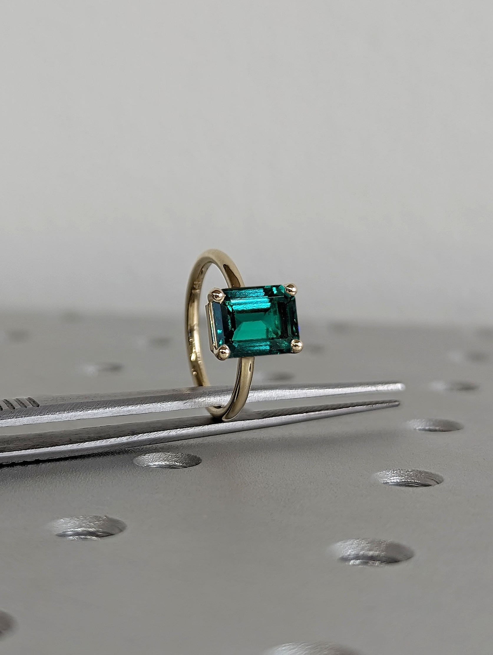 Minimalist and timeless, this statement jewelry features an emerald cut Lab Created Emerald center, with a low profile, open gallery setting on a rounded dainty thin band of 1.8mm width. This solitaire ring dazzles from all angles and wears comfortably, makes it the perfect accessory or gift for any occasion.