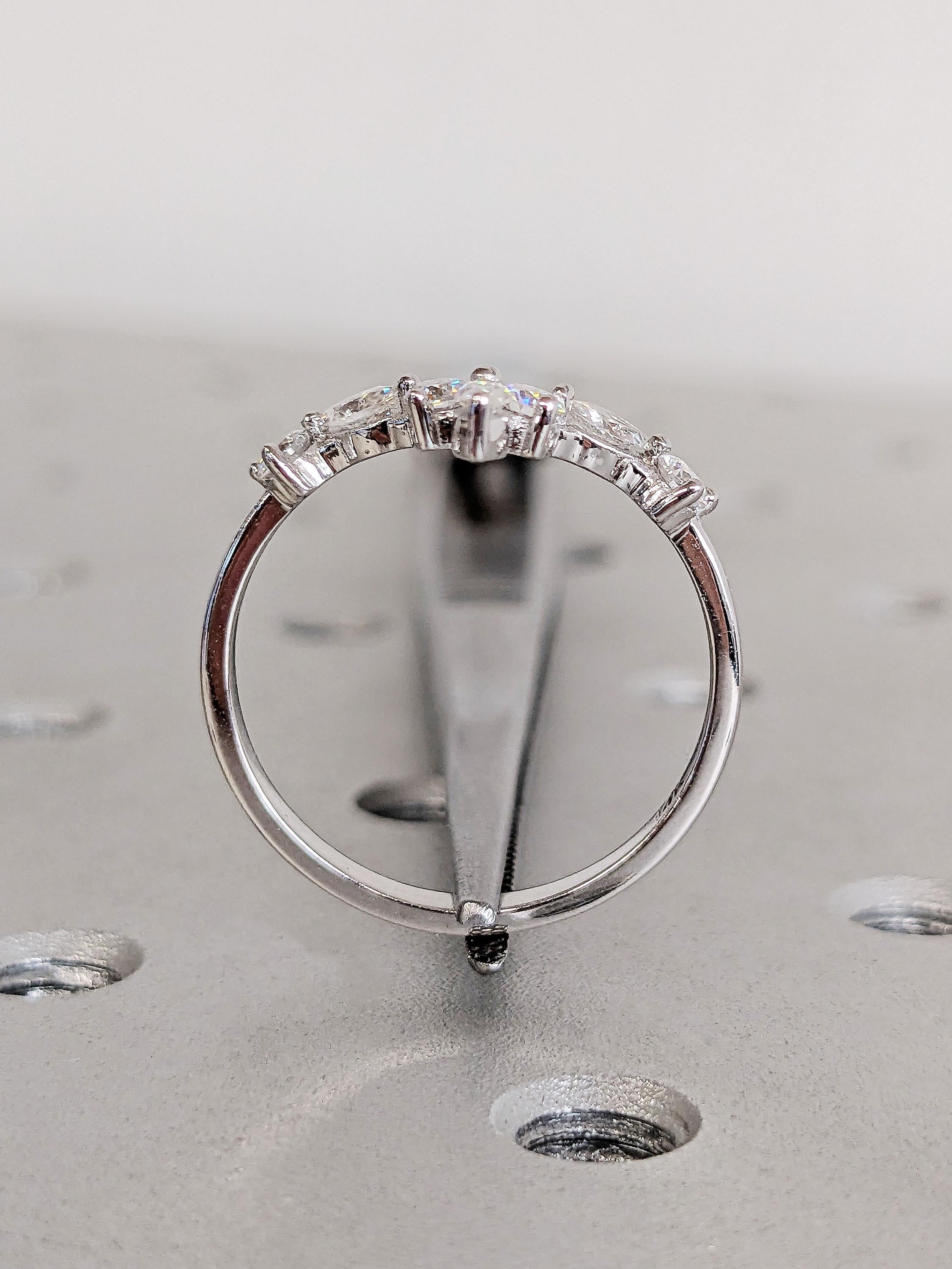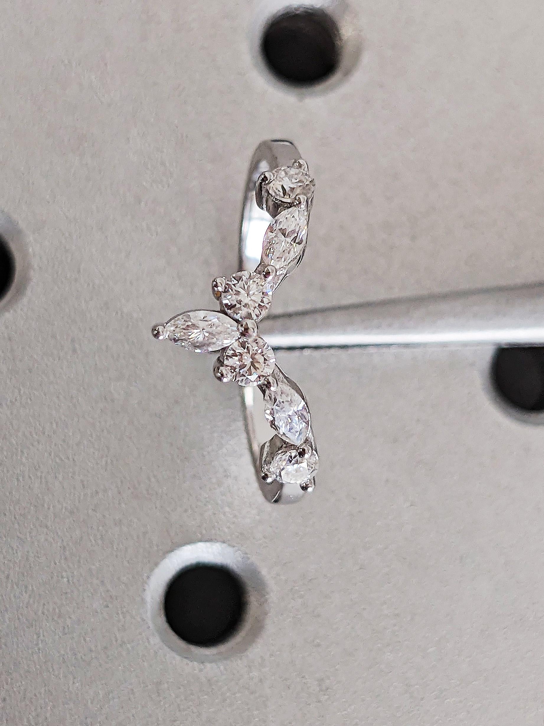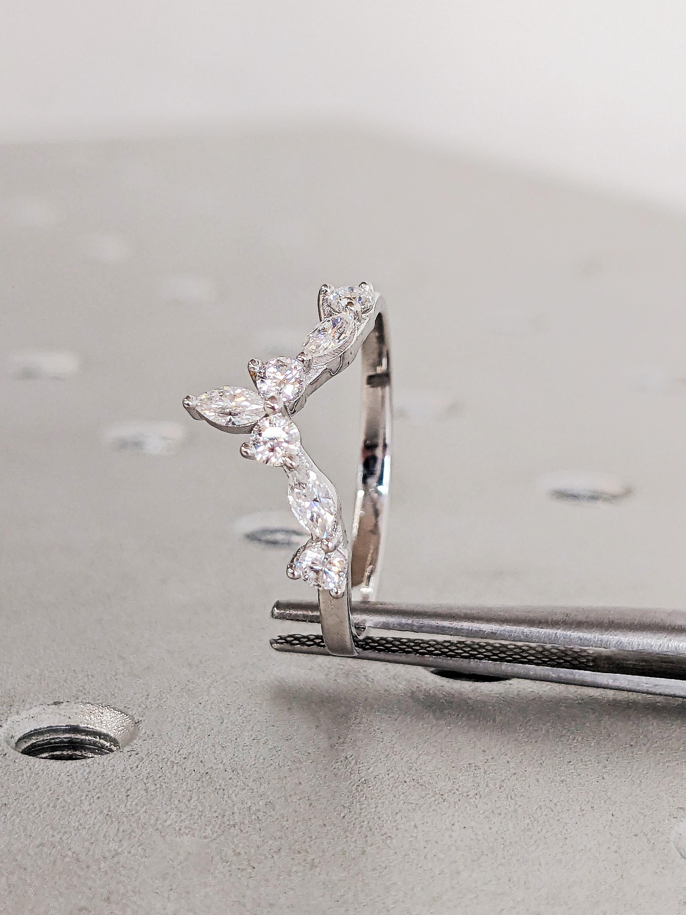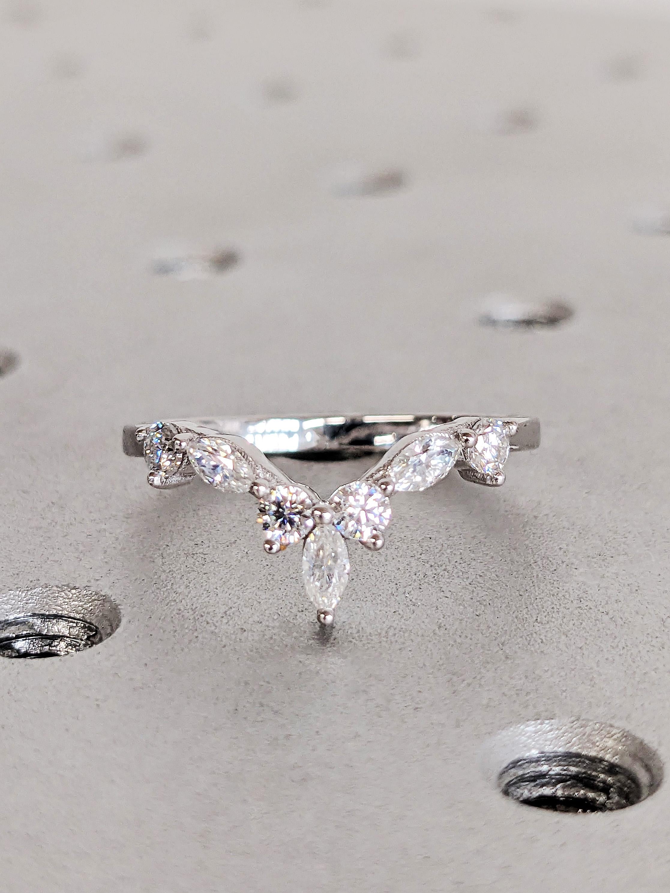 This elegant wedding band features alternating marquise and round cut diamonds, available in Natural Diamond, Lab Diamond or Moissanite, arranged in a graceful V-curved design. Its delicate form pairs beautifully with engagement rings or stands out on its own as a timeless piece.