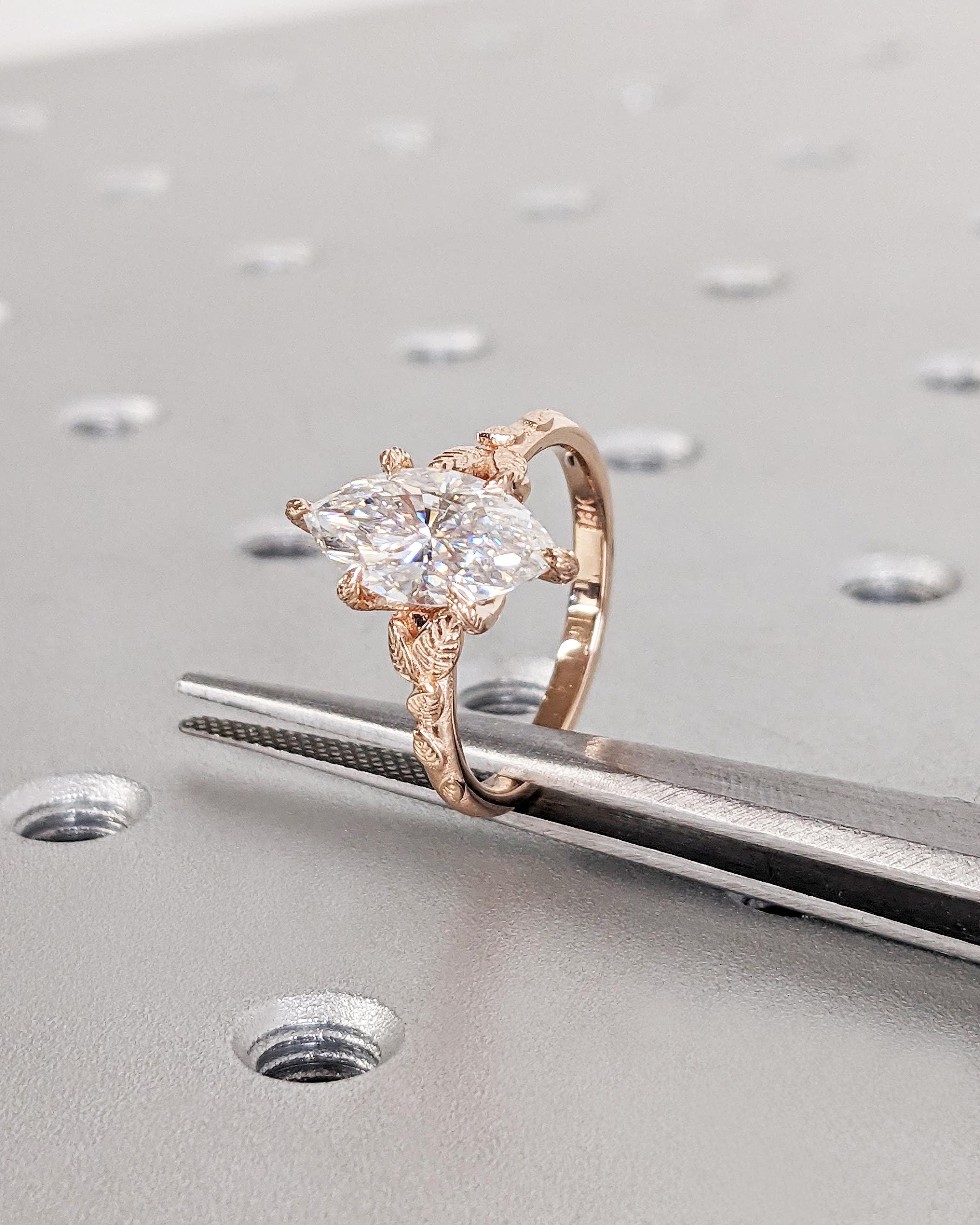 Marquise Cut Nature Engagement Ring, Marquise Moissanite Ring, Solitaire Marquise Engagement Ring, Dainty Leaf Ring, Rose Gold Promise Ring