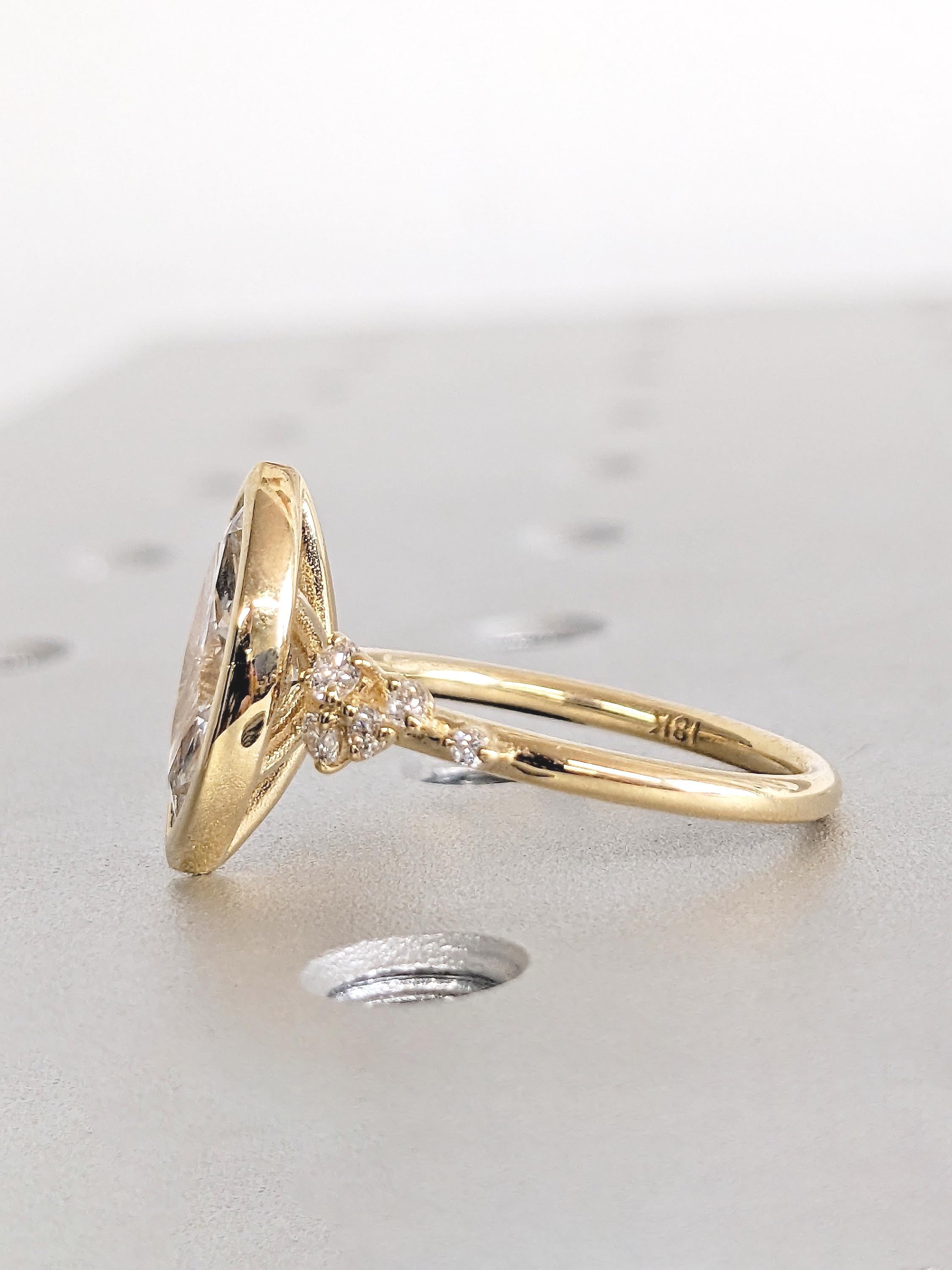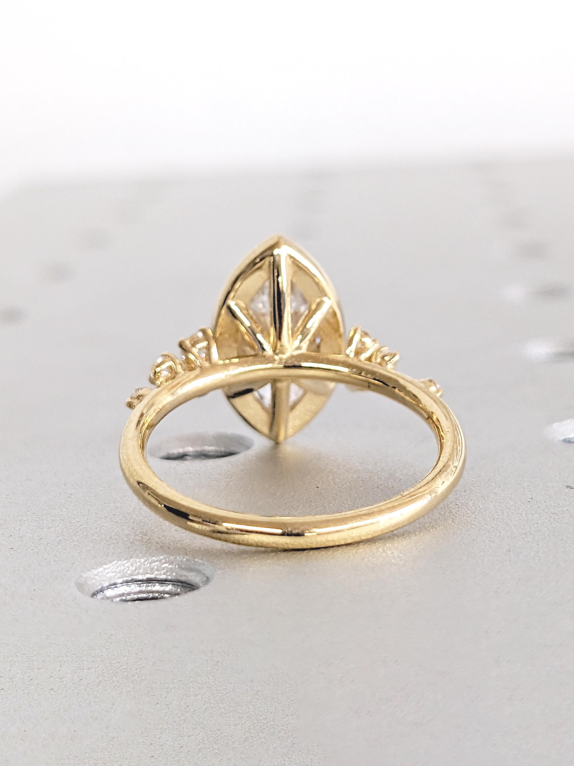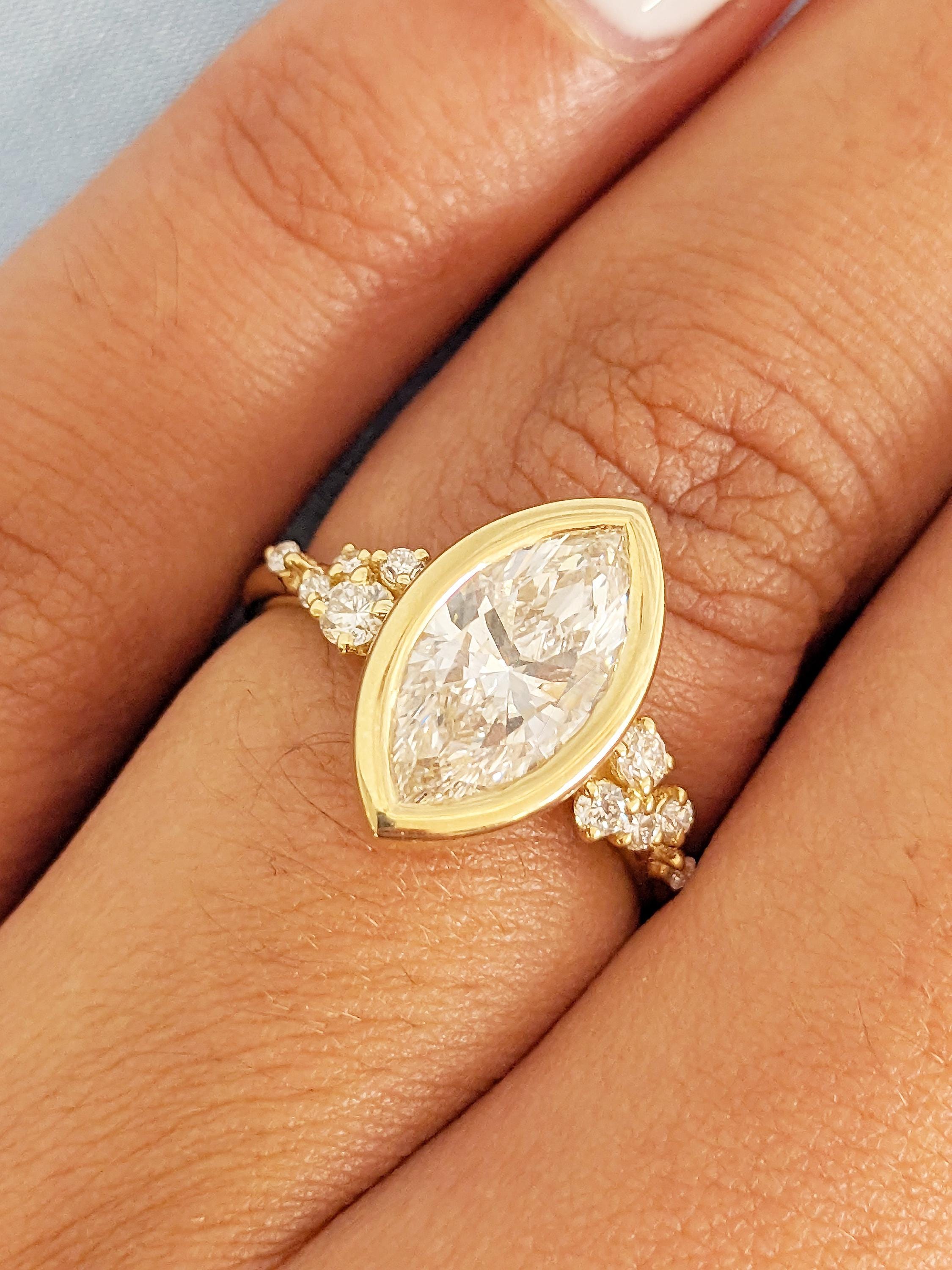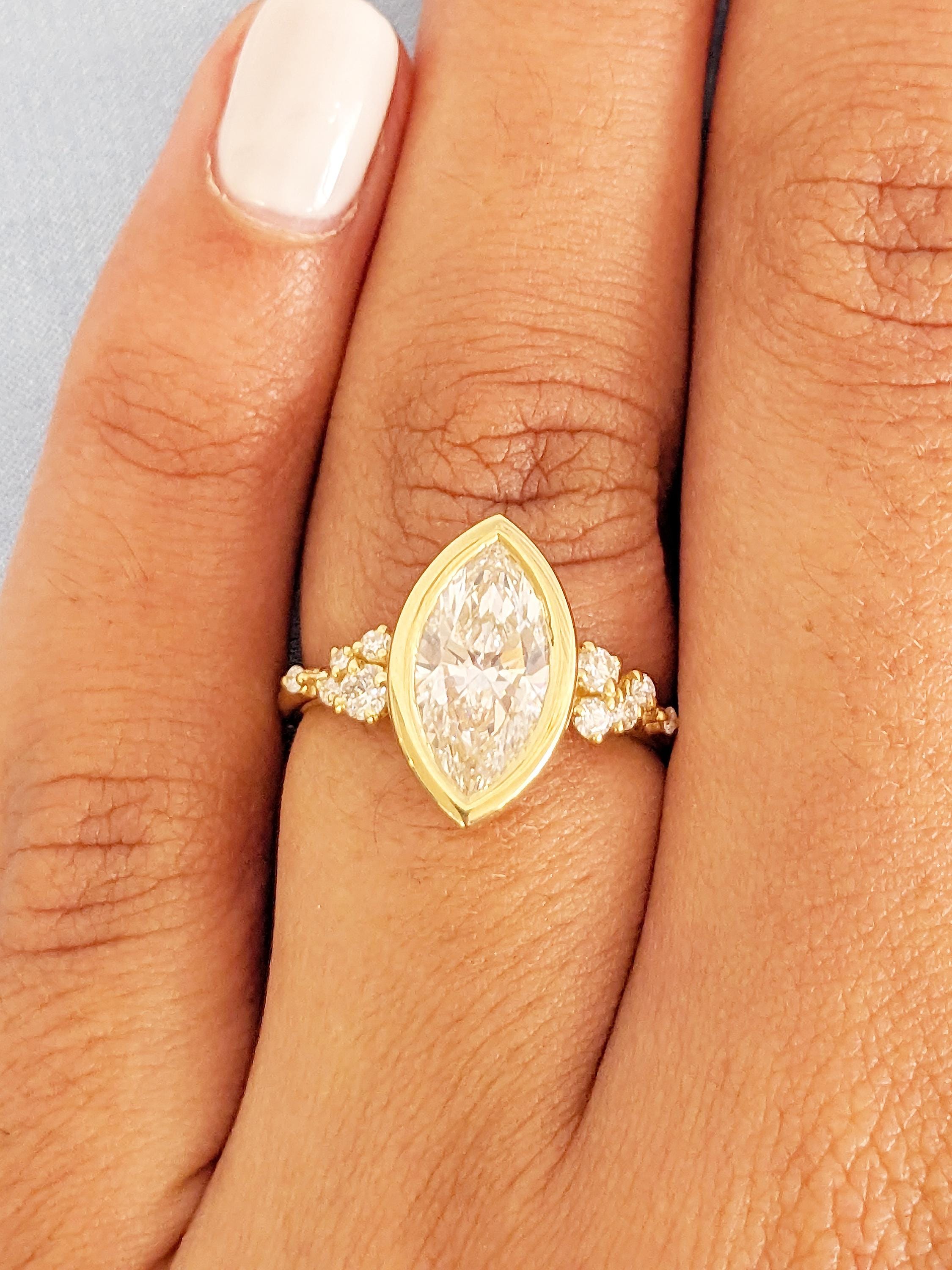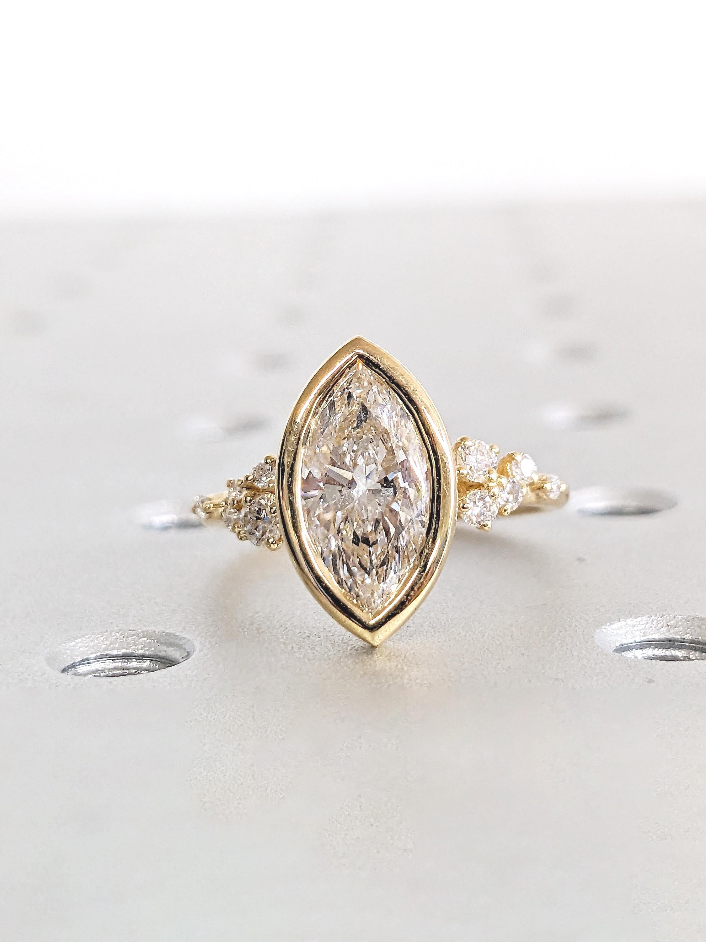 Celebrate the next chapter of your life with our marquise cut Lab Grown Diamond engagement ring in bezel setting. Embraced by delicate snowdrift of Natural Diamonds, Lab Grown Diamonds or Moissanites cluster, sparkling like freshly fallen snow. This finely handcrafted ring is the perfect symbol of your forever love.
