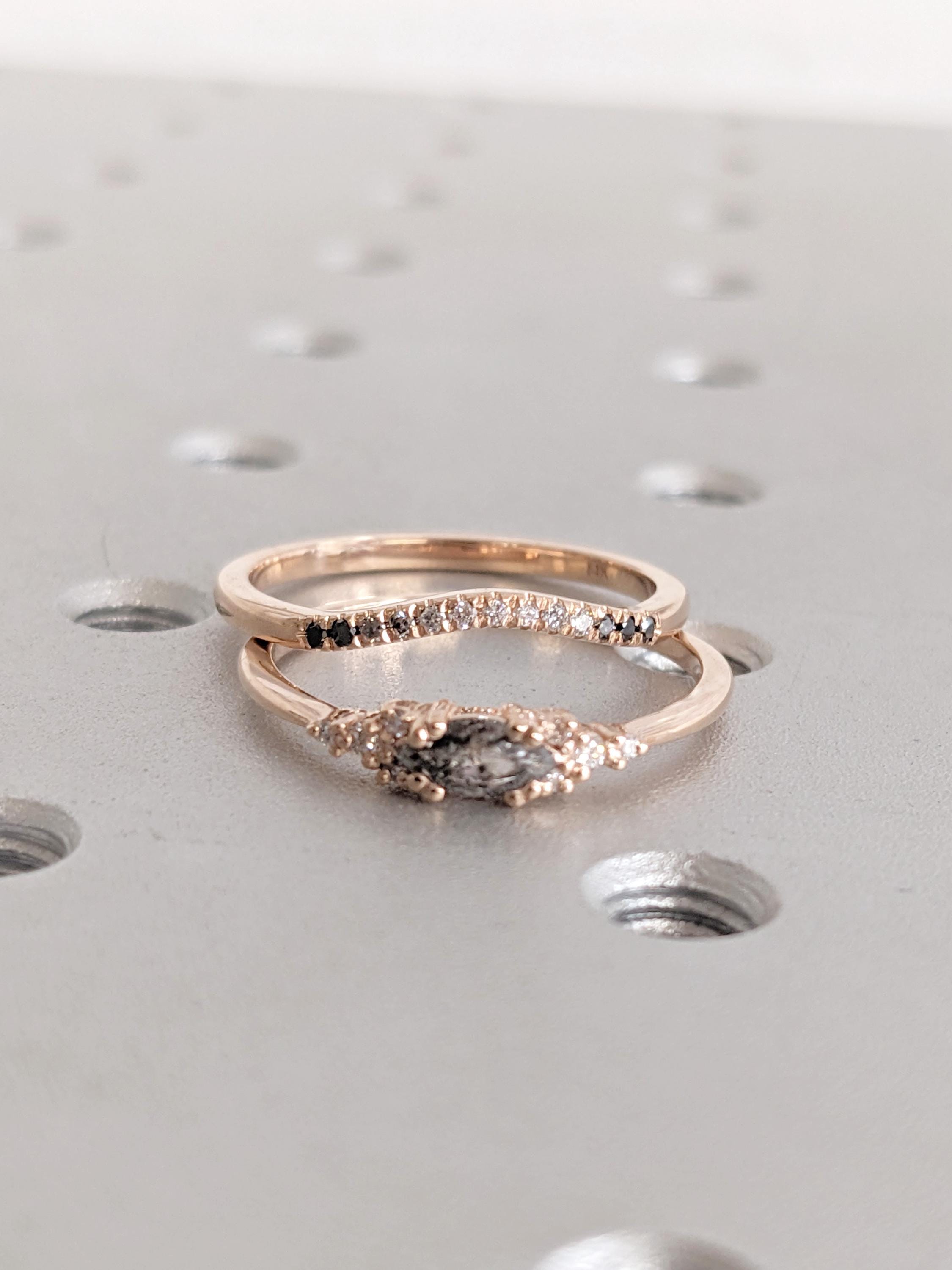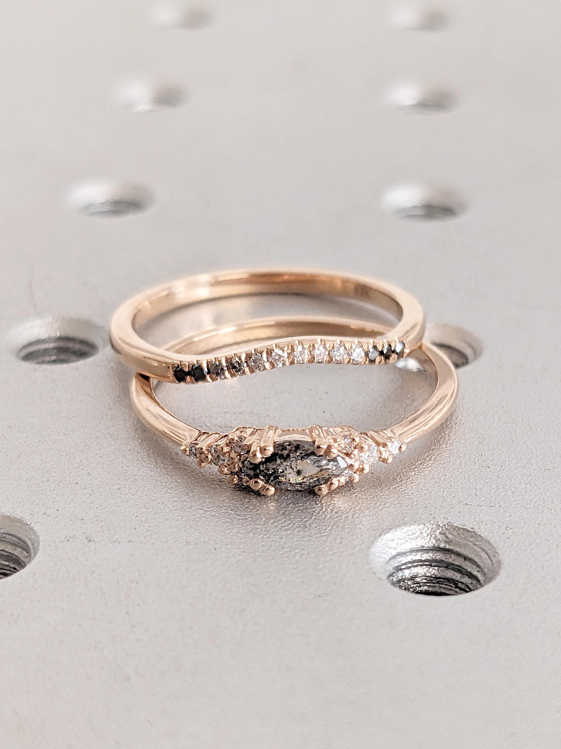 Marquise Cut Salt and Pepper Diamond Wedding Ring Set, 14K Rose Gold Bridal Ring Set