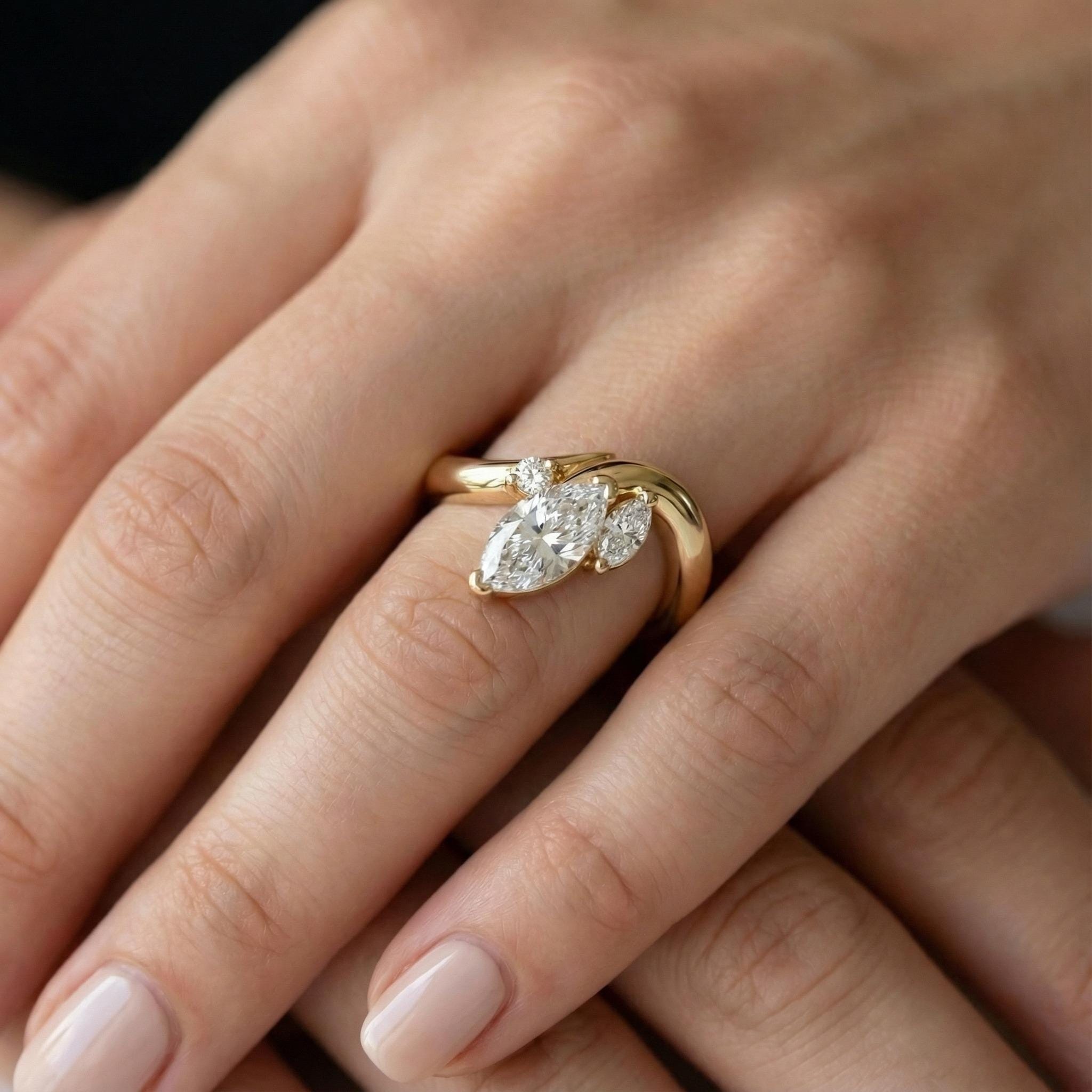 This graceful ring features a striking marquise cut Lab Diamond secured in a minimalist two-prong setting, allowing the center stone to appear light, open, and full of brilliance. Flanking the man made diamond are thoughtfully placed round and marquise cut side stones, adding balance and subtle sparkle while enhancing the elongated silhouette of the center gem.