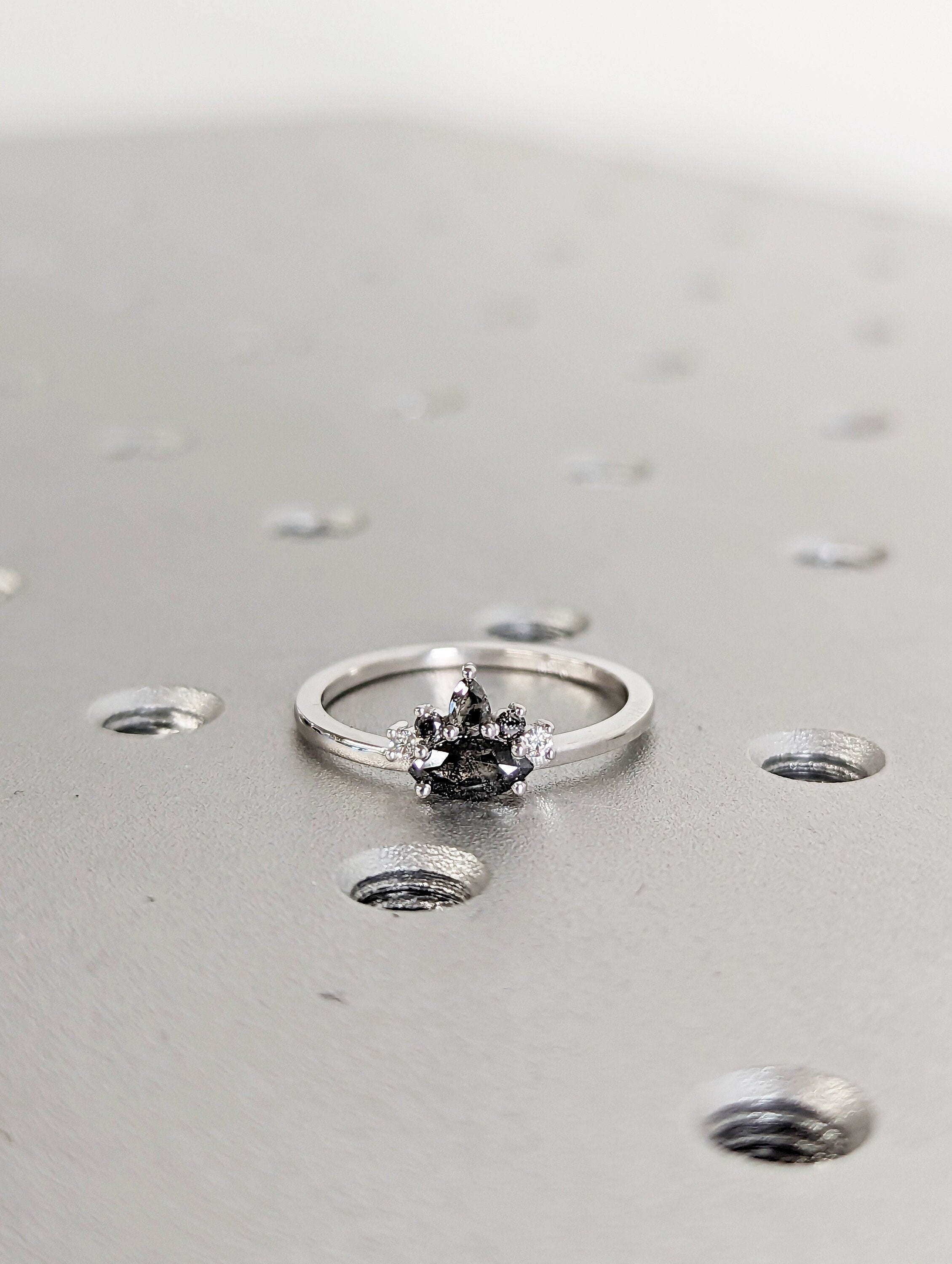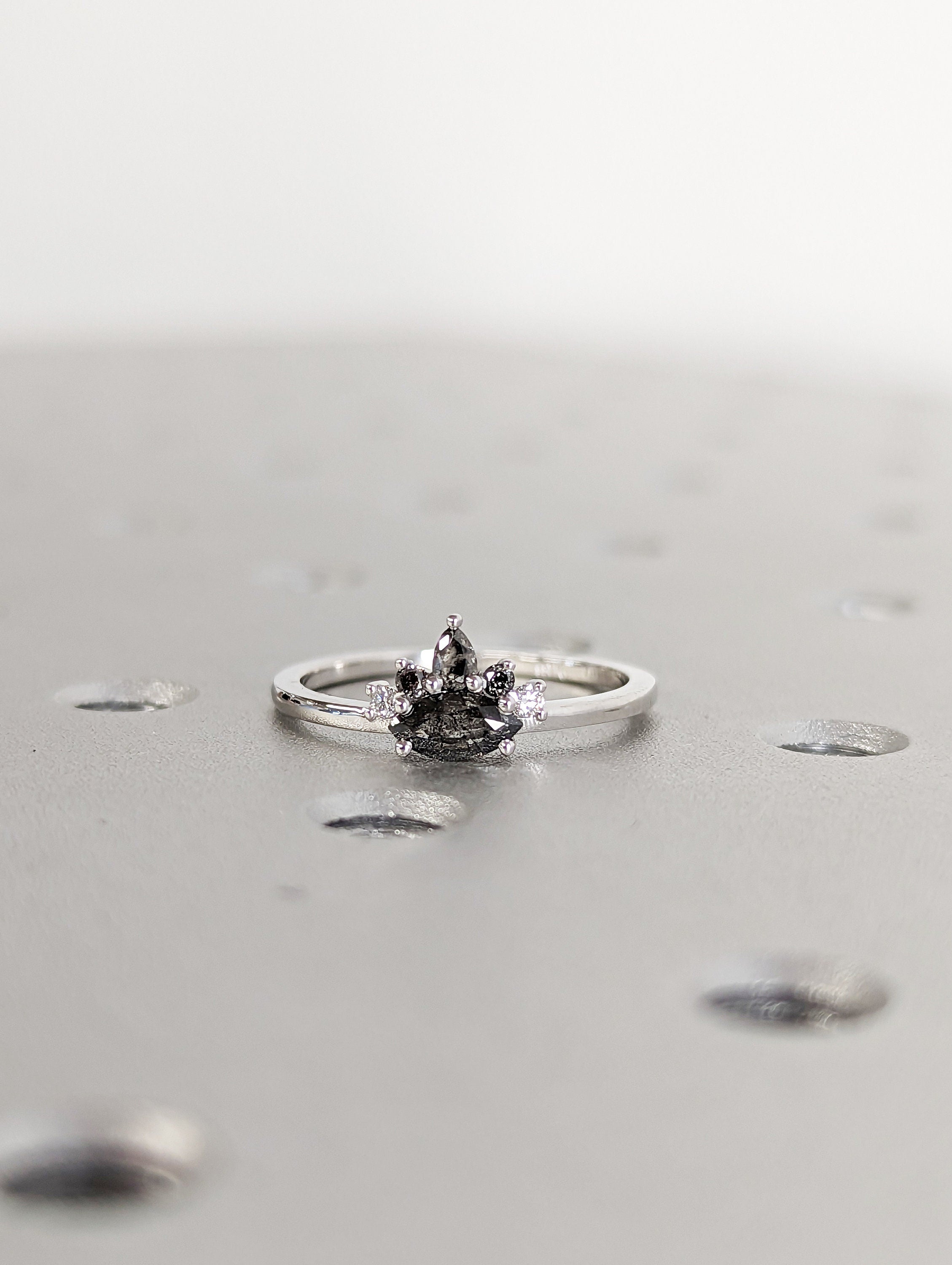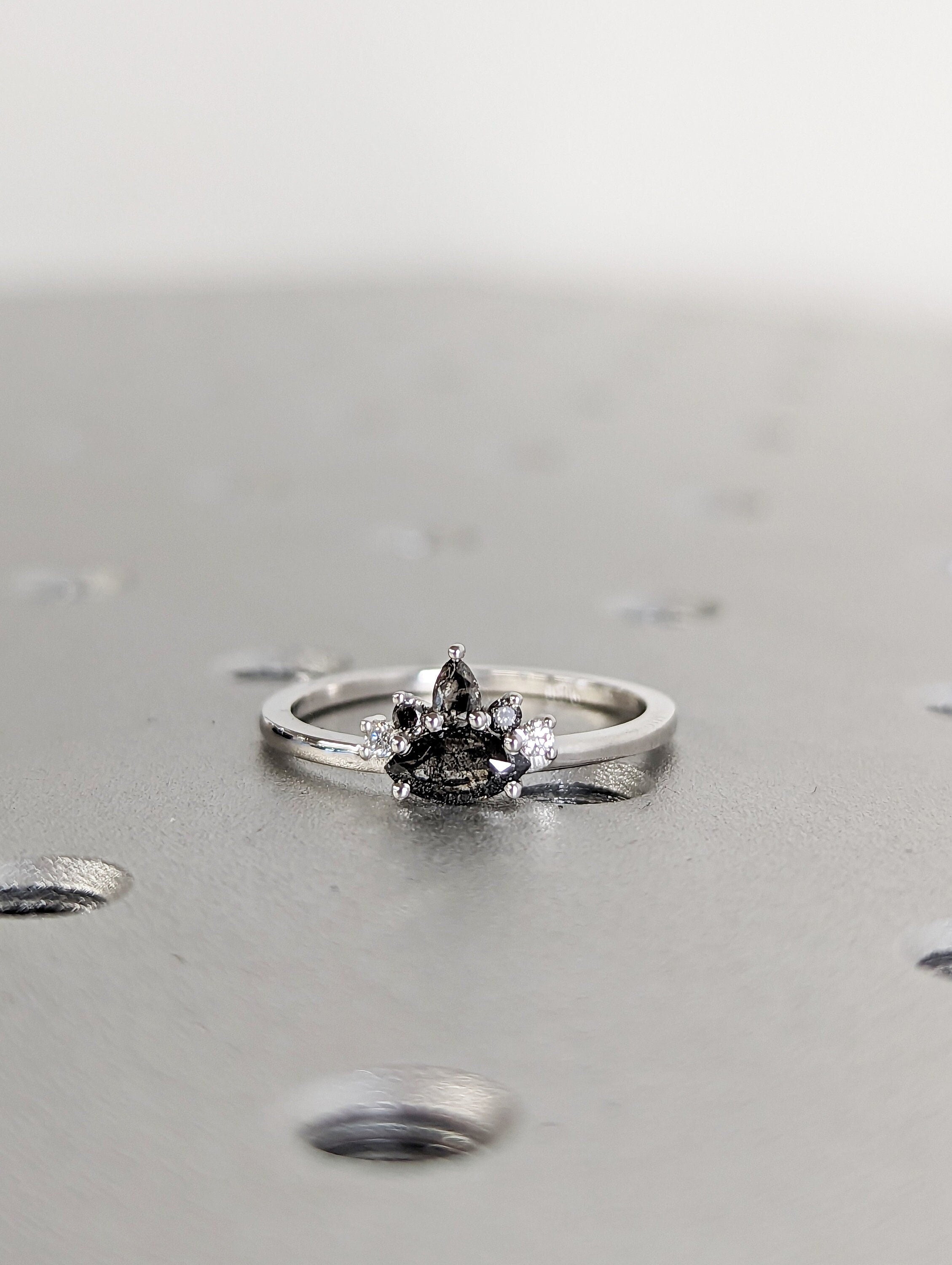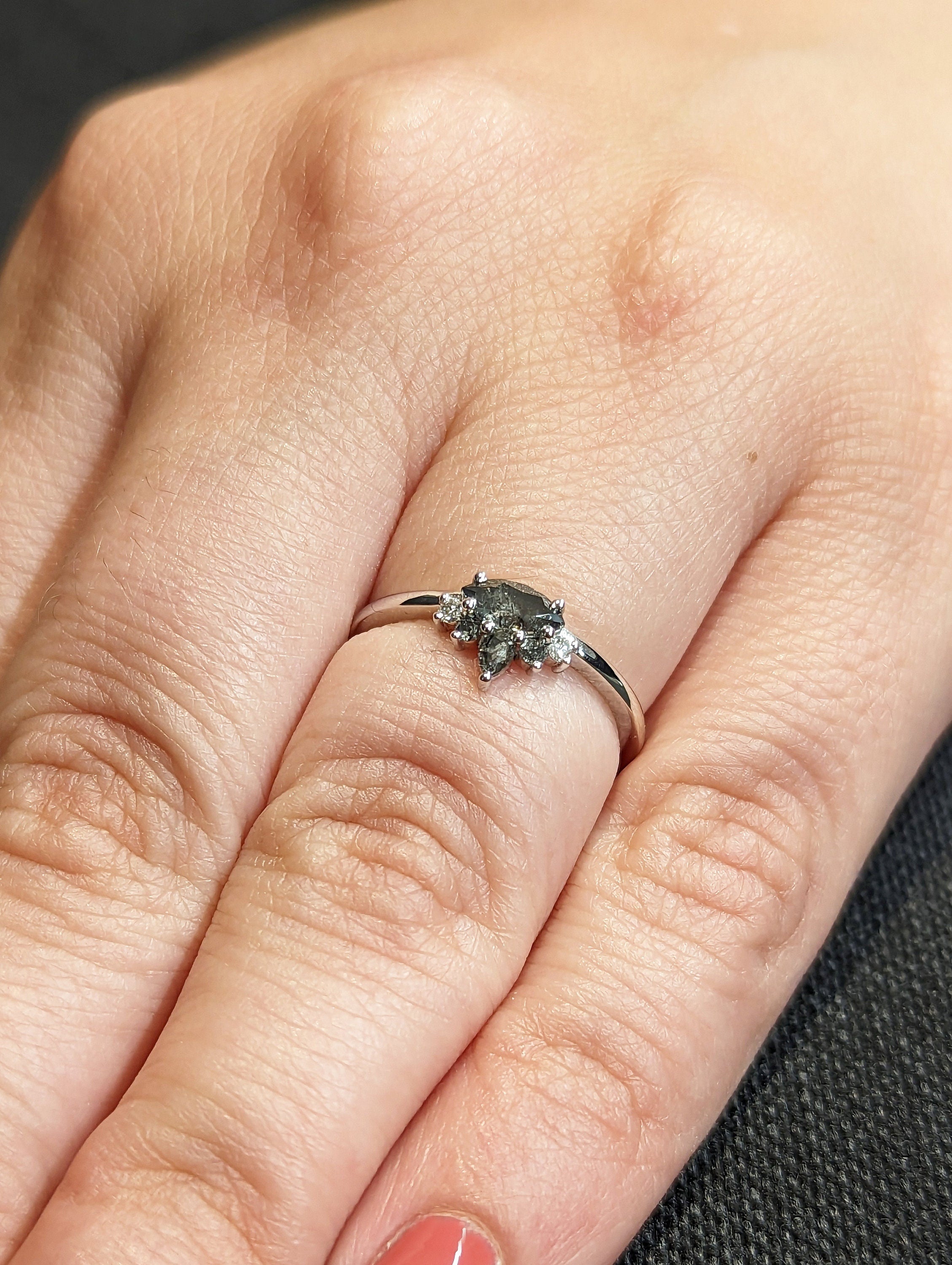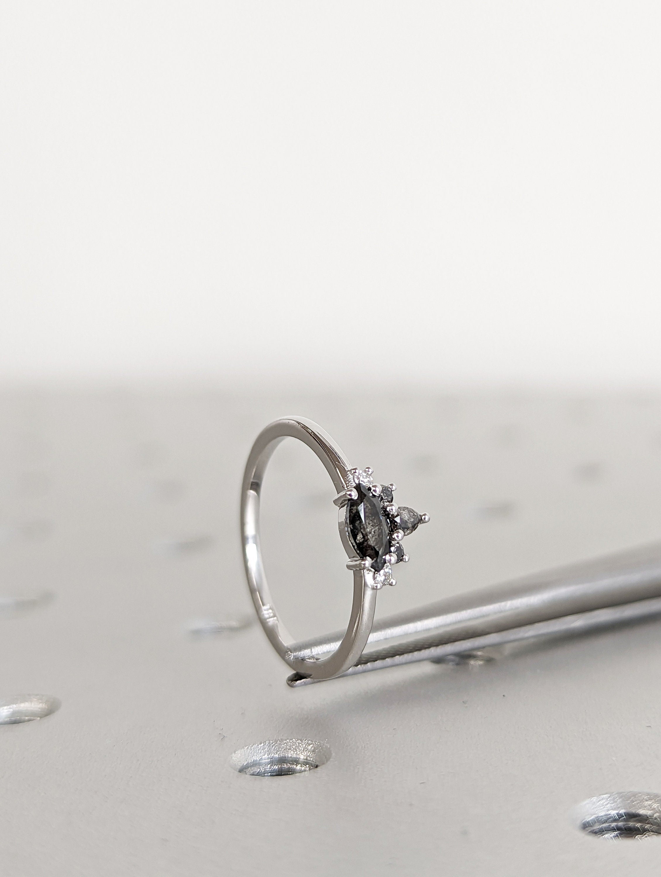 A stunningly beautiful vintage inspired design, petite band with a marquise cut Salt & Pepper diamond, adorned by natural diamonds :)
