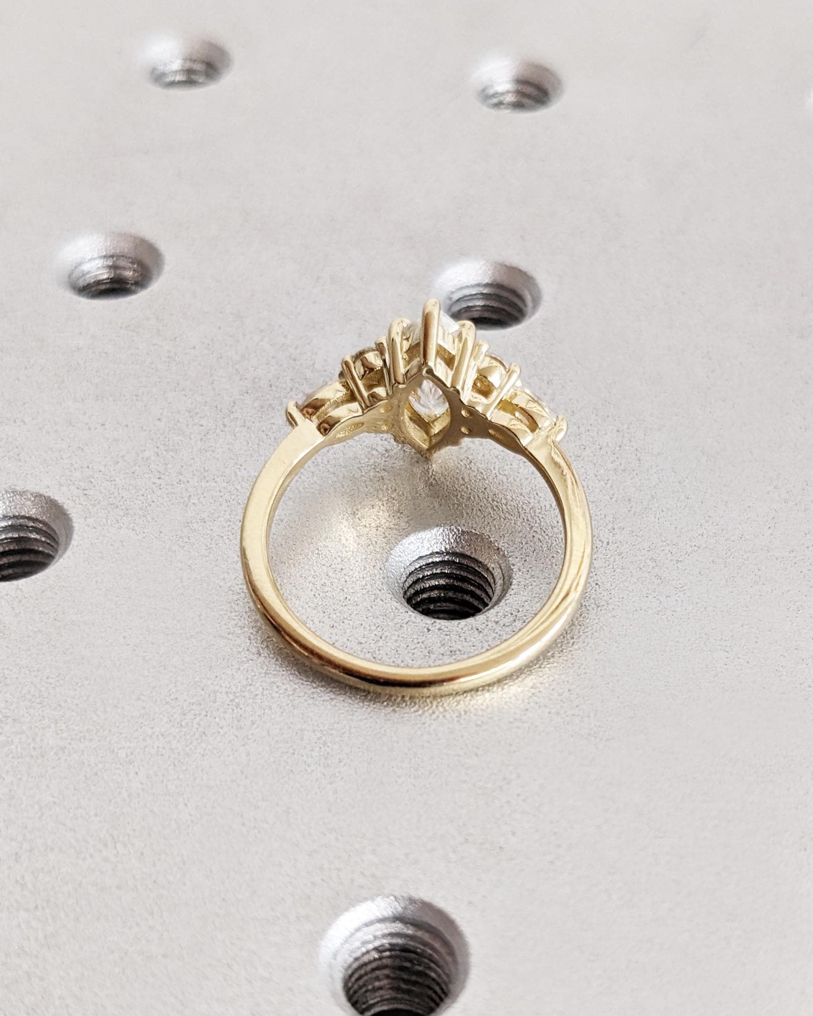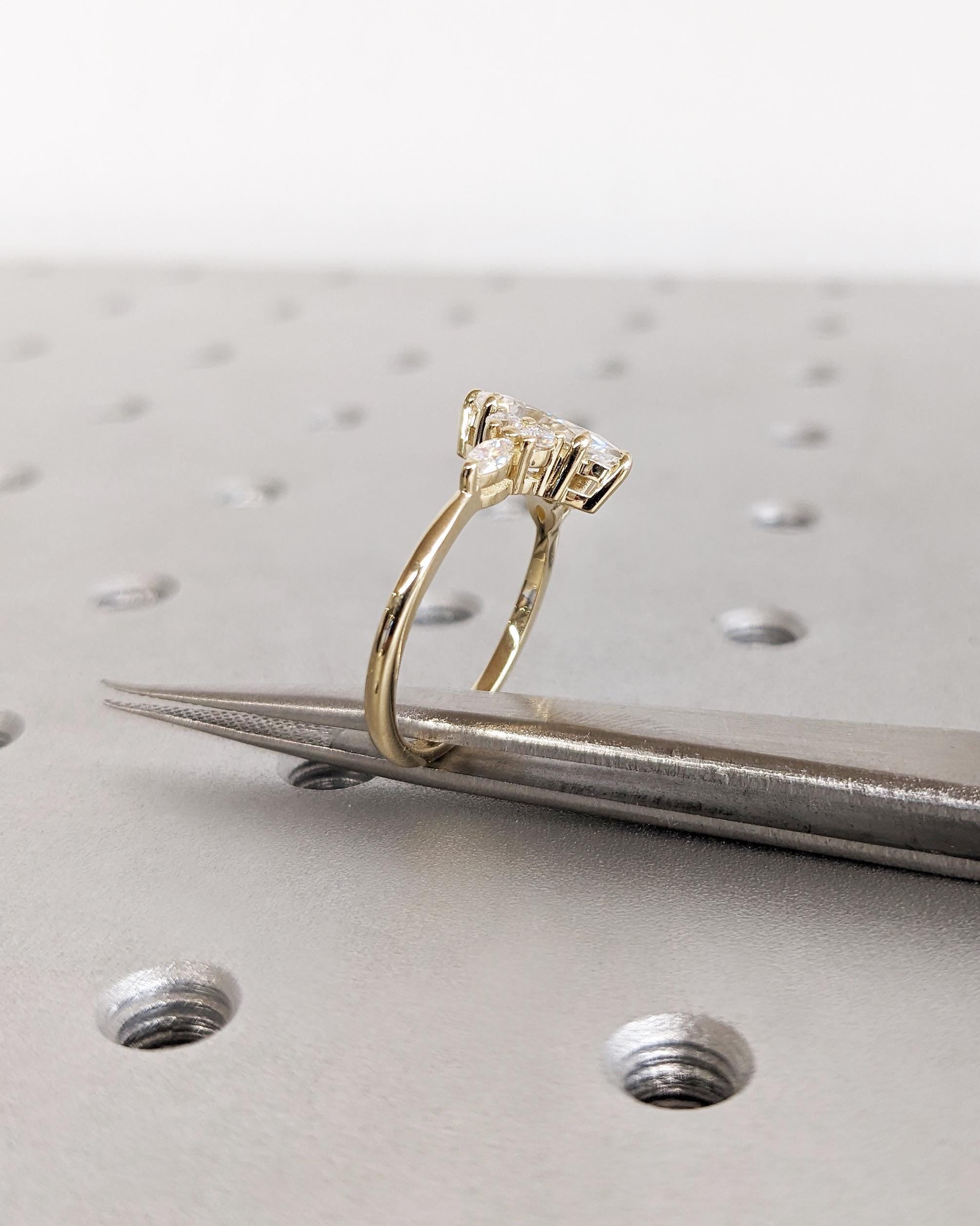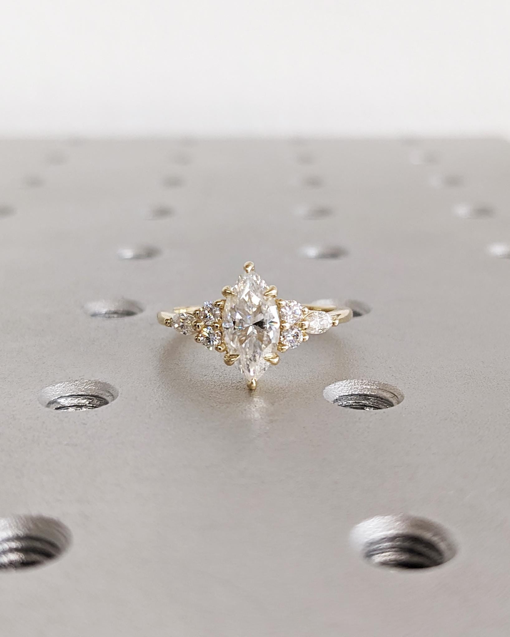 This vintage-inspired marquise cut lab grown diamond engagement ring offers a refined, luminous look. The center stone is enhanced by smaller marquise and round accents for a bright, eye-catching sparkle. Select natural diamond, lab diamond, or moissanite for the side stones. A clean, classic choice for a lifelong treasure.