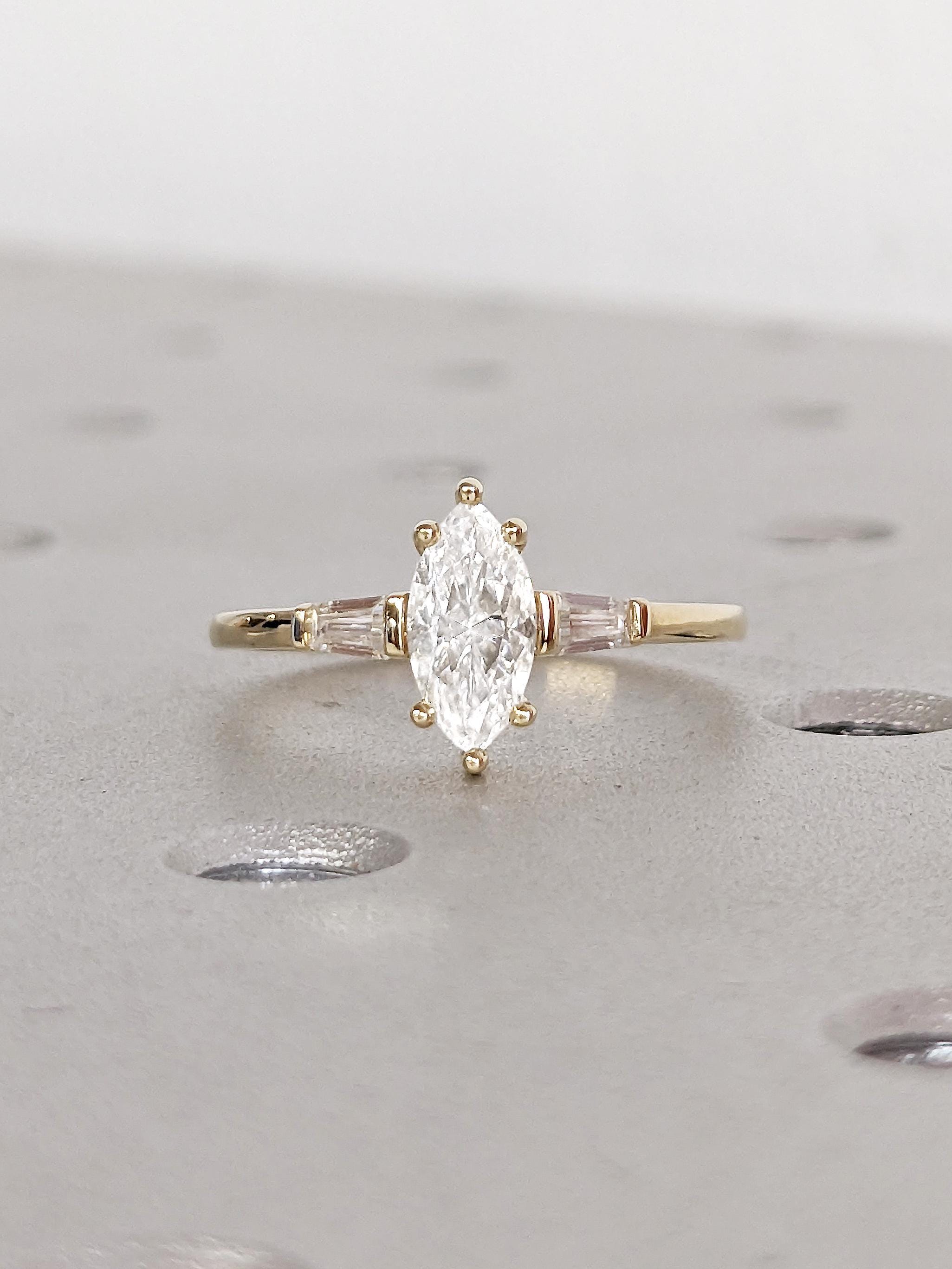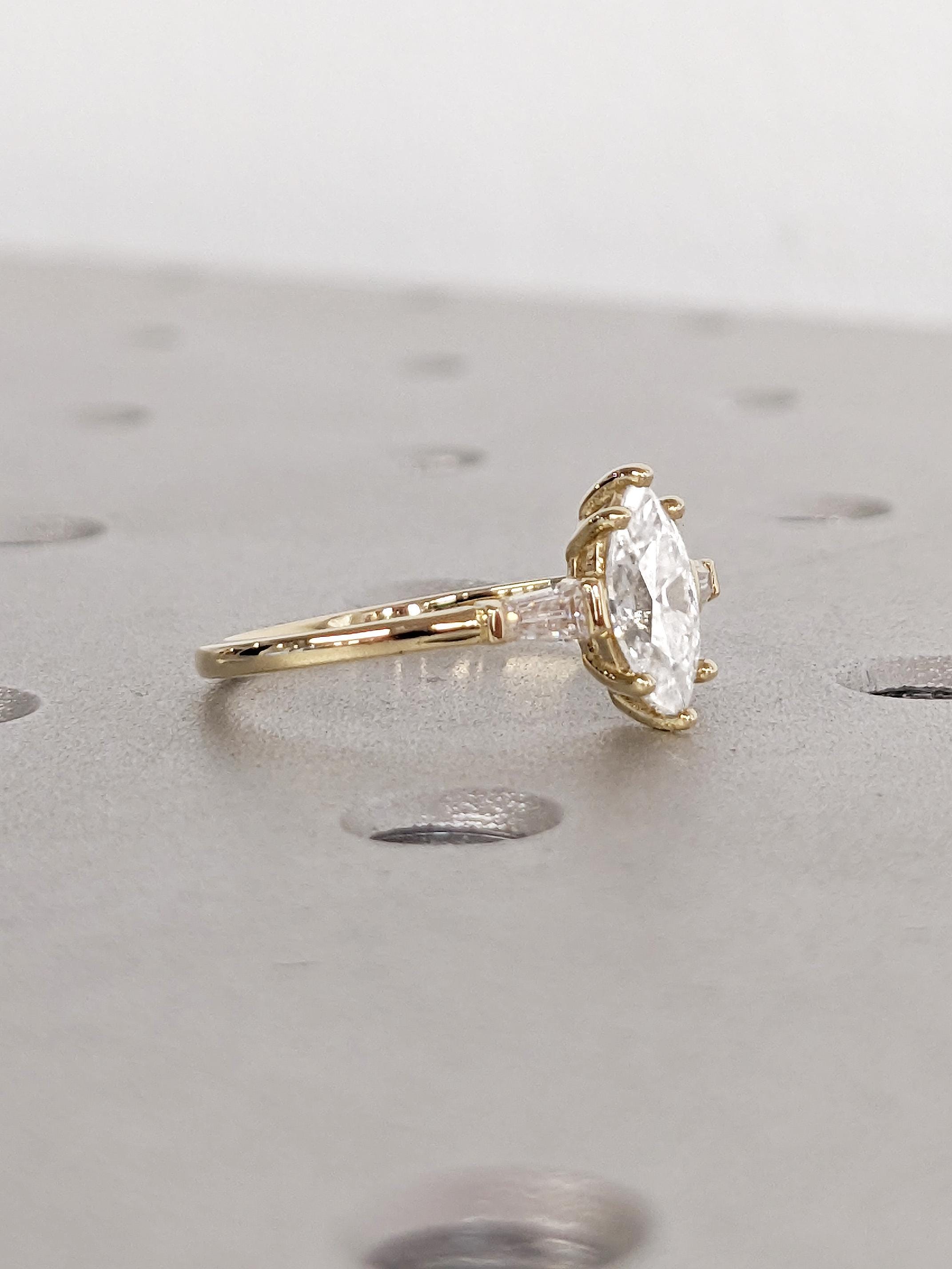 Marquise Engagement Ring, Moissanite Rings for Women, 14k Yellow Gold Statement Ring, Unique Wedding Ring, Art Deco Tapered Baguette Ring