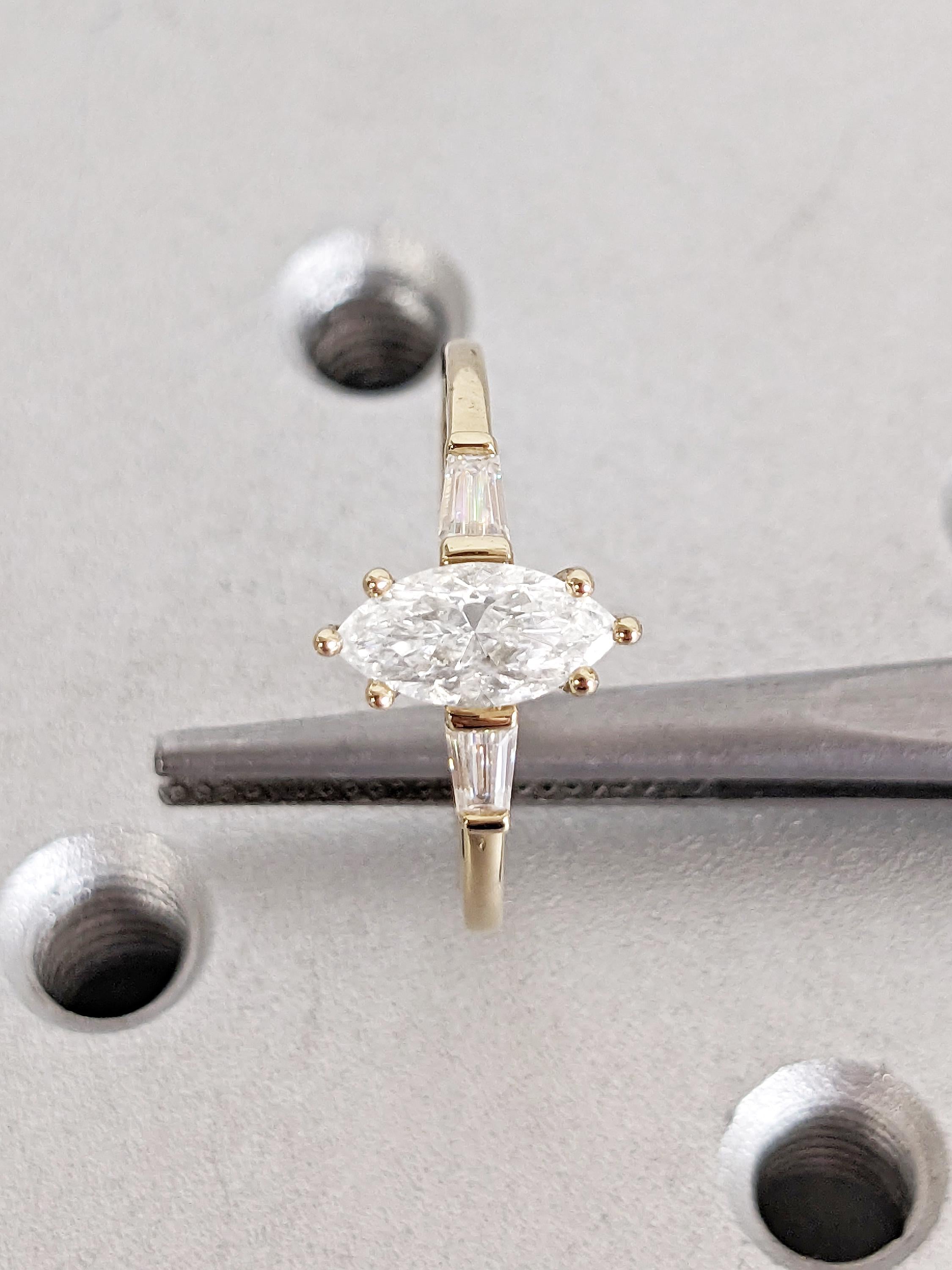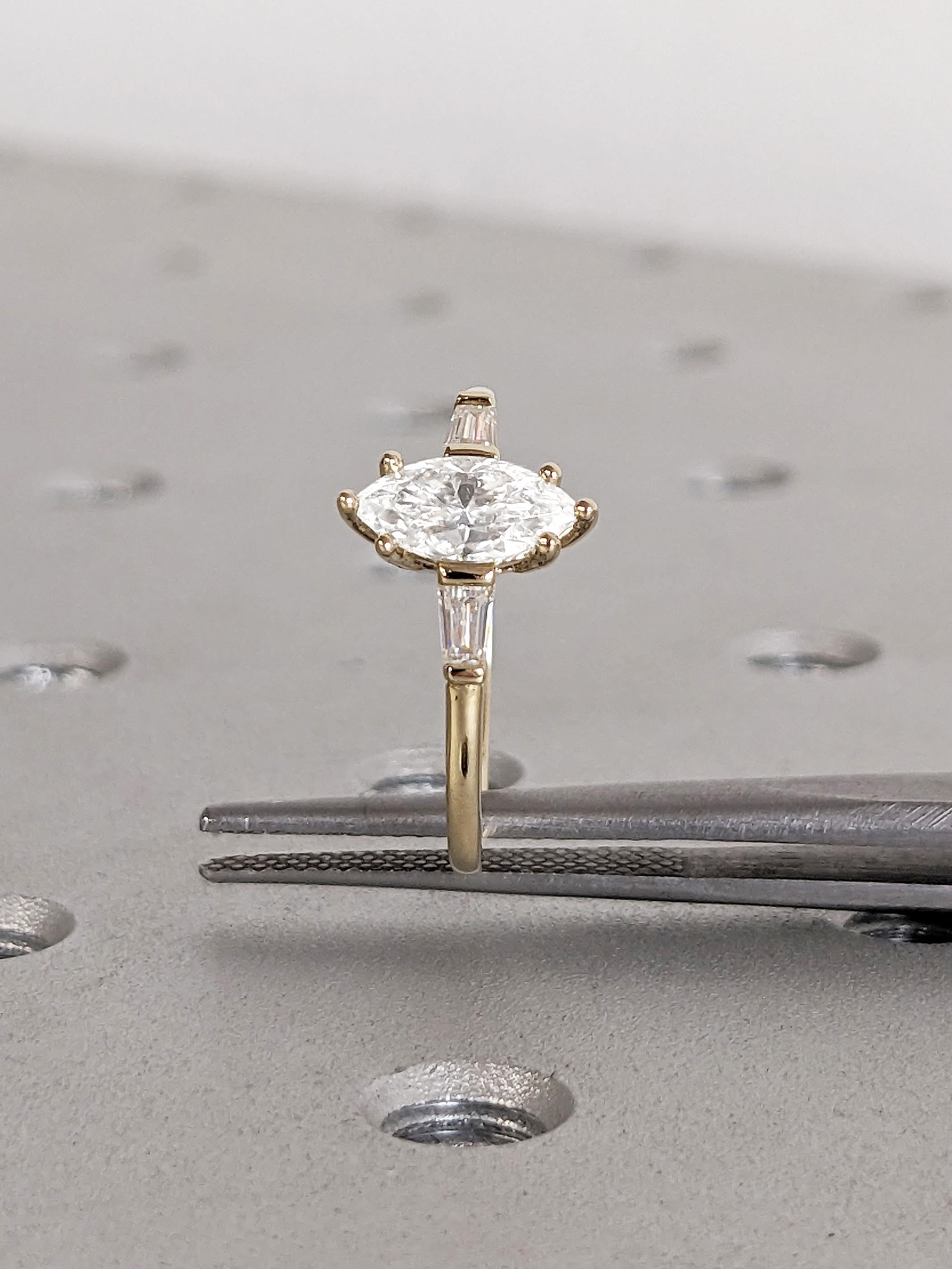 This exquisite engagement ring showcases a stunning marquise cut Moissanite at its center. Flanking each side, tapered baguette cut stones add a touch of sophistication and symmetry, available in your choice of dazzling Natural Diamonds or Moissanites. Set on a lustrous gold band, this timeless piece blends classic beauty with modern sophistication, making it a perfect symbol of love and commitment.