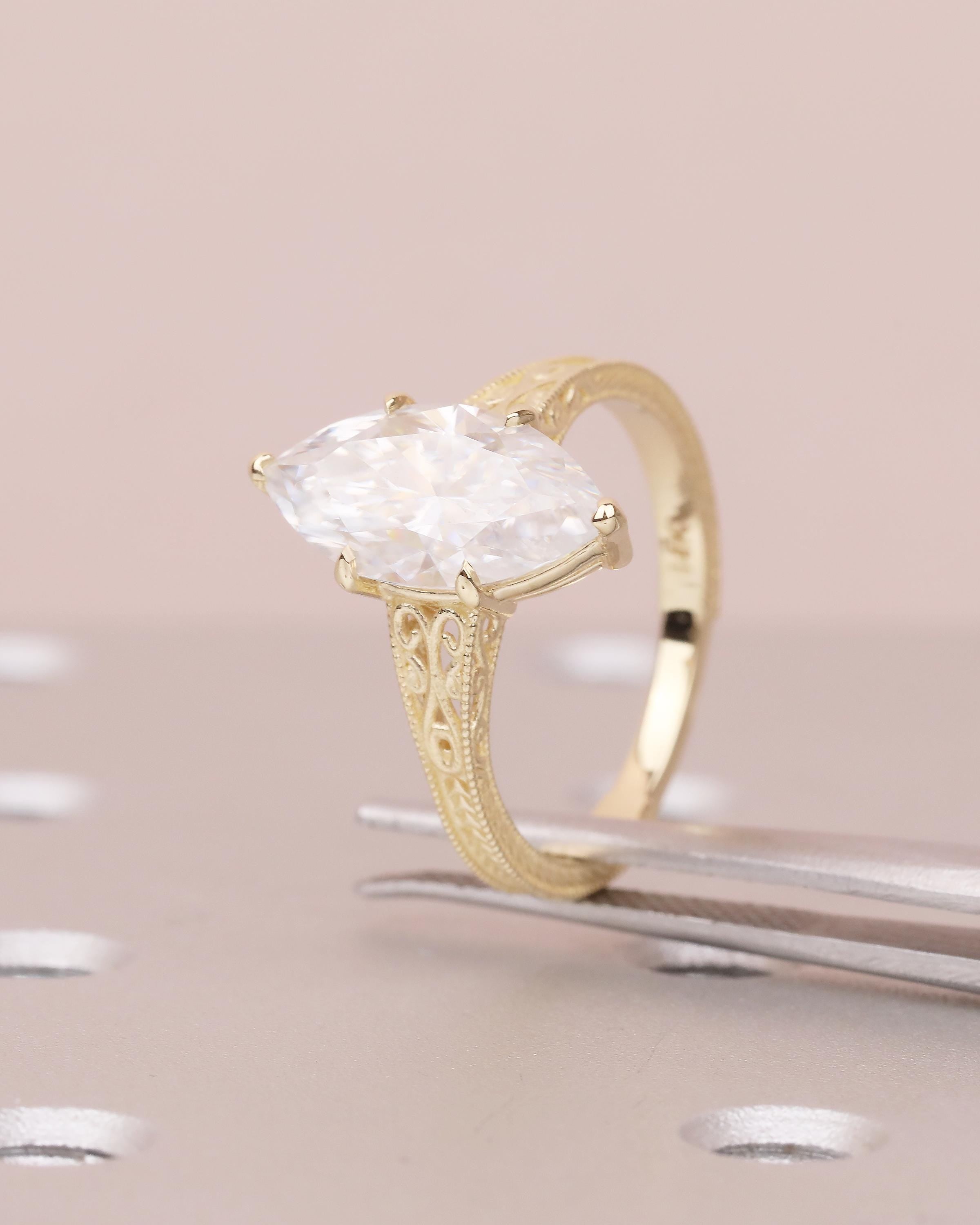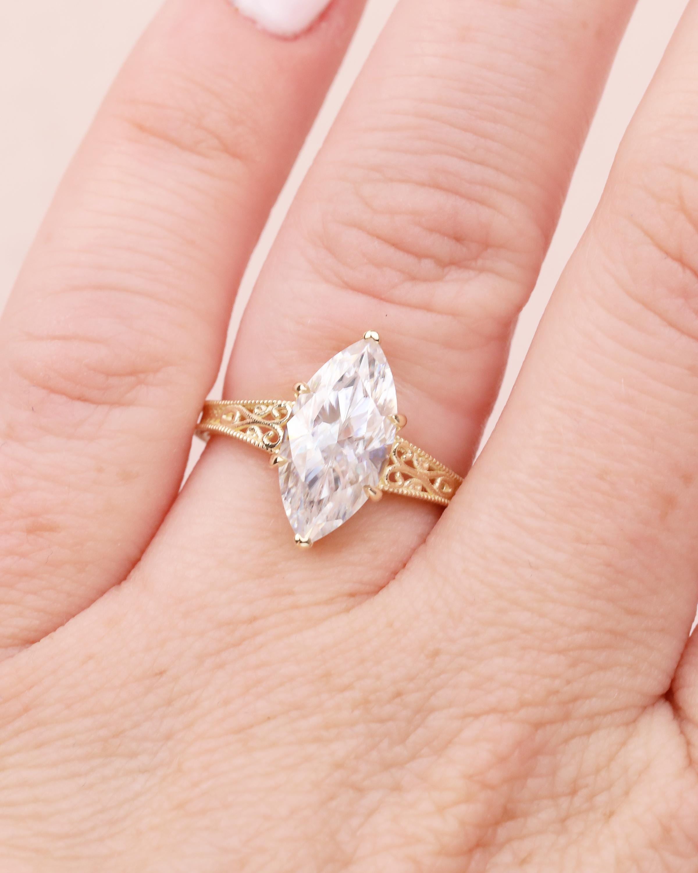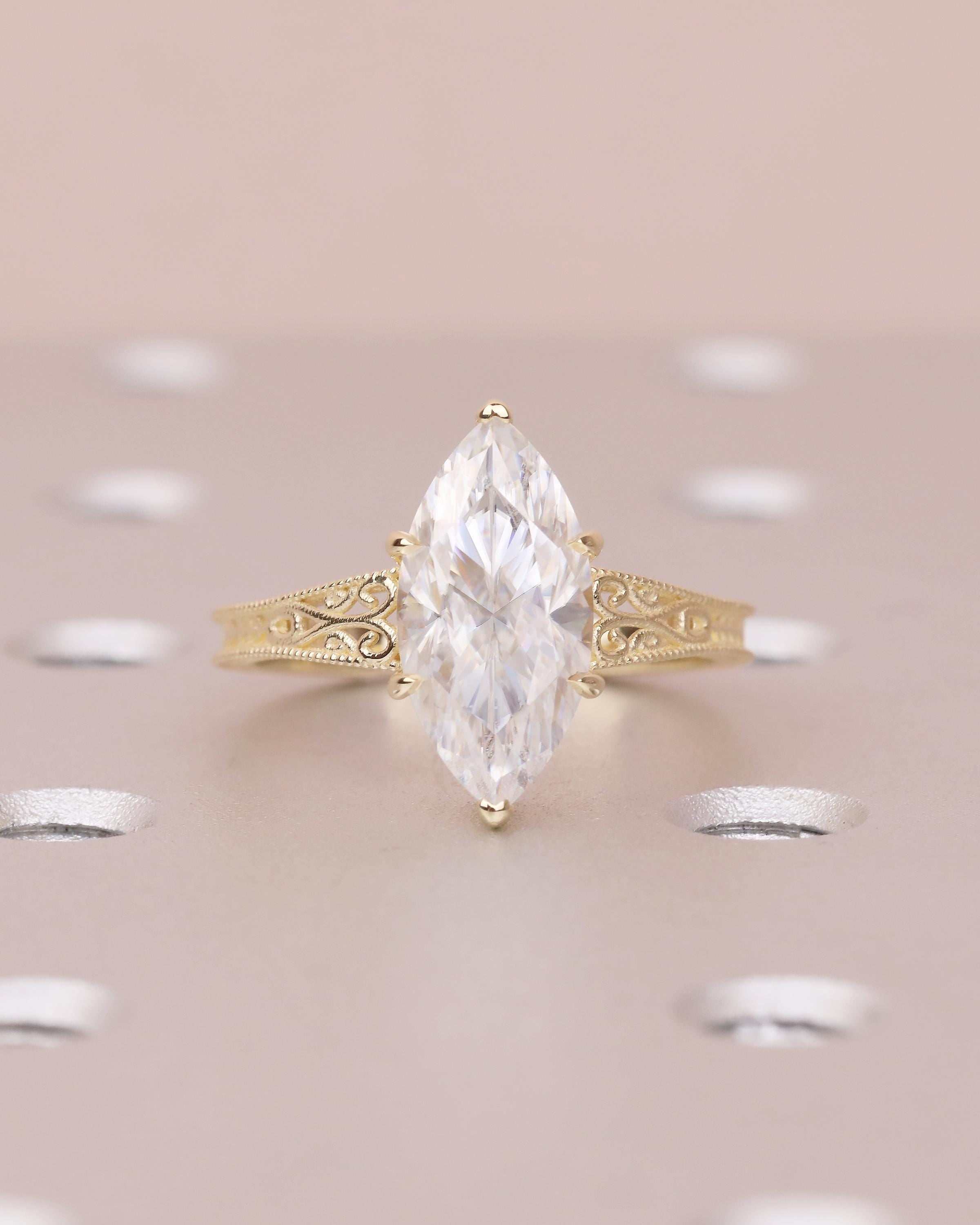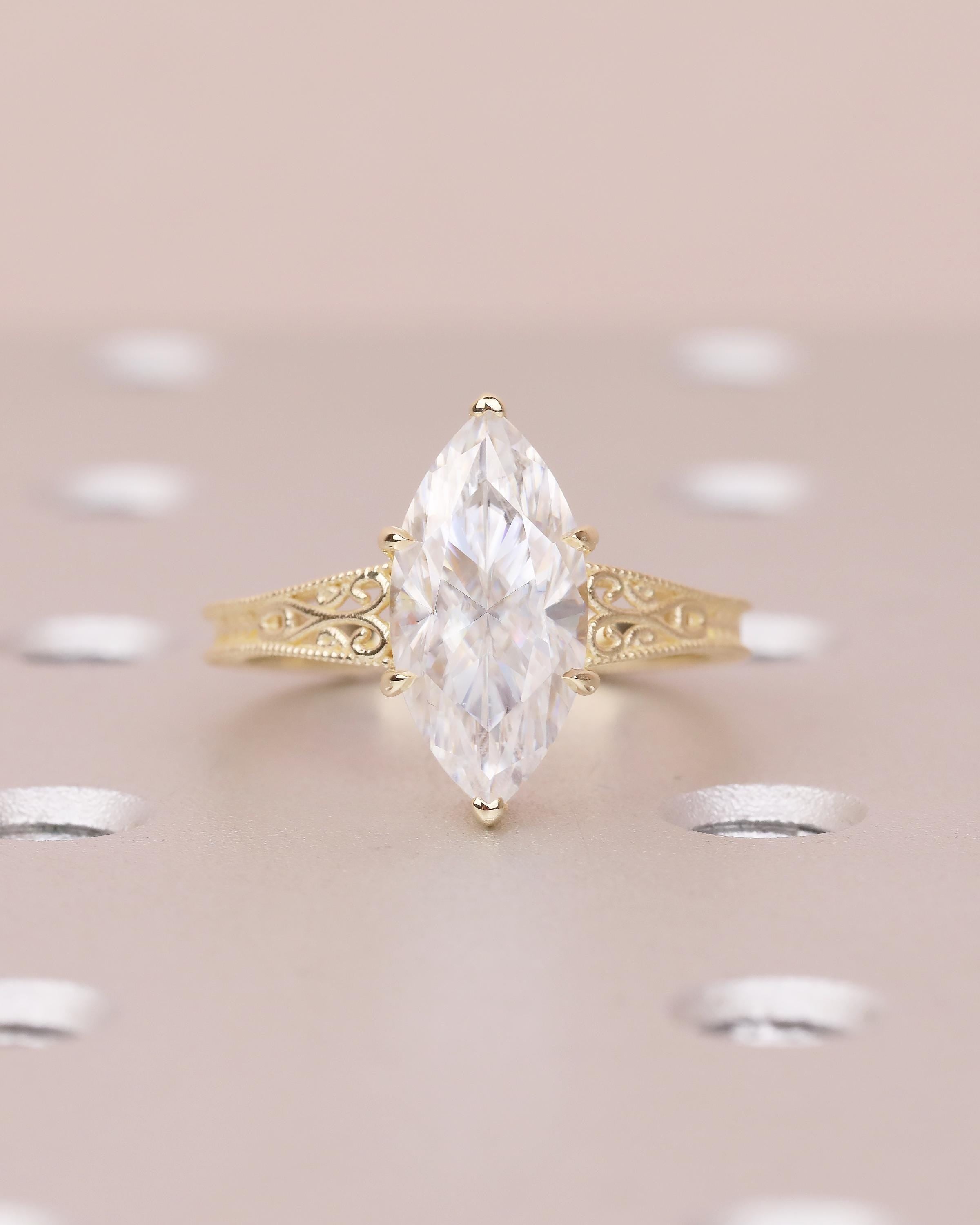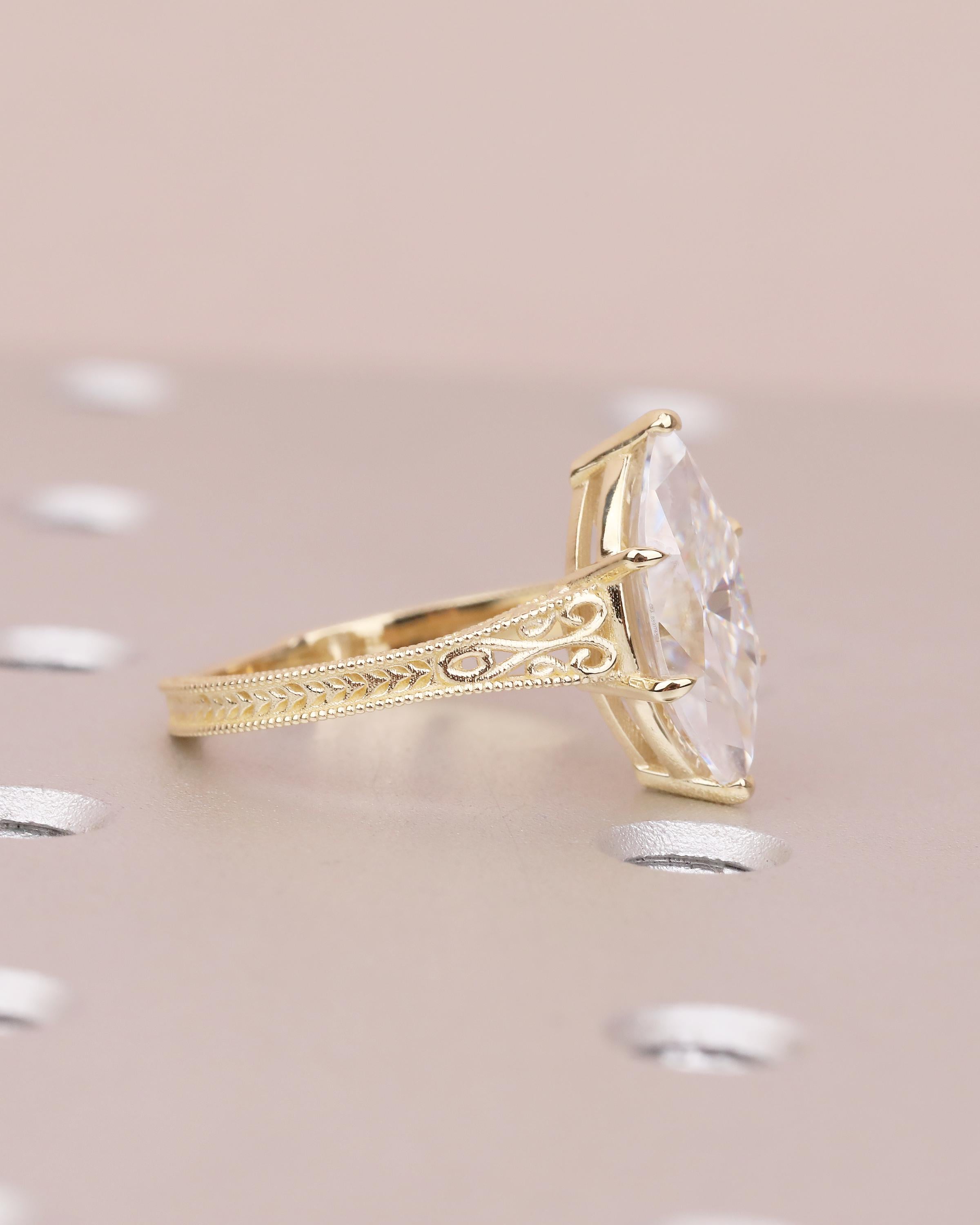 A beautifully handcrafted, vintage inspired engagement ring featuring a striking marquise cut Moissanite solitaire. Delicate scrollwork and engraved leaf motifs adorn the band, flowing gracefully toward the center stone, with intricate detailing beneath the setting for a subtle hidden touch. Blending timeless Victorian elegance with clean, modern lines, this statement ring is designed to be treasured today and passed down as a cherished heirloom.