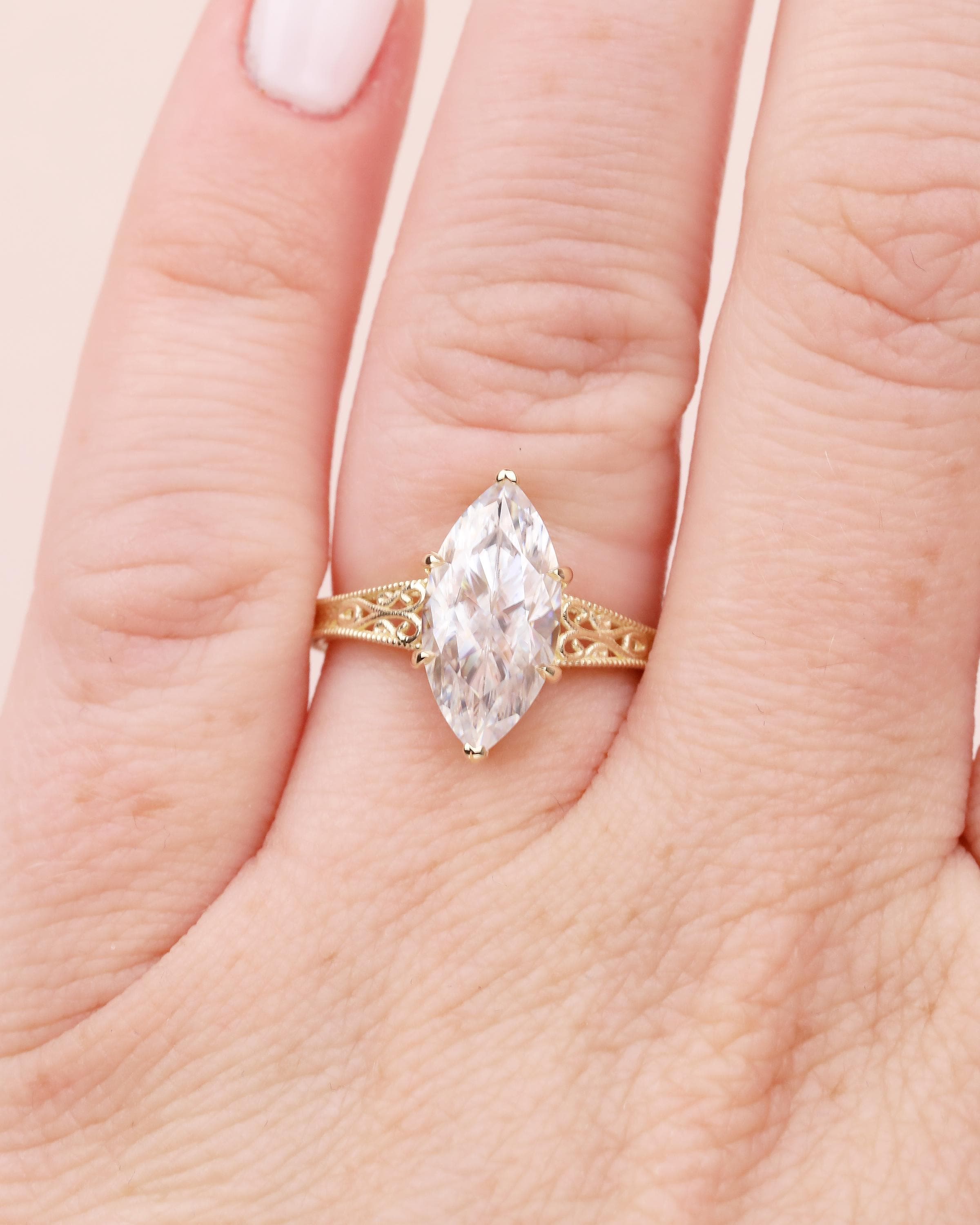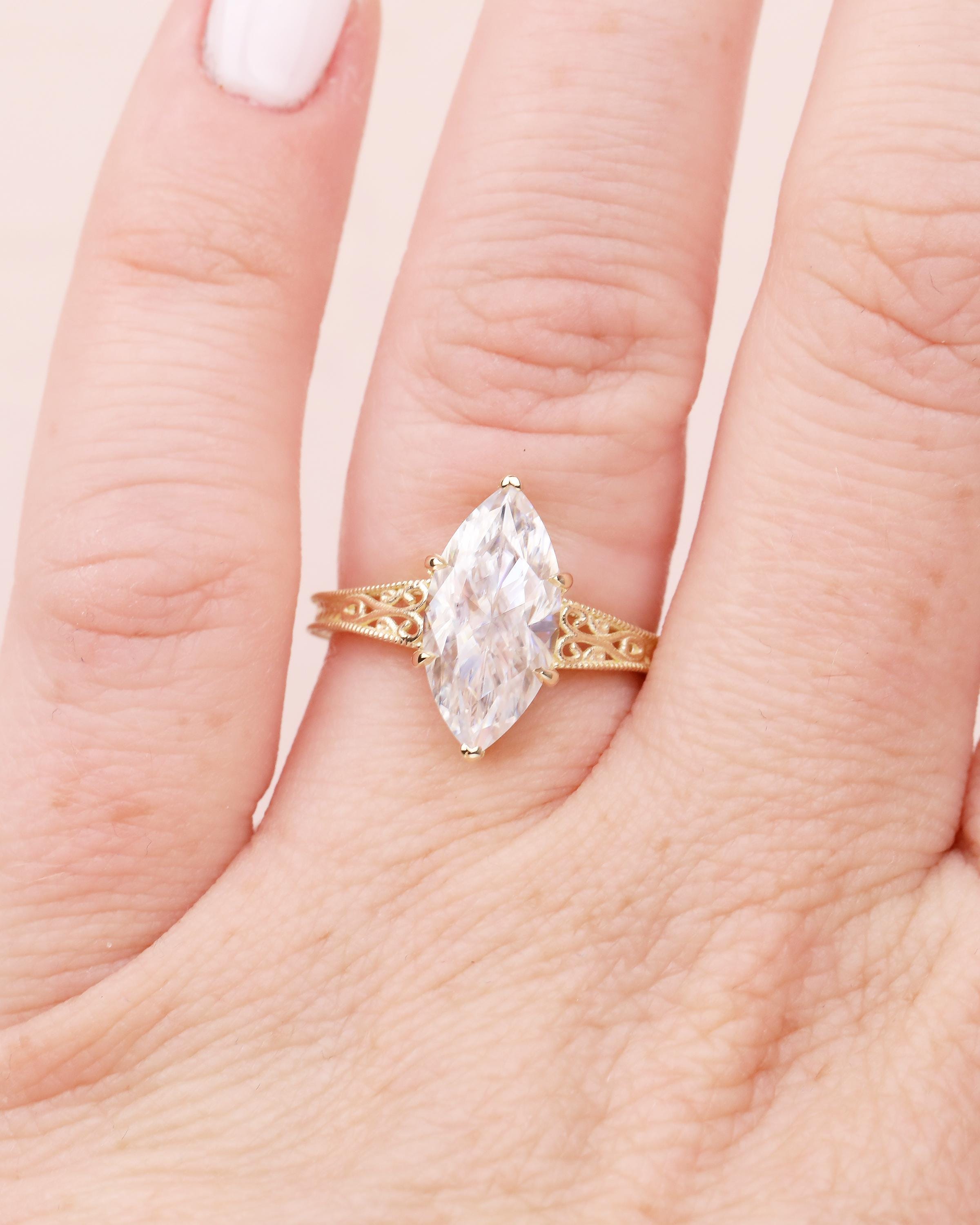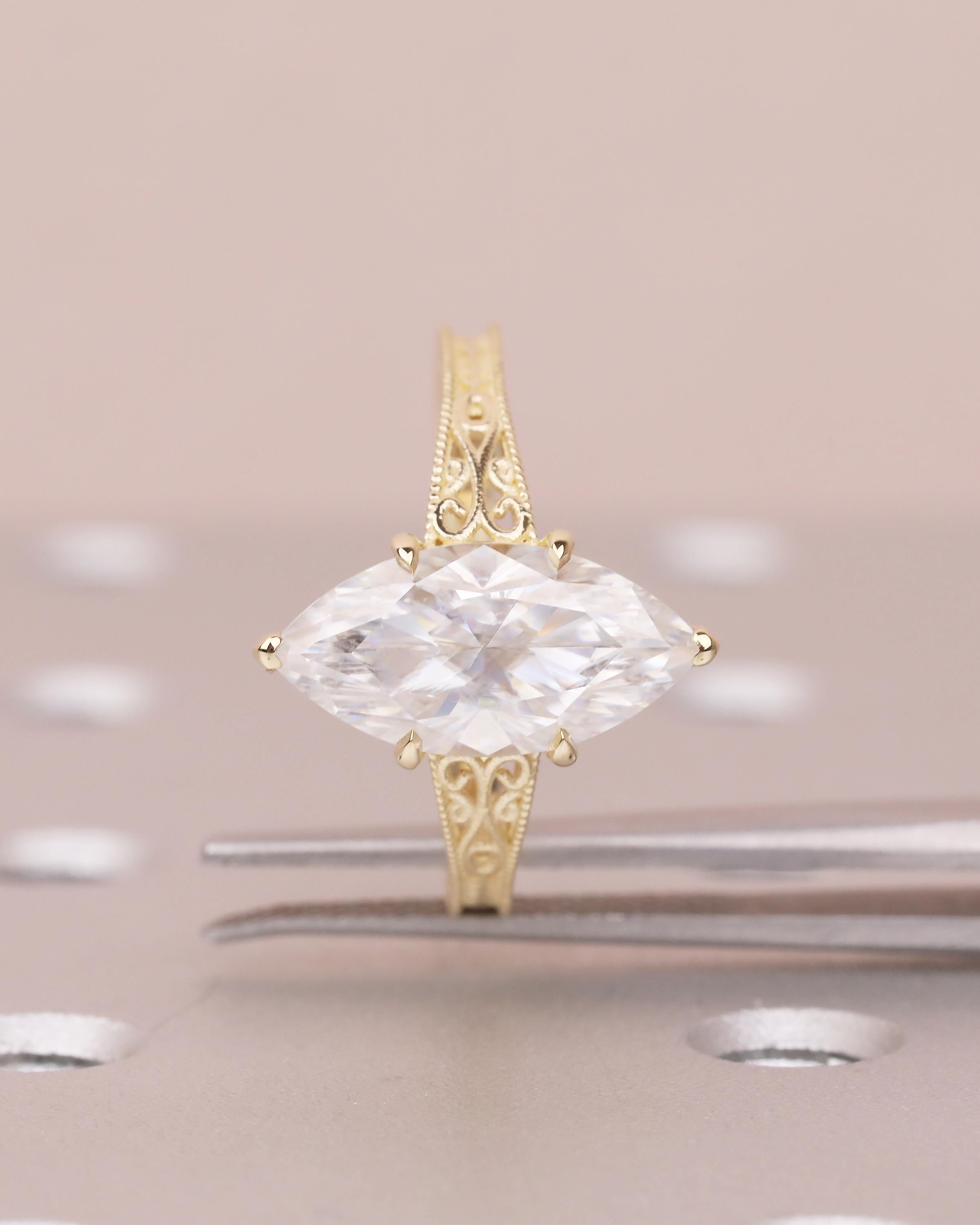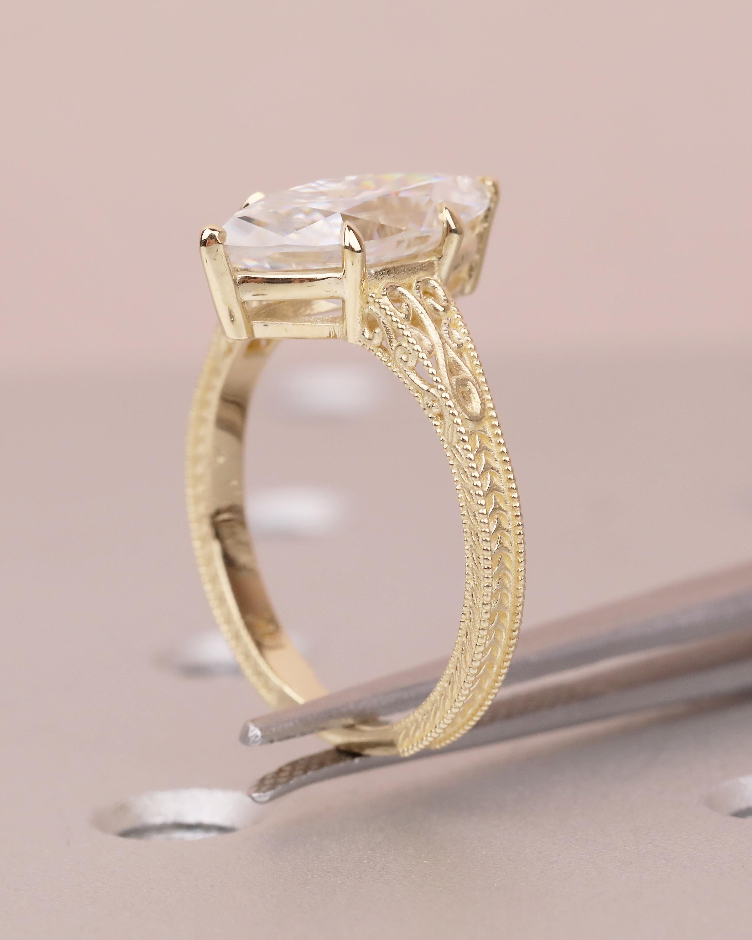 A beautifully handcrafted, vintage inspired engagement ring featuring a striking marquise cut Moissanite solitaire. Delicate scrollwork and engraved leaf motifs adorn the band, flowing gracefully toward the center stone, with intricate detailing beneath the setting for a subtle hidden touch. Blending timeless Victorian elegance with clean, modern lines, this statement ring is designed to be treasured today and passed down as a cherished heirloom.