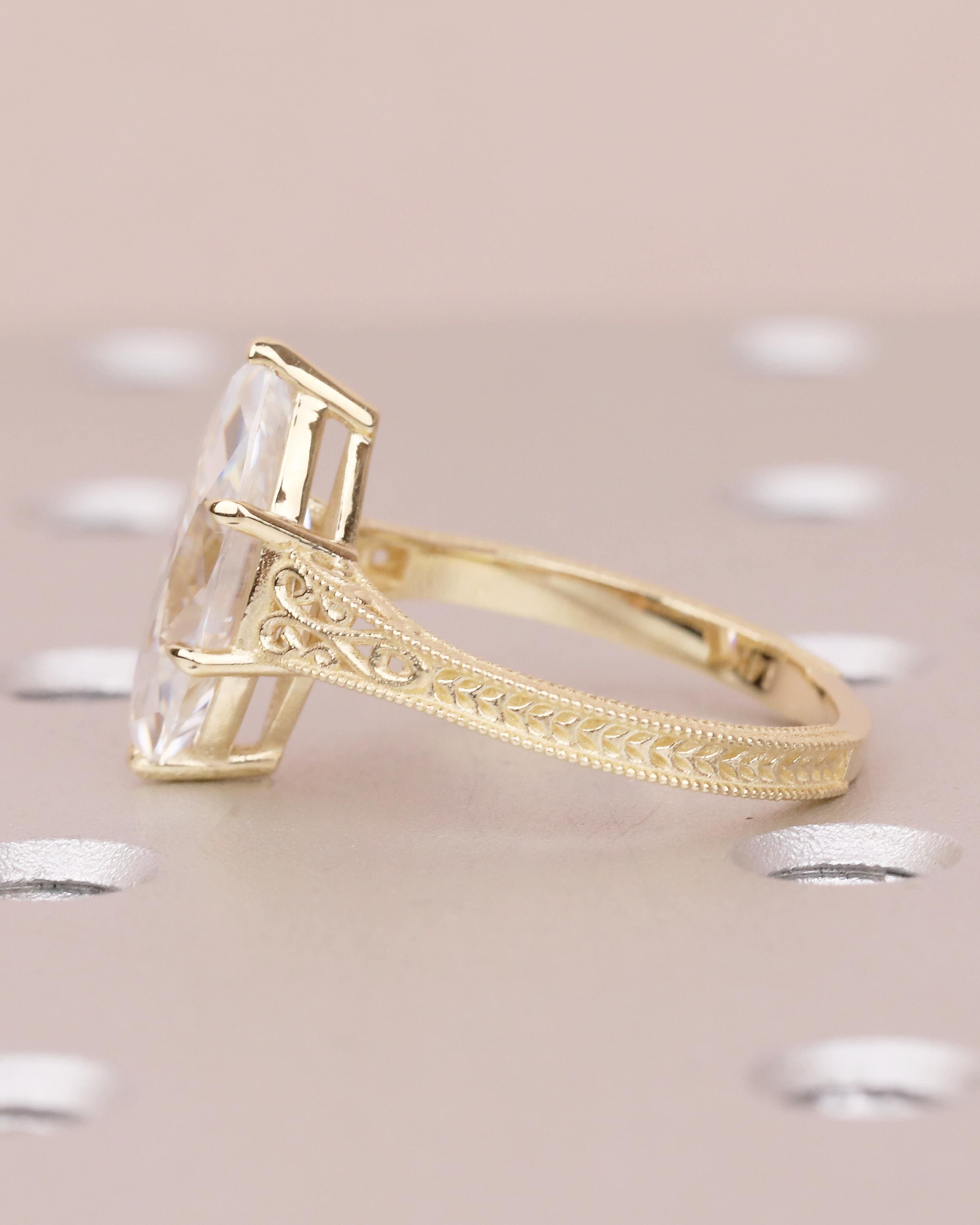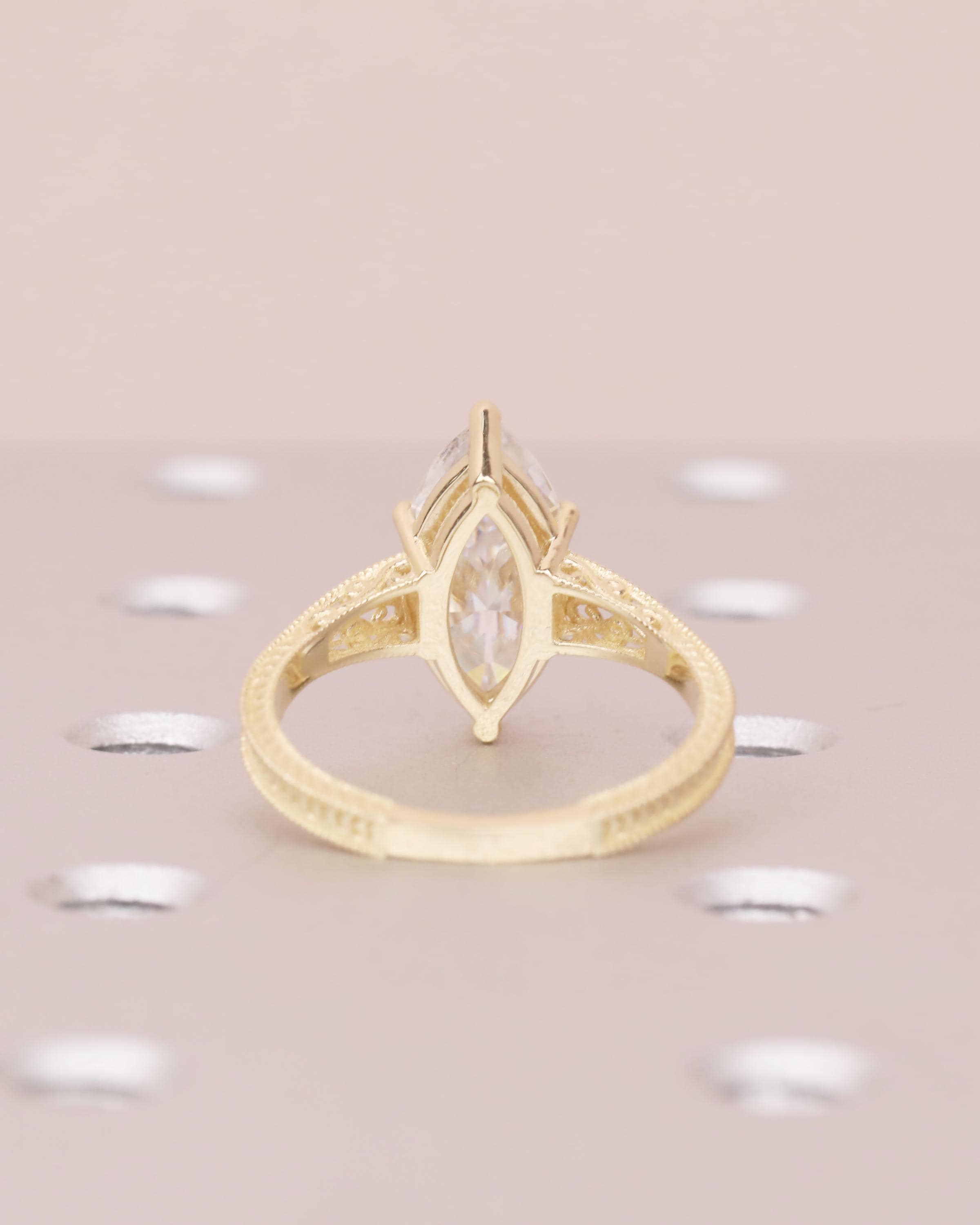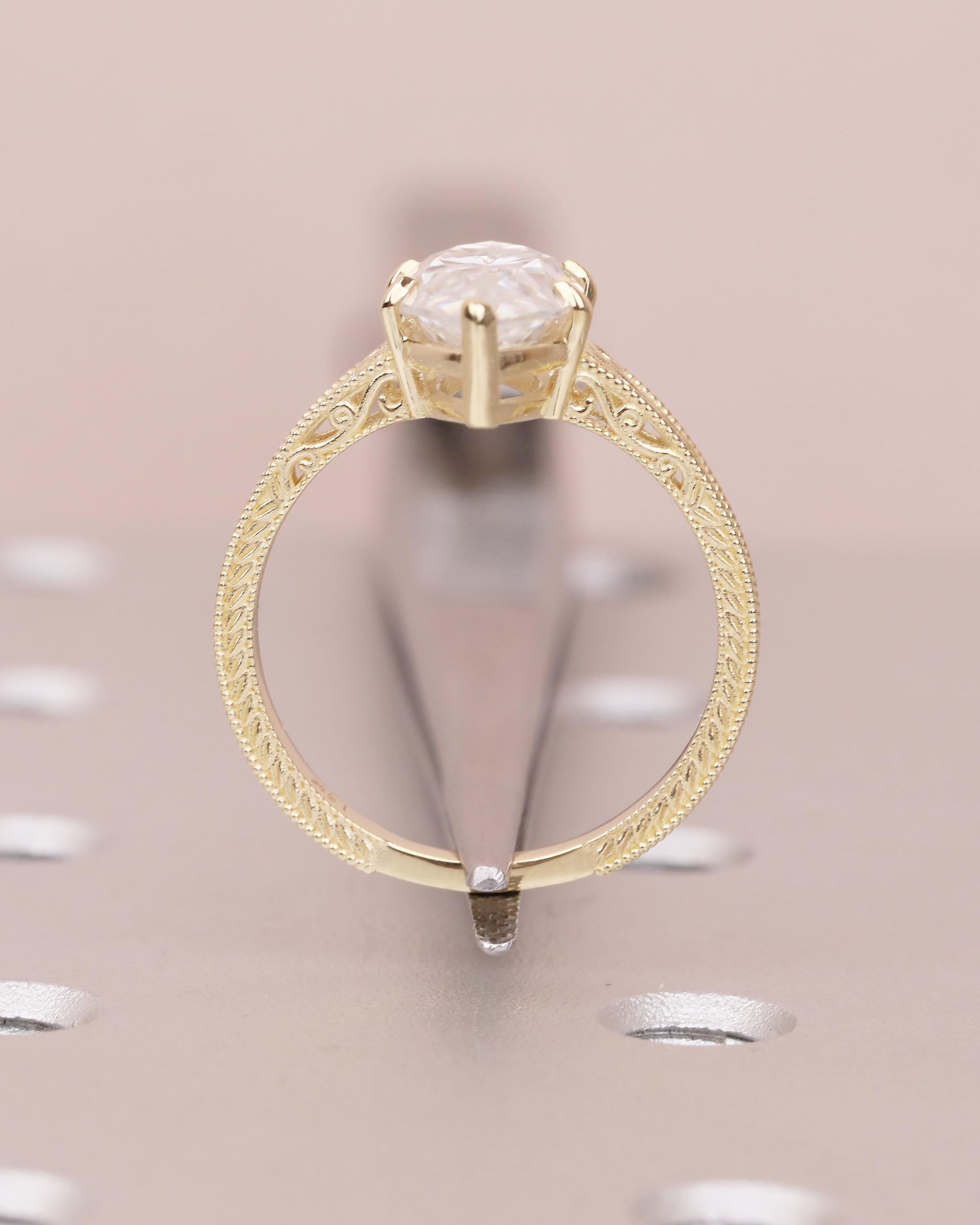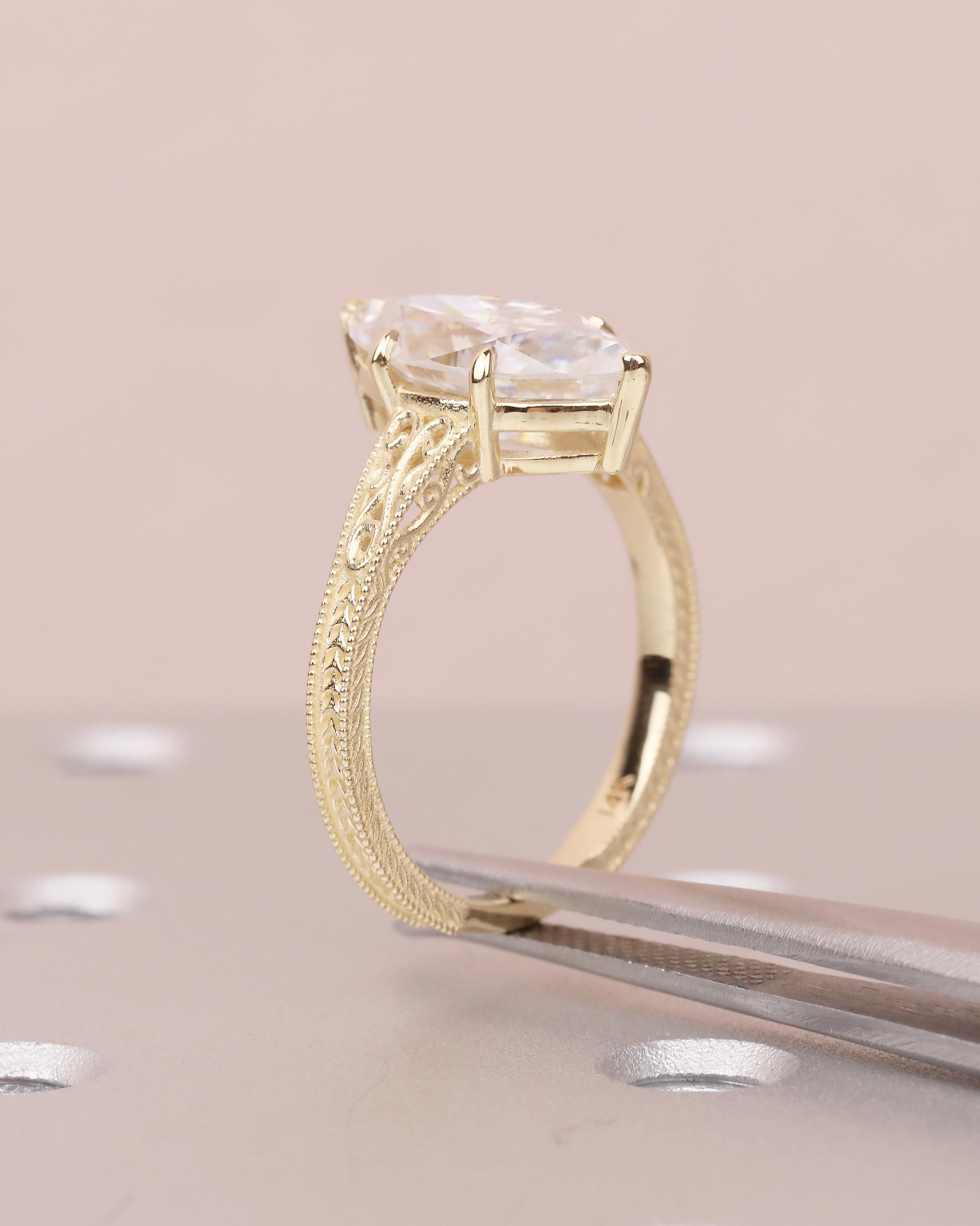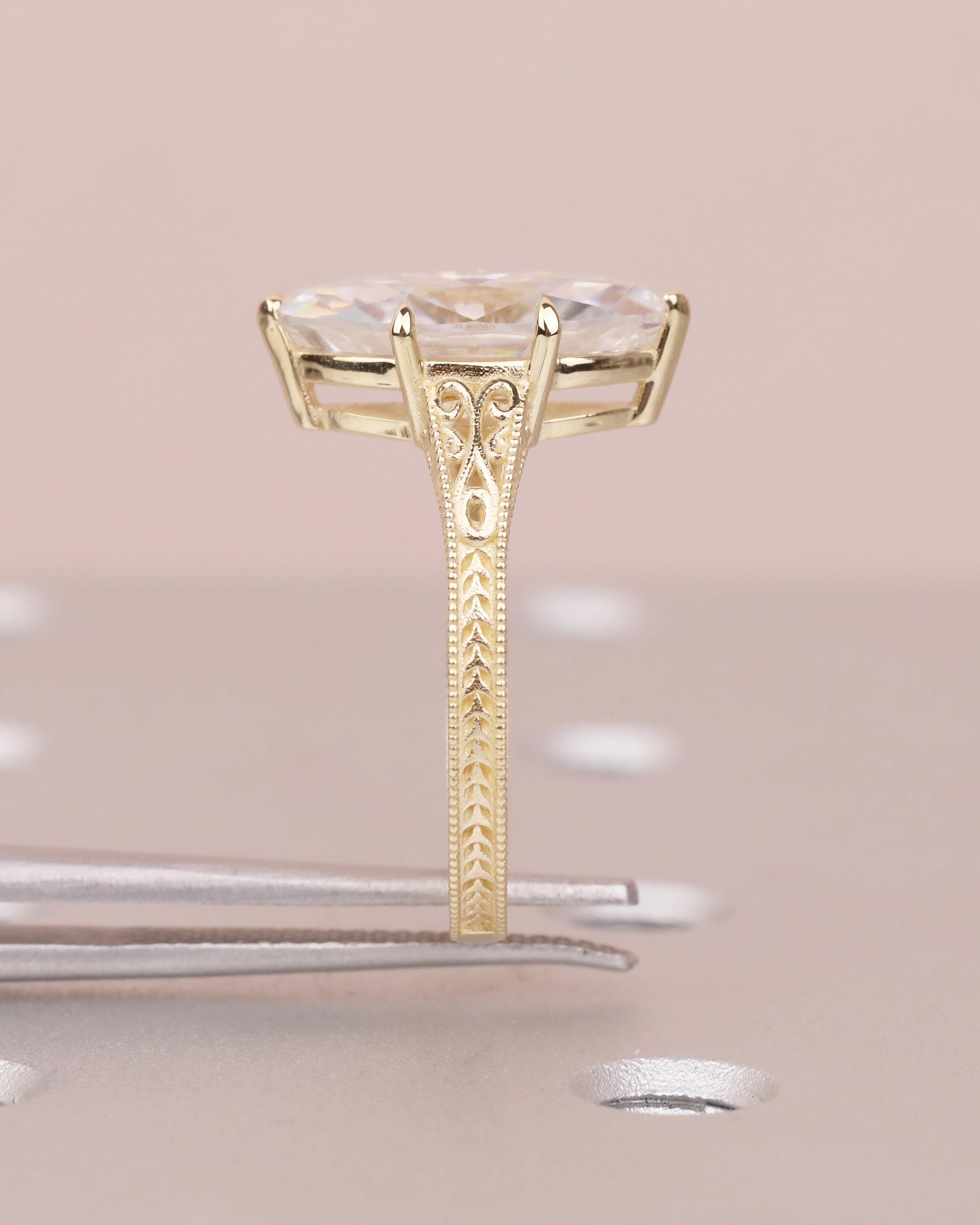 A beautifully handcrafted, vintage inspired engagement ring featuring a striking marquise cut Moissanite solitaire. Delicate scrollwork and engraved leaf motifs adorn the band, flowing gracefully toward the center stone, with intricate detailing beneath the setting for a subtle hidden touch. Blending timeless Victorian elegance with clean, modern lines, this statement ring is designed to be treasured today and passed down as a cherished heirloom.