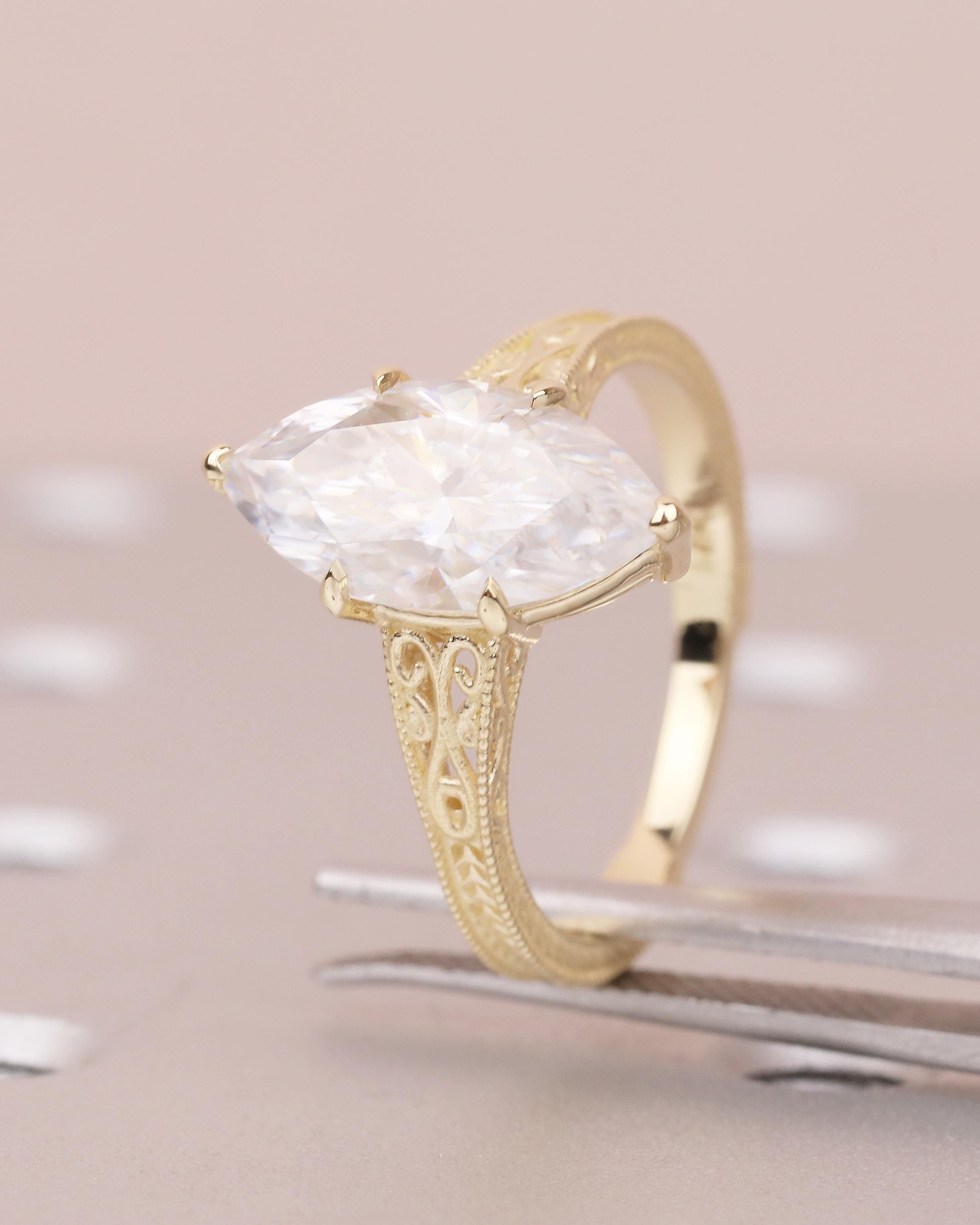 Marquise Engagement Ring, Vintage Style 14k Solid Gold Solitaire Moissanite Rings for Women