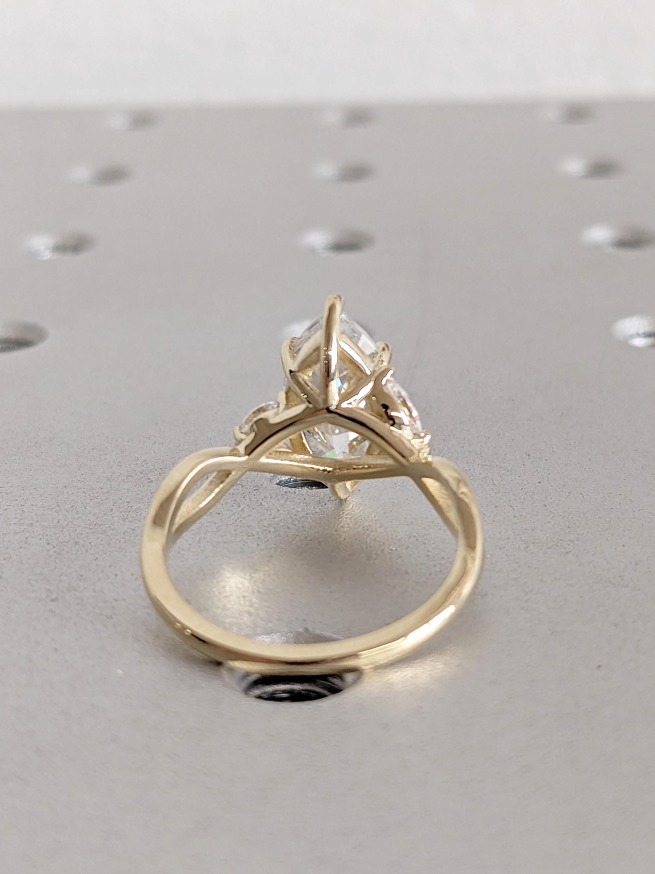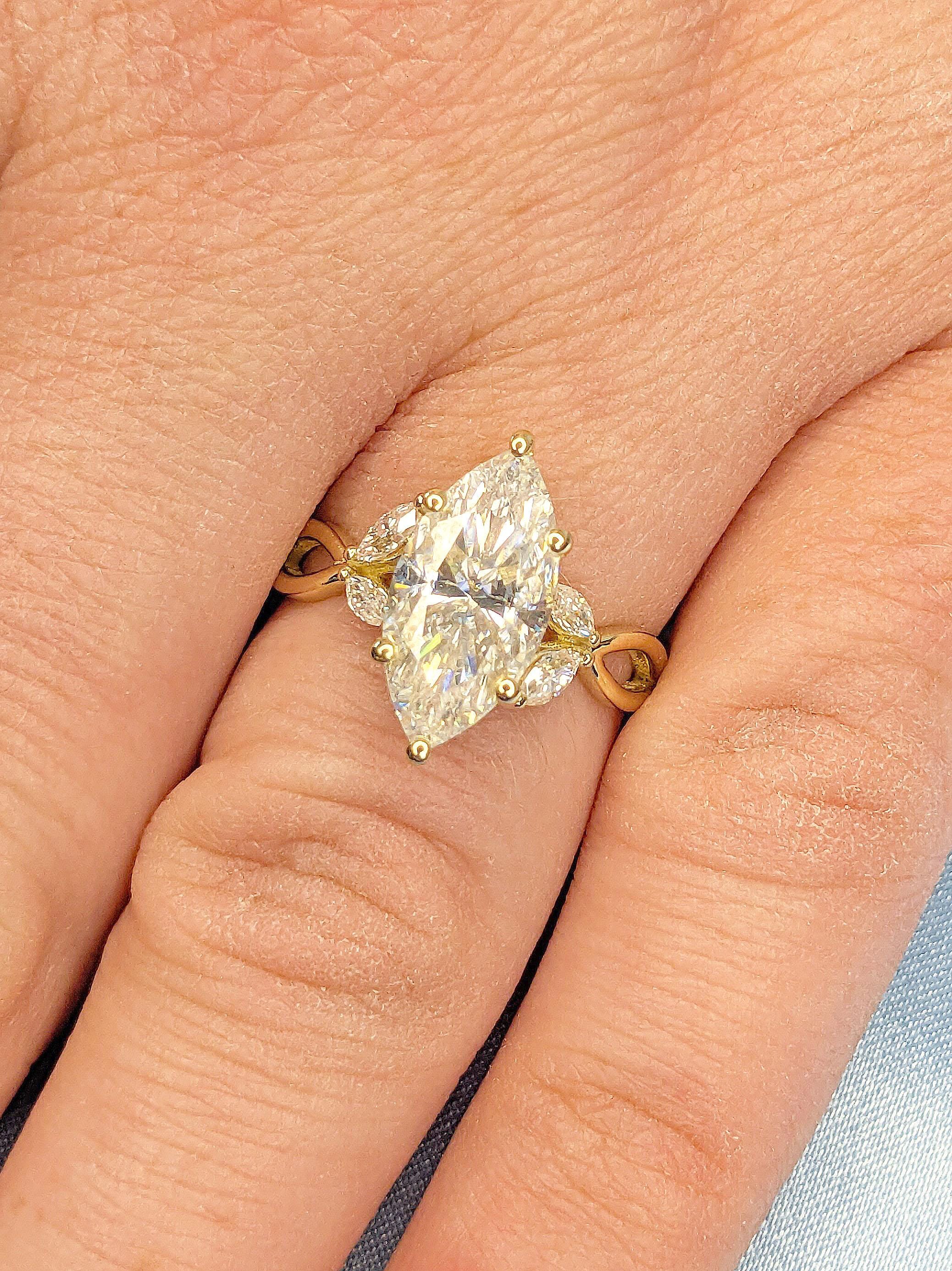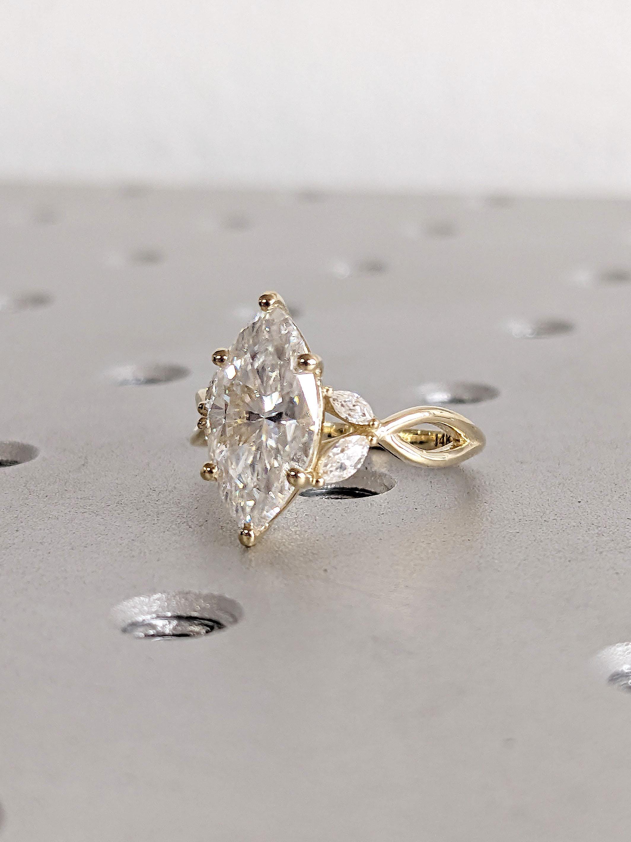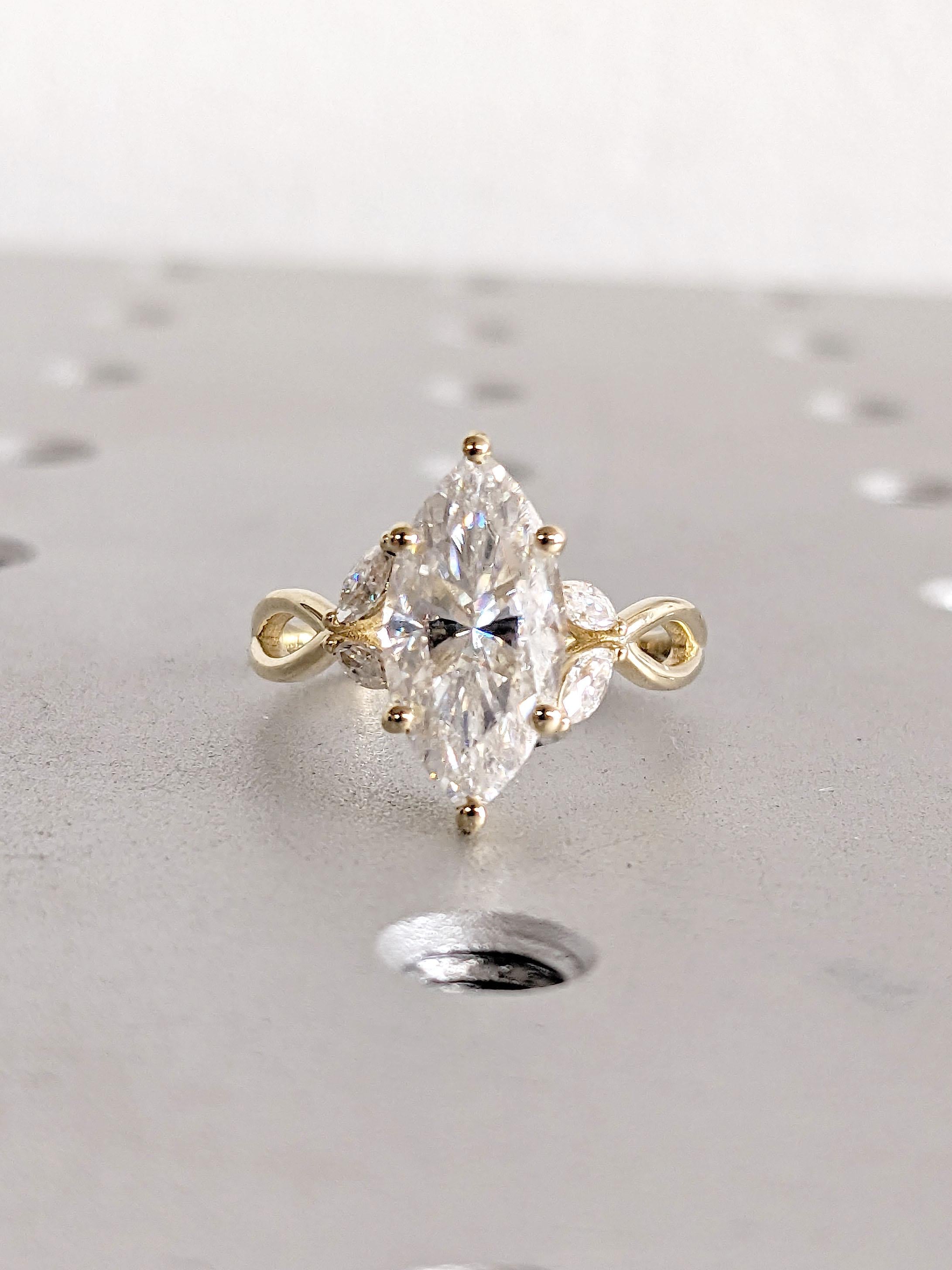 A nature inspired five stone ring, features marquise cut Moissanite main stone atop a beautiful trellis setting, accented by marquise cut side stones delicately arranged resembling leaves on an intertwining twig like band. An elegant blend between modern aesthetic with a rustic flair. This handmade ring is the perfect jewelry for engagement, weddings or simply a gift for that special woman in your life.