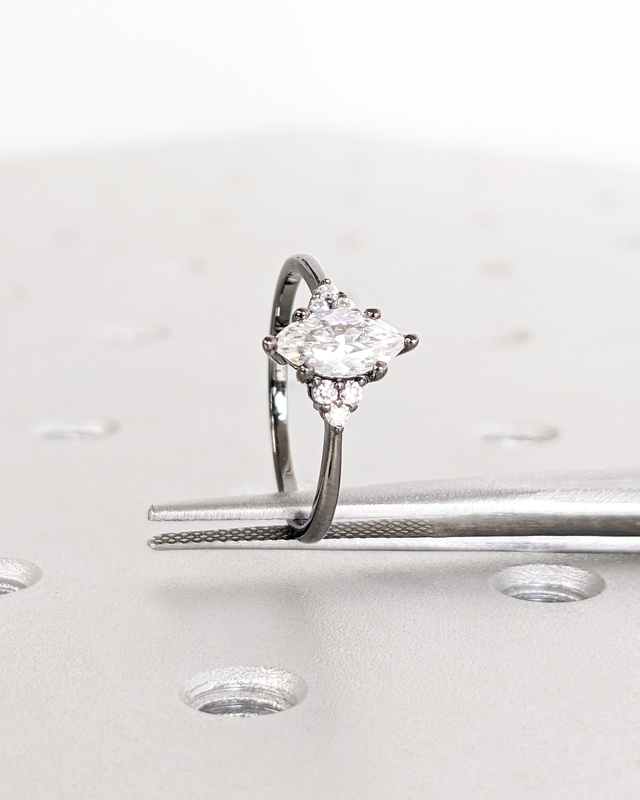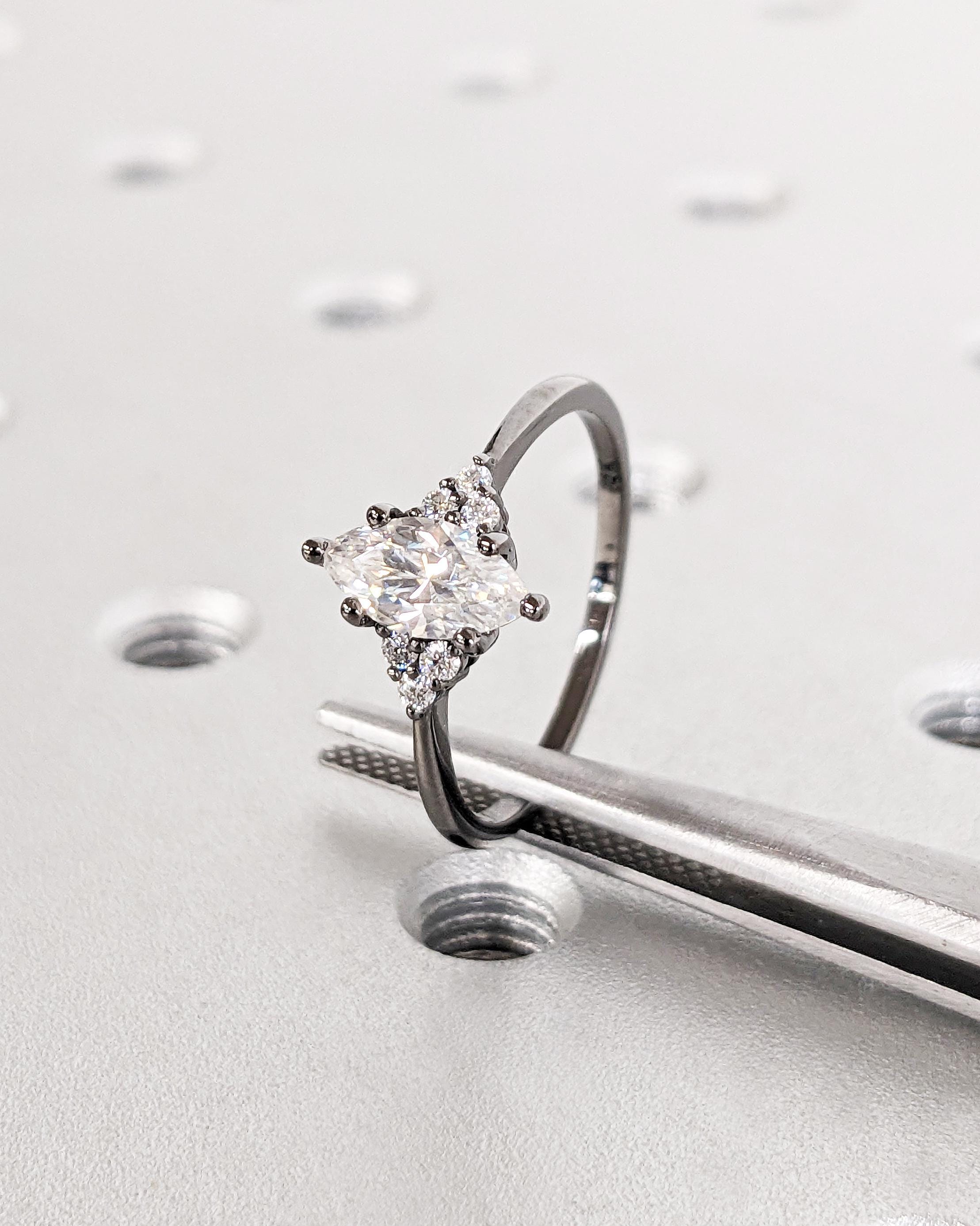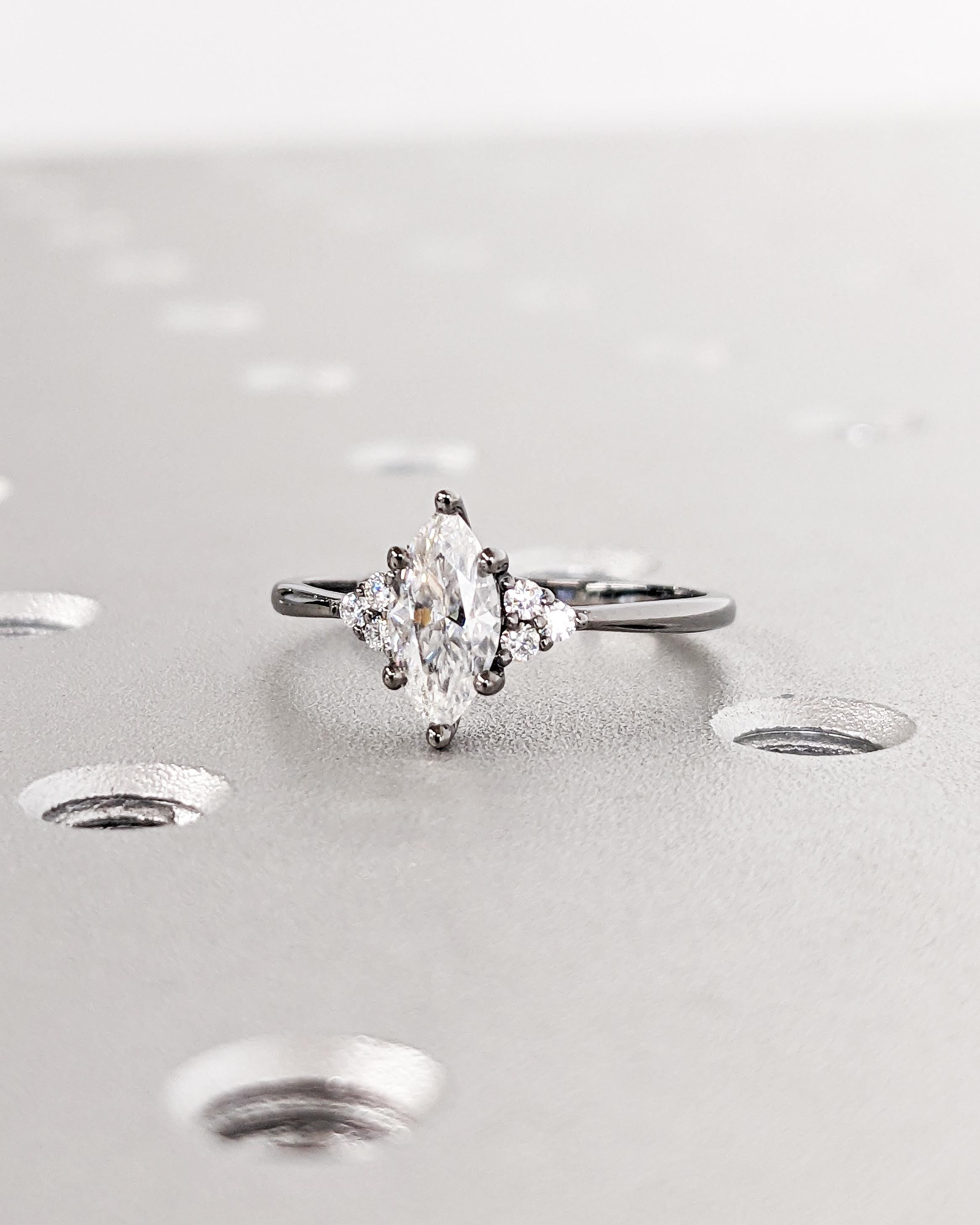 This marquise cut engagement ring is designed with both beauty and balance in mind. Small round side stones flank the center, creating a soft cluster sparkle. Choose from natural diamond, lab diamond, or moissanite for the side stones. A pure and classic design to cherish for a lifetime.