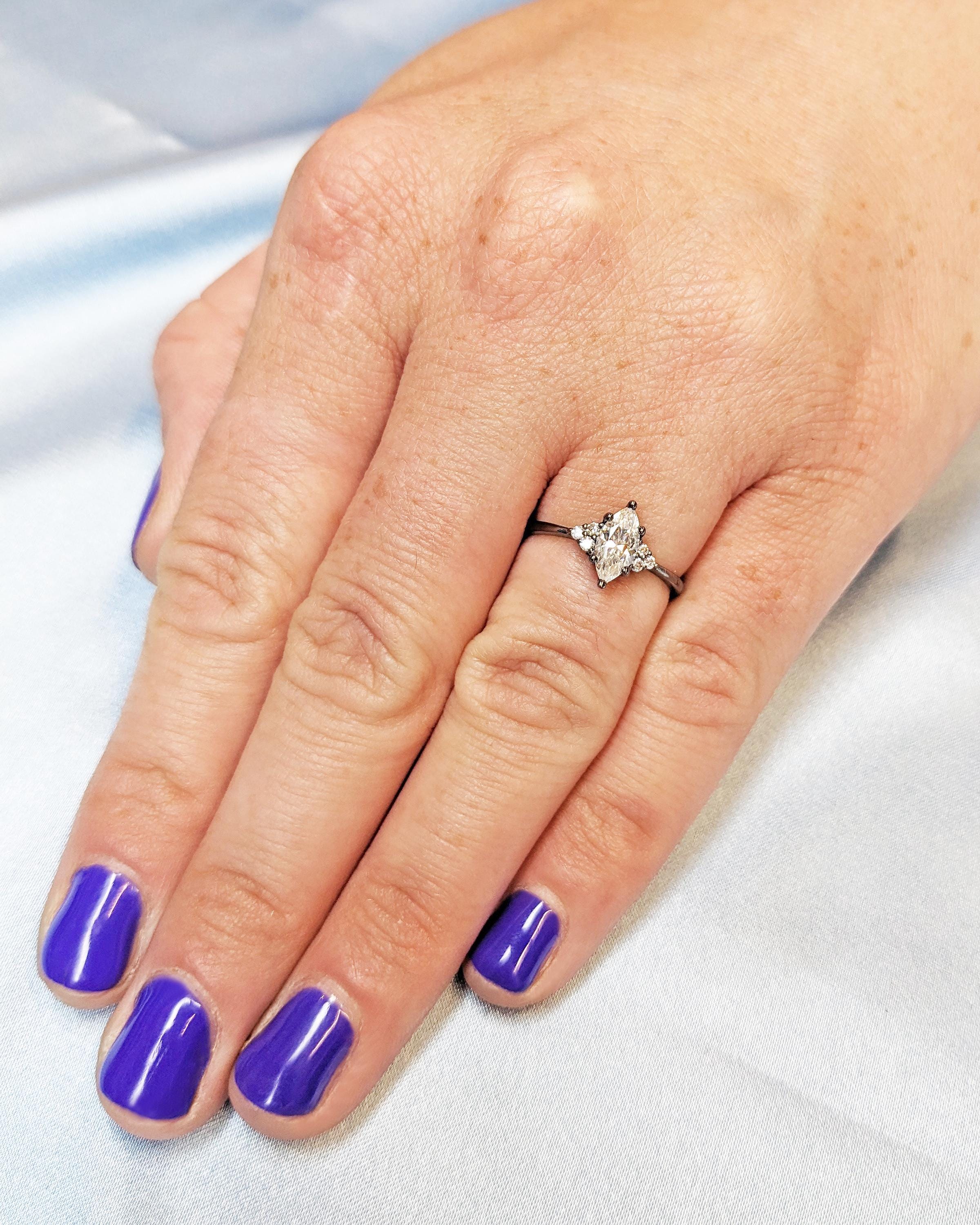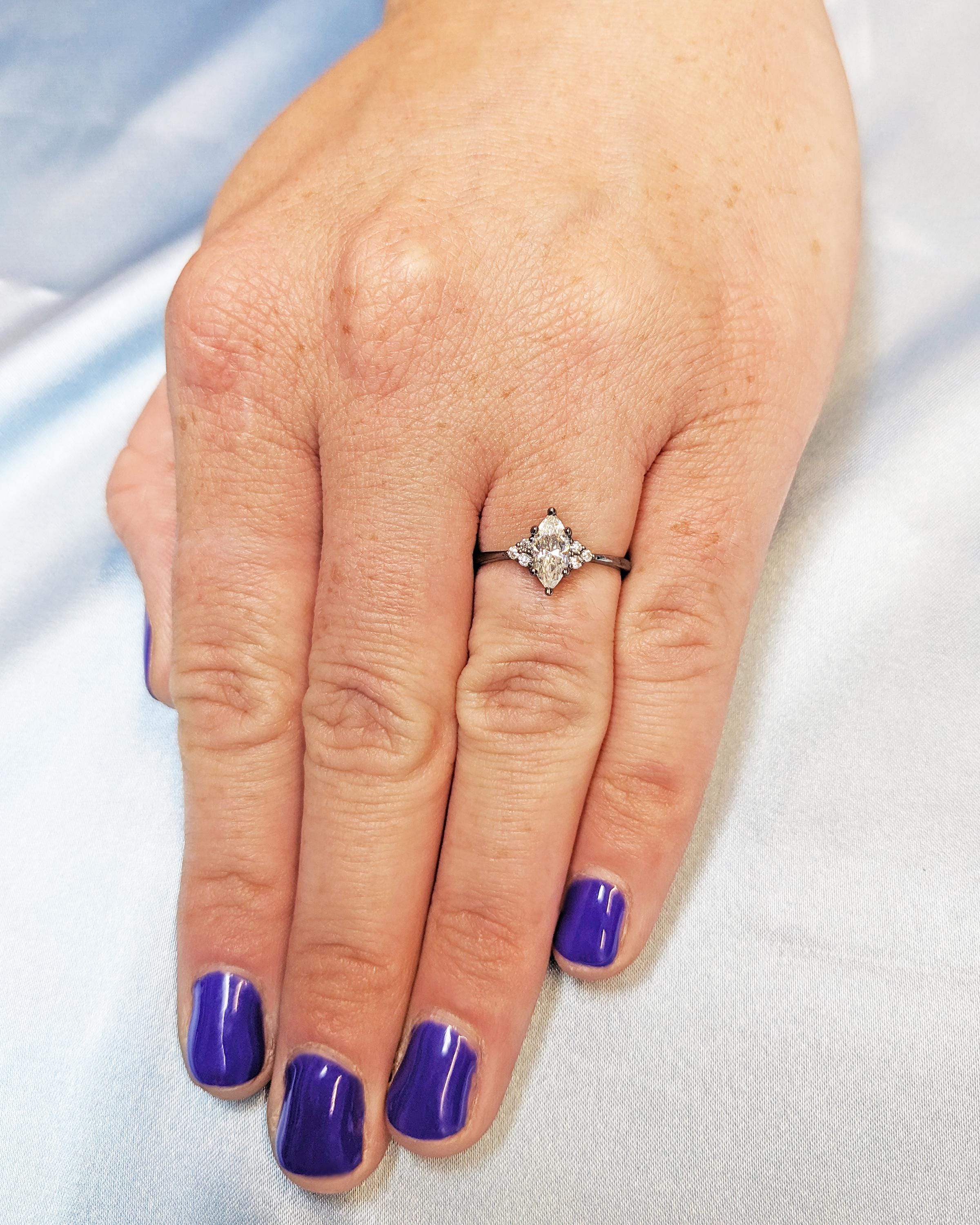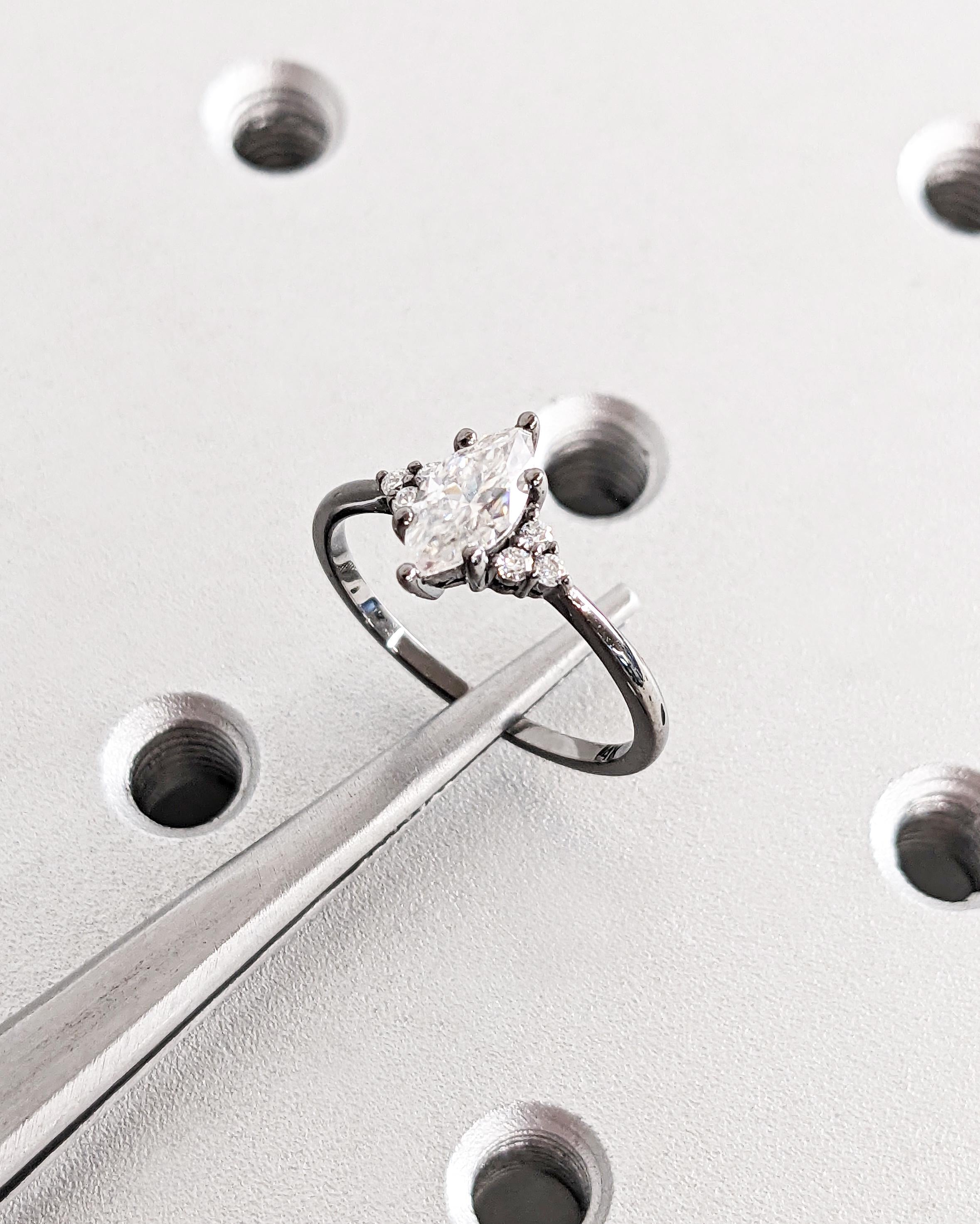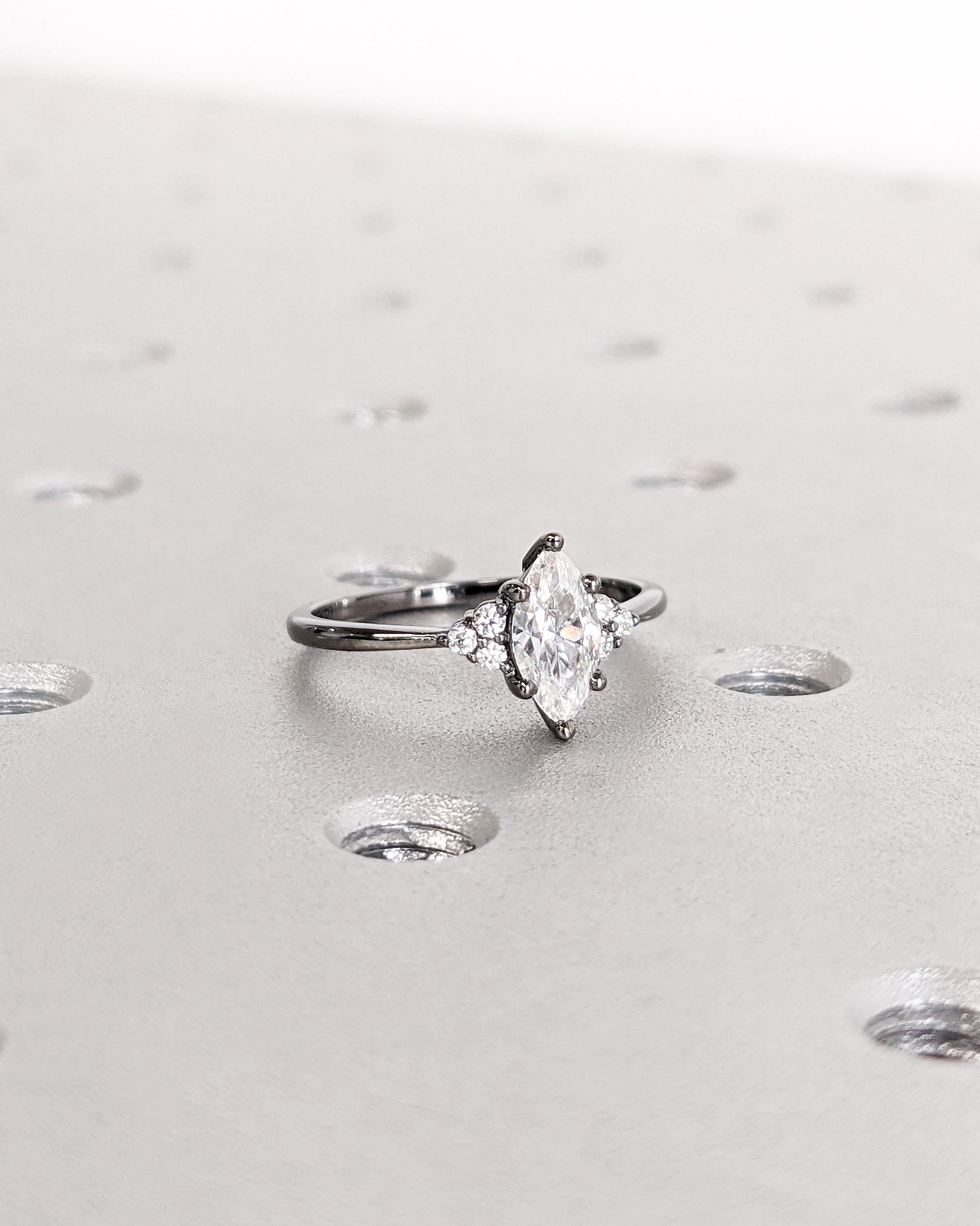 This marquise cut engagement ring is designed with both beauty and balance in mind. Small round side stones flank the center, creating a soft cluster sparkle. Choose from natural diamond, lab diamond, or moissanite for the side stones. A pure and classic design to cherish for a lifetime.