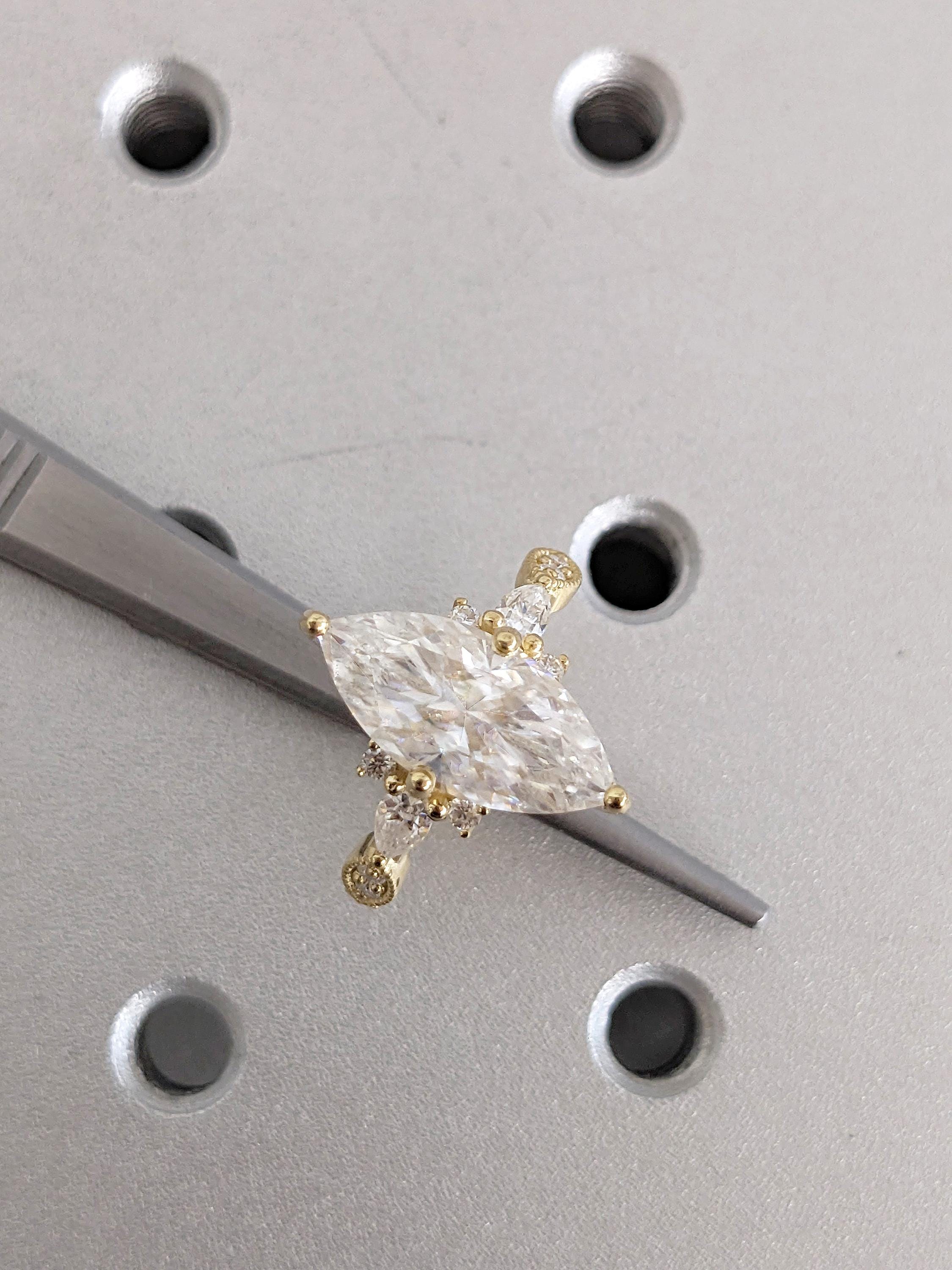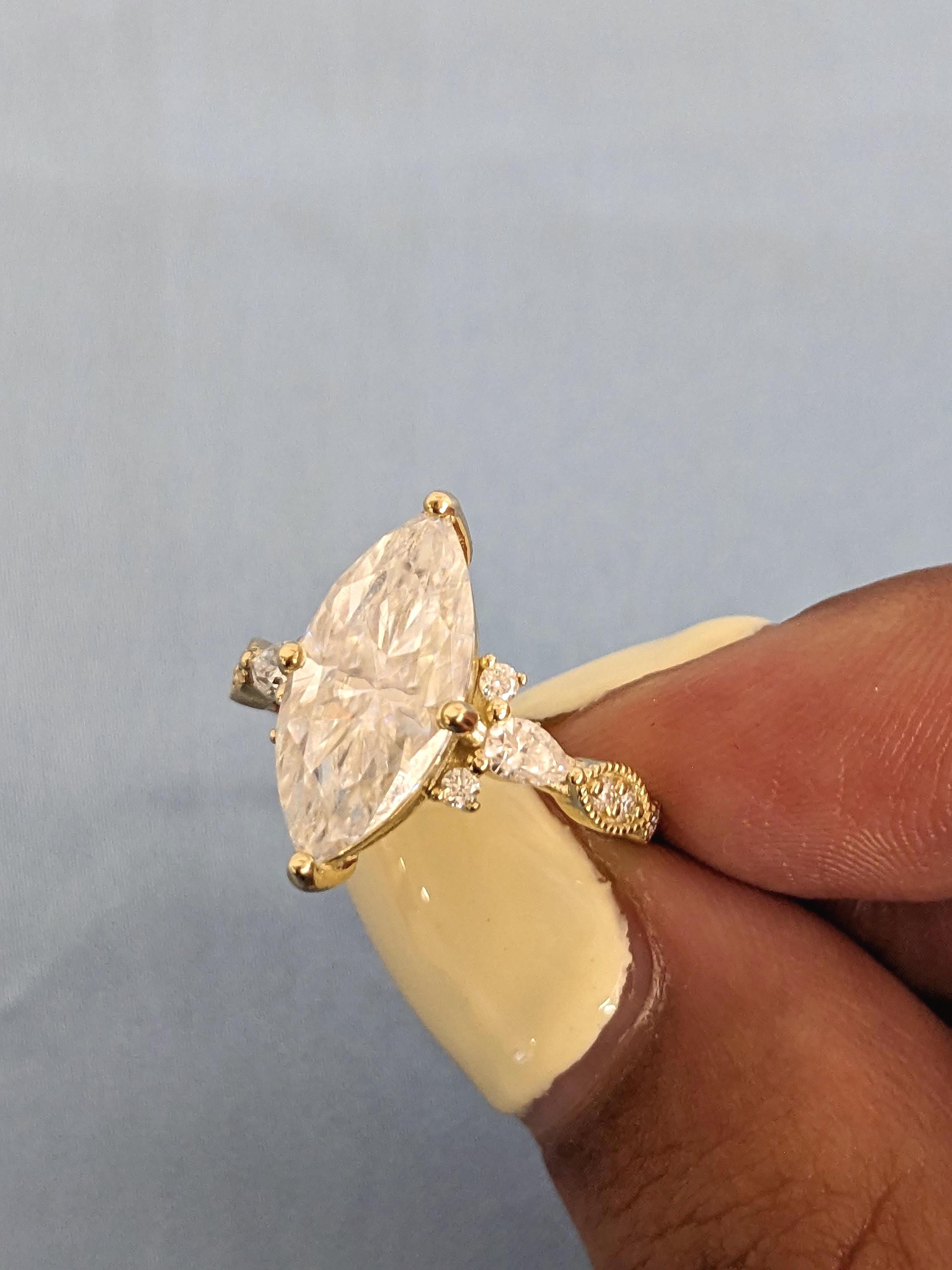 This ring features a Marquise Lab Grown Diamond as the center stone, elegantly held in a prong setting. The stone’s elongated shape adds a refined sparkle, while delicate milgrain detailing enhances its vintage charm. Accented with Pear and Round side stones in Natural Diamond, Lab Grown Diamond, or Moissanite, this ring is perfect for engagements or timeless everyday elegance.