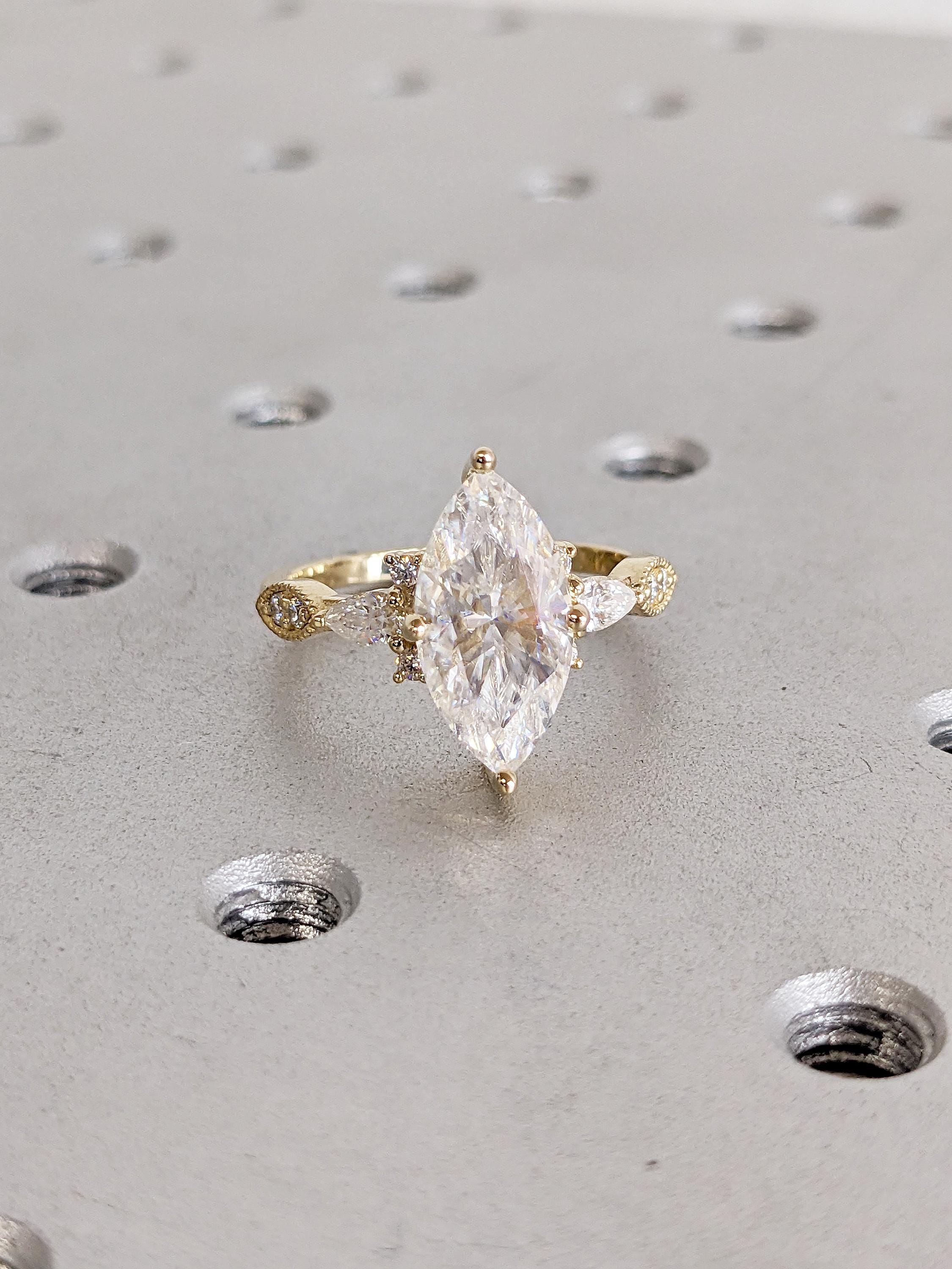 A vintage inspired statement ring, features a marquise cut Moissanite focal stone, accented by round and pear cut side stones available in Natural Diamonds, Lab Grown Diamonds or Moissanites of your choice. With delicate hand engraved milgrain detailing, this fashionable jewelry effortlessly complements your style for any occasion.