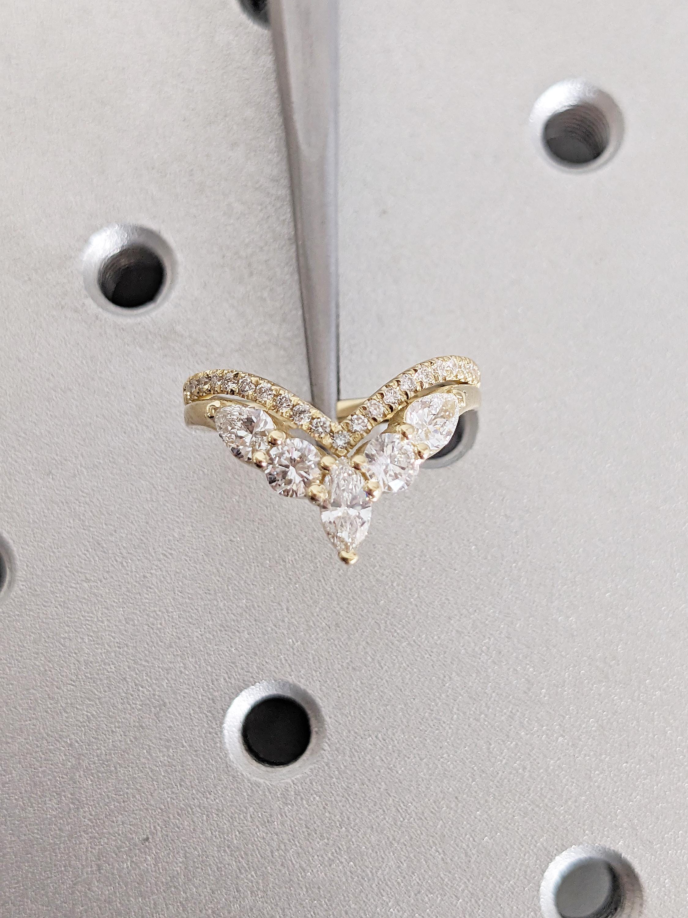This crown-inspired wedding band features a graceful mix of marquise, round, and pear cut stones, perfectly flushed with a shimmering row of round diamonds. Both the center stones and the flushed diamond row are available in your choice of Natural Diamonds, Lab Grown Diamonds, or Moissanites, making it a dazzling design that pairs beautifully with engagement rings or shines on its own.