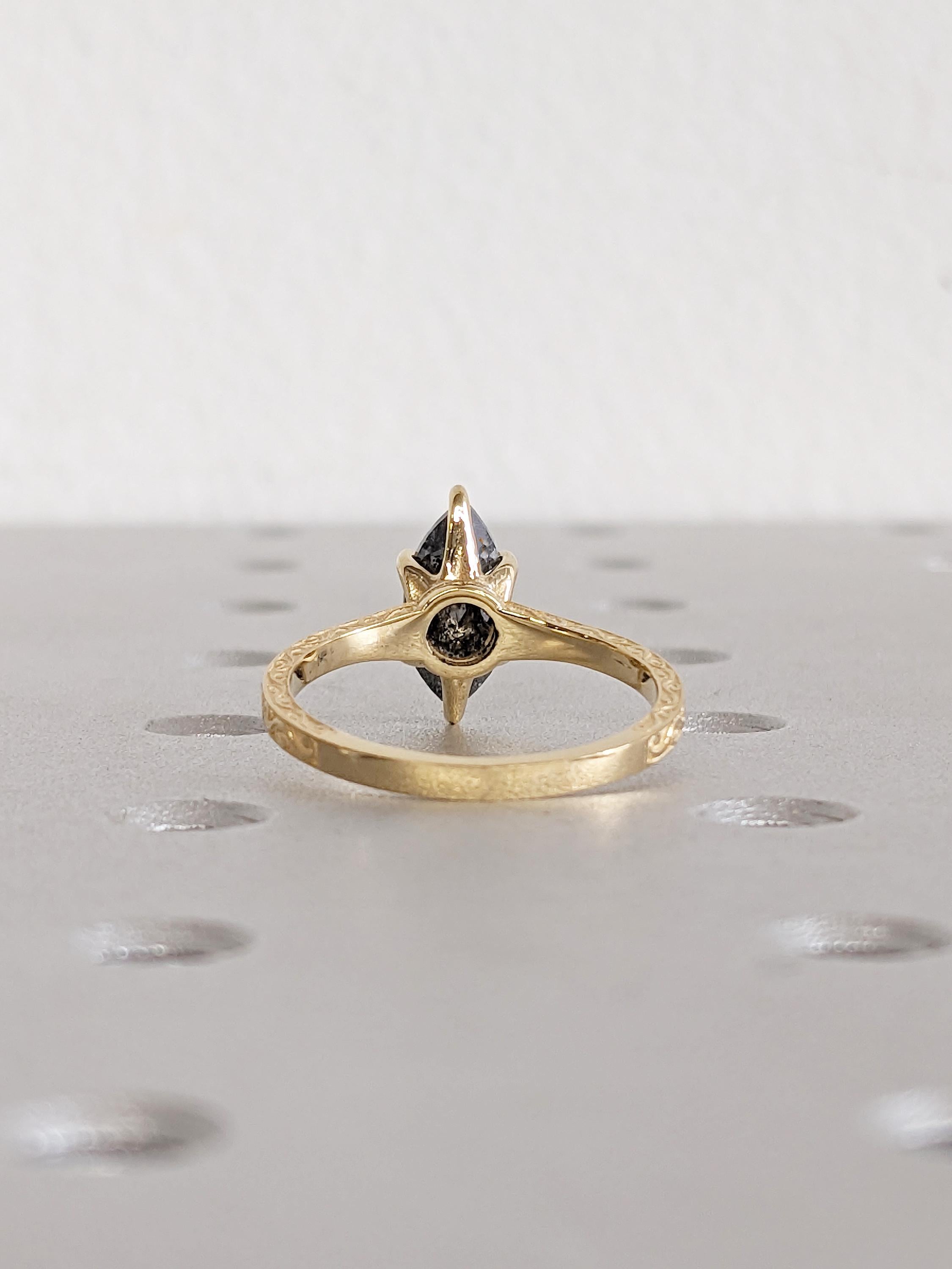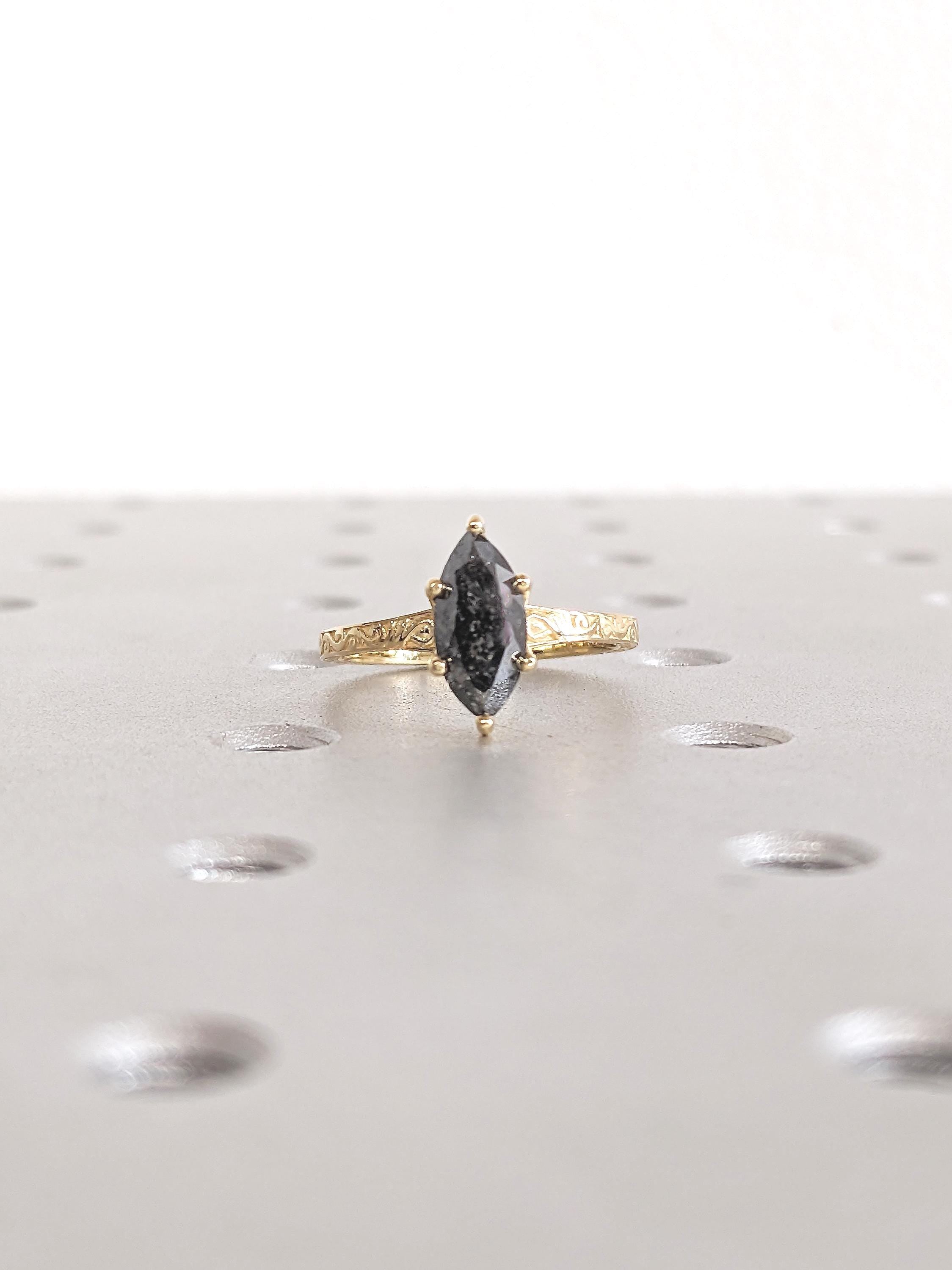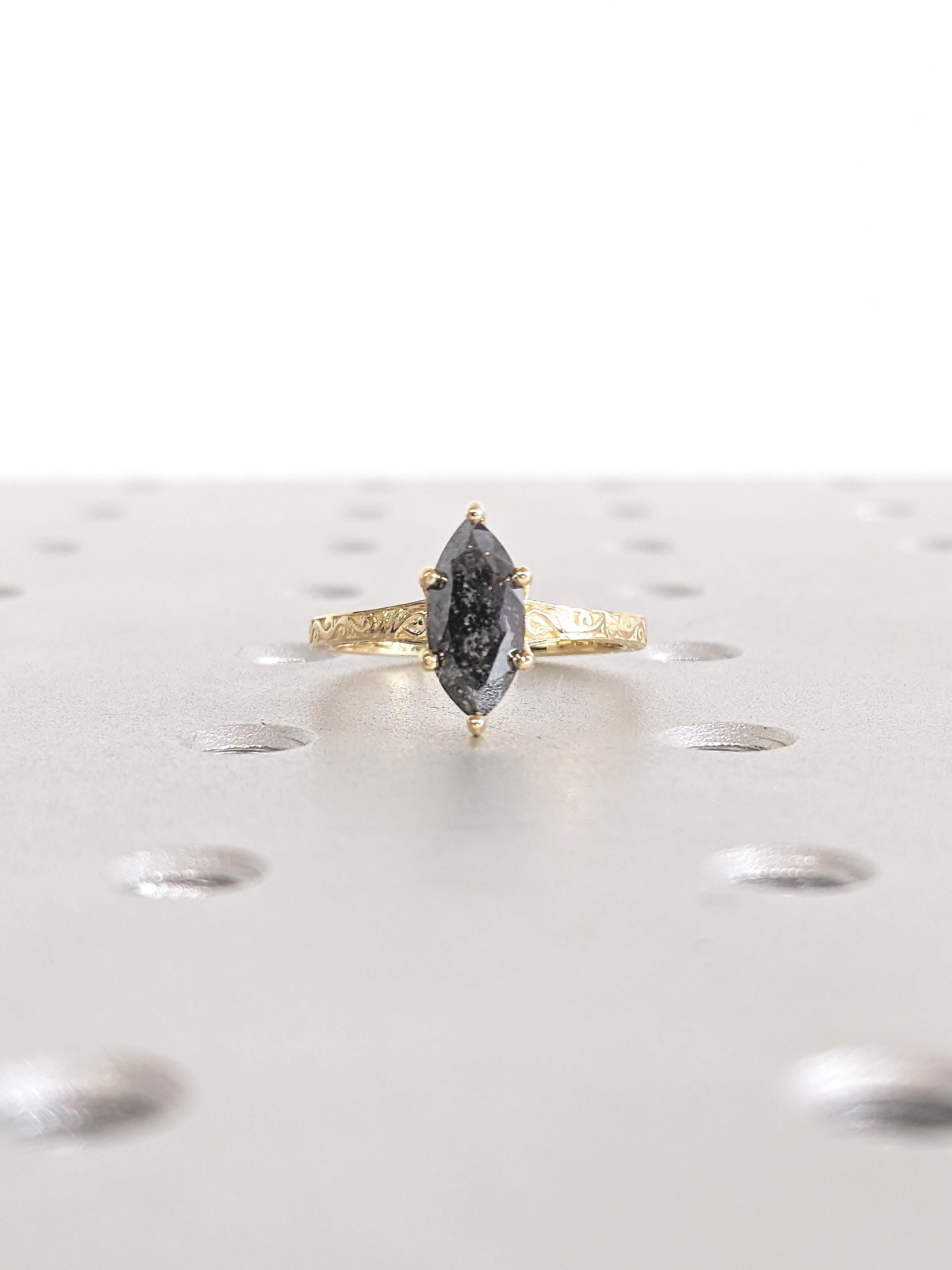 Unveil the timeless allure of your commitment with our marquise cut Salt and Pepper Diamond solitaire ring. Its intricate design showcases a basket setting delicately placed on a square-shaped band, adorned with undulating wave filigree for a touch of vintage elegance.