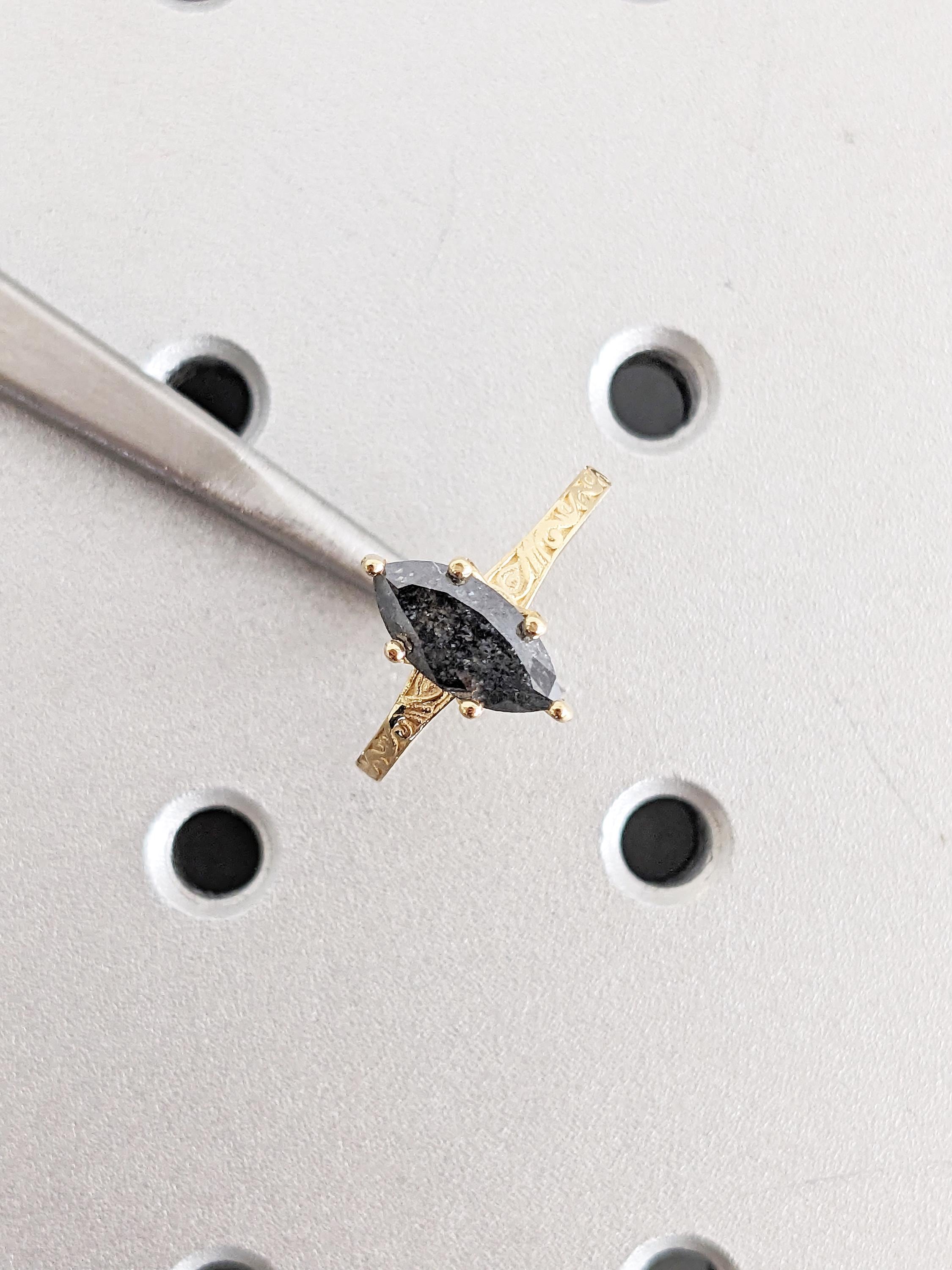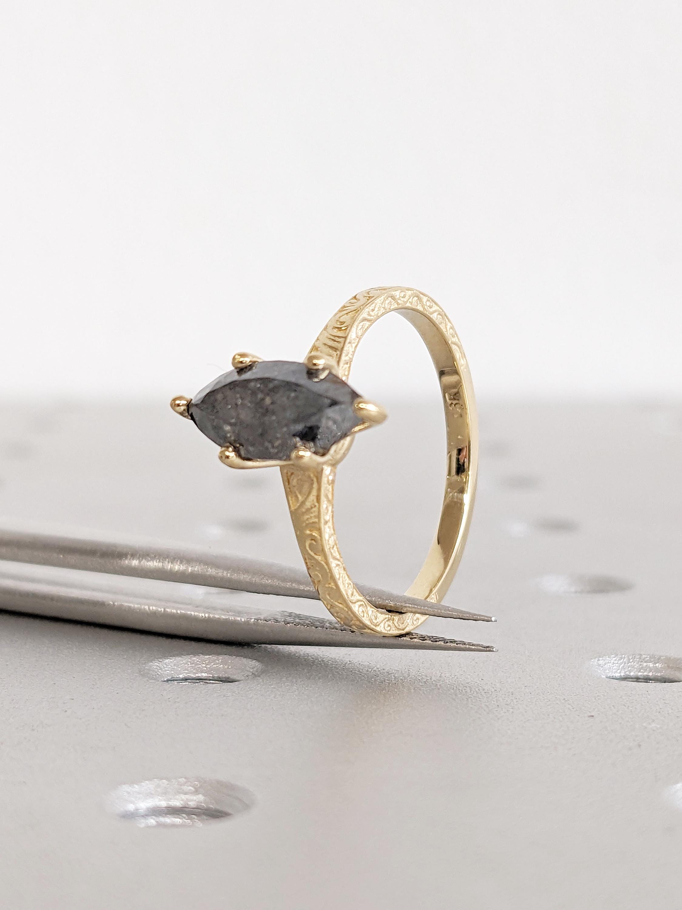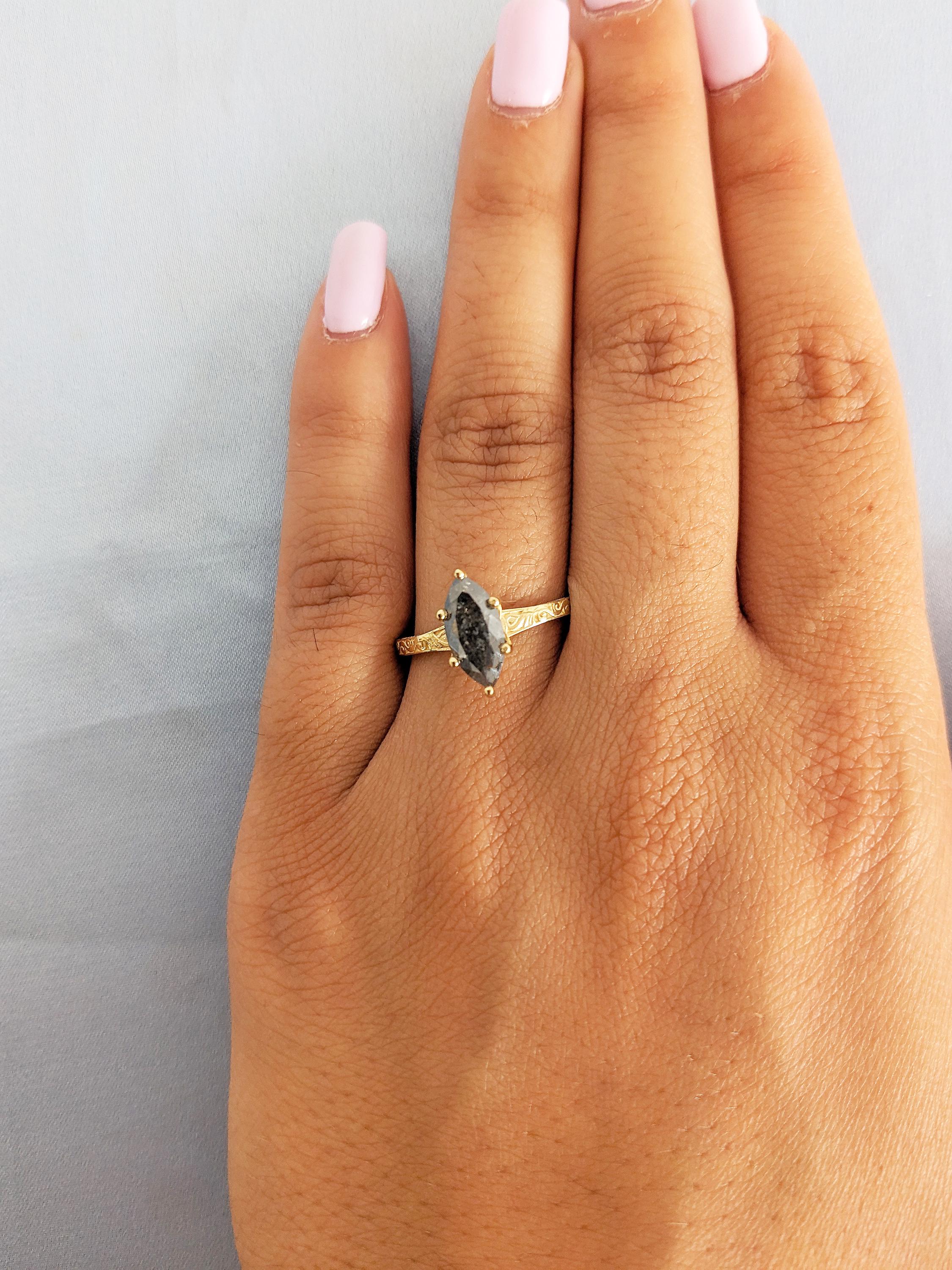 Marquise Salt and Pepper Diamond Engagement Ring, Filigree 18k Solid Gold Ring, Solitaire Ring