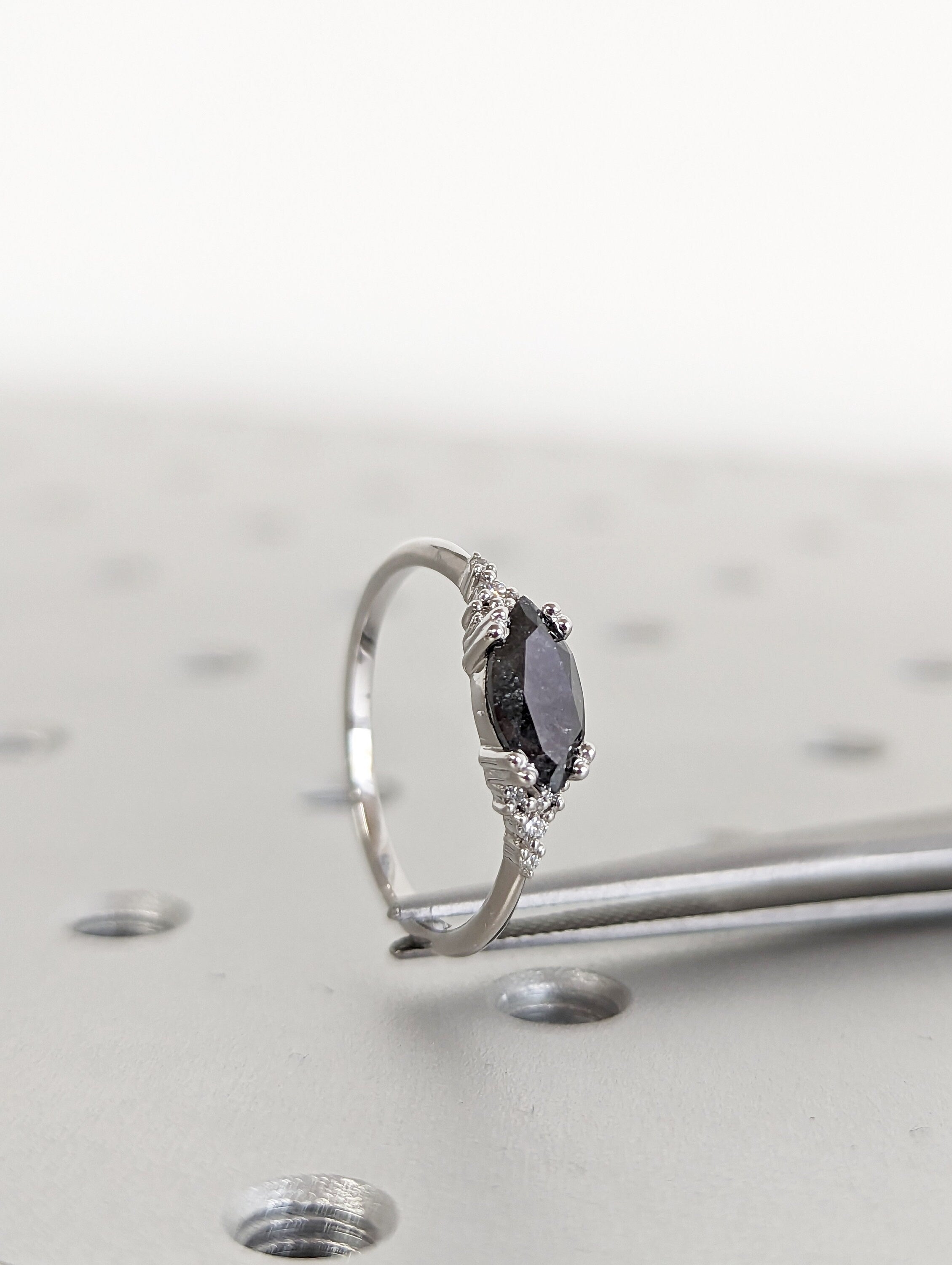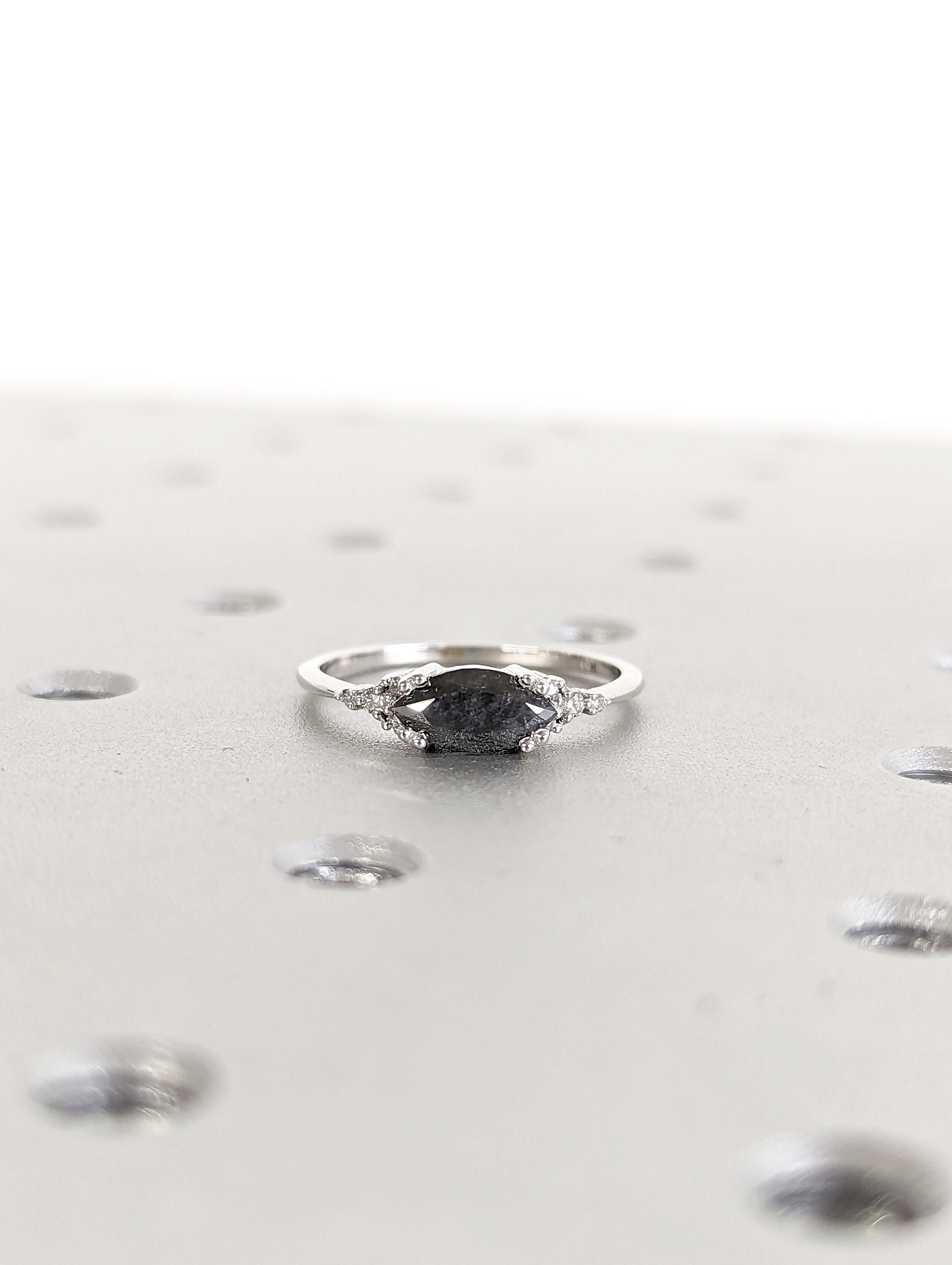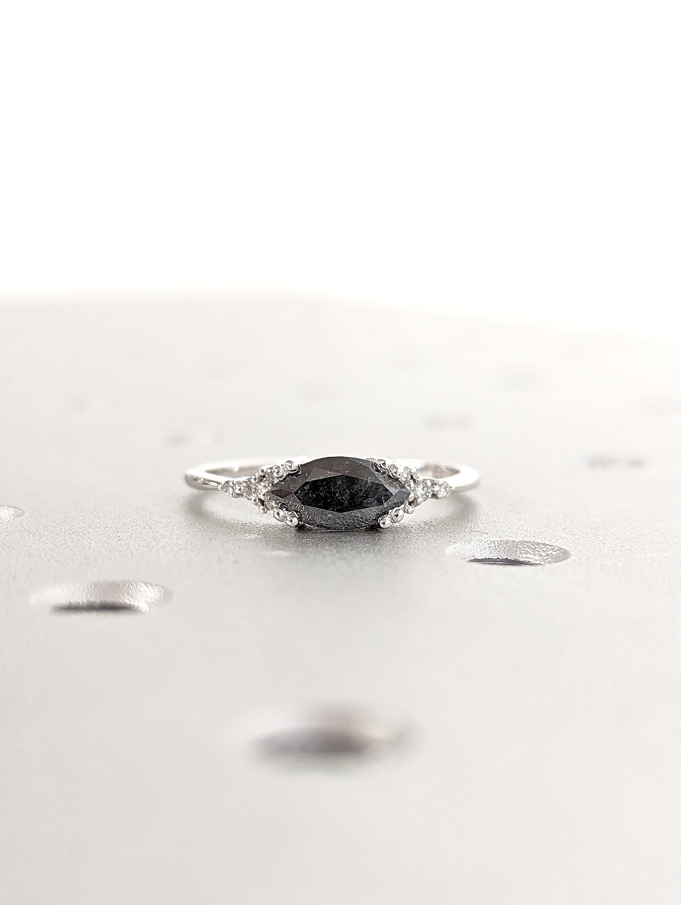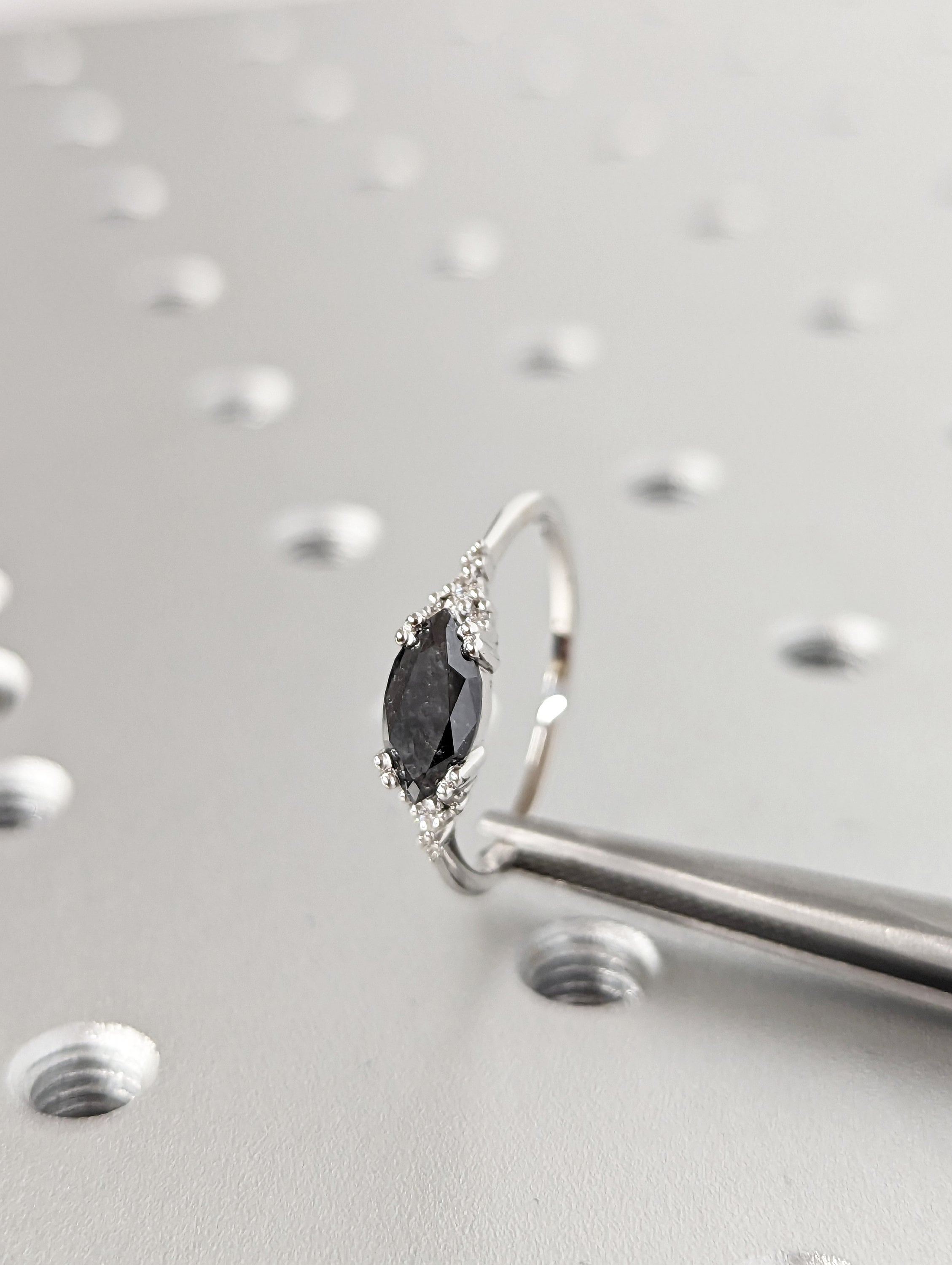 A stunningly beautiful vintage inspired design, petite band with a marquise cut Salt & Pepper diamond, adorned by natural diamonds, or moissanites of your choosing :)