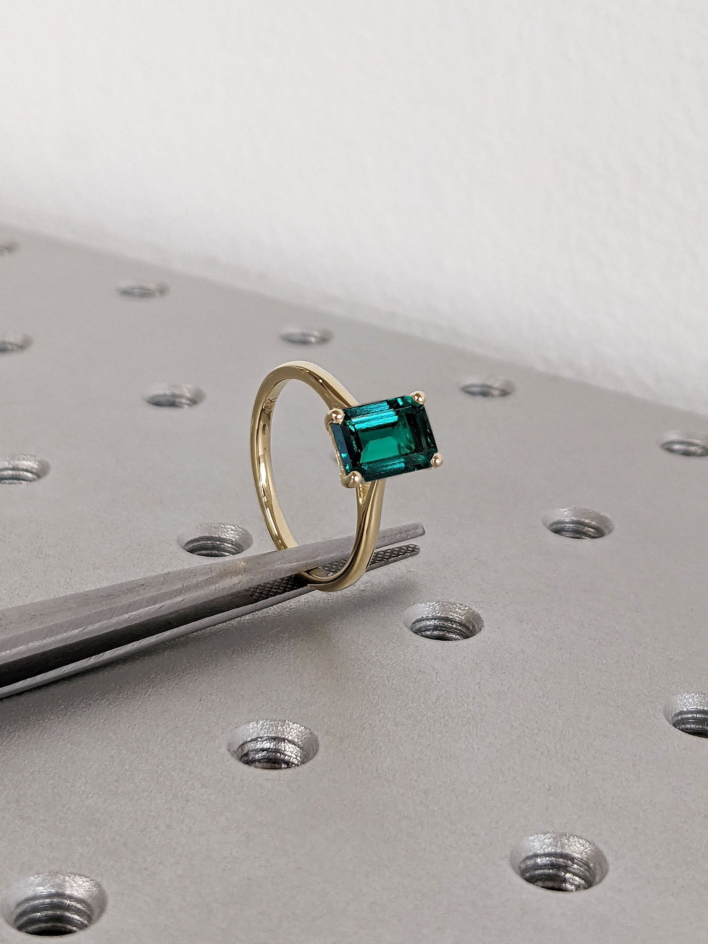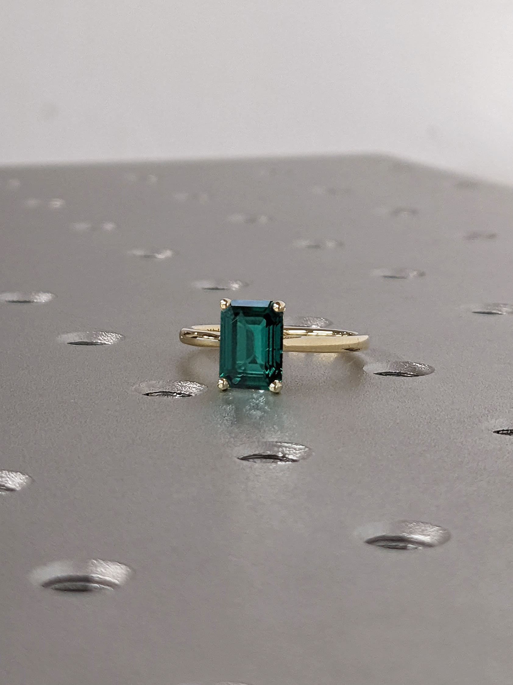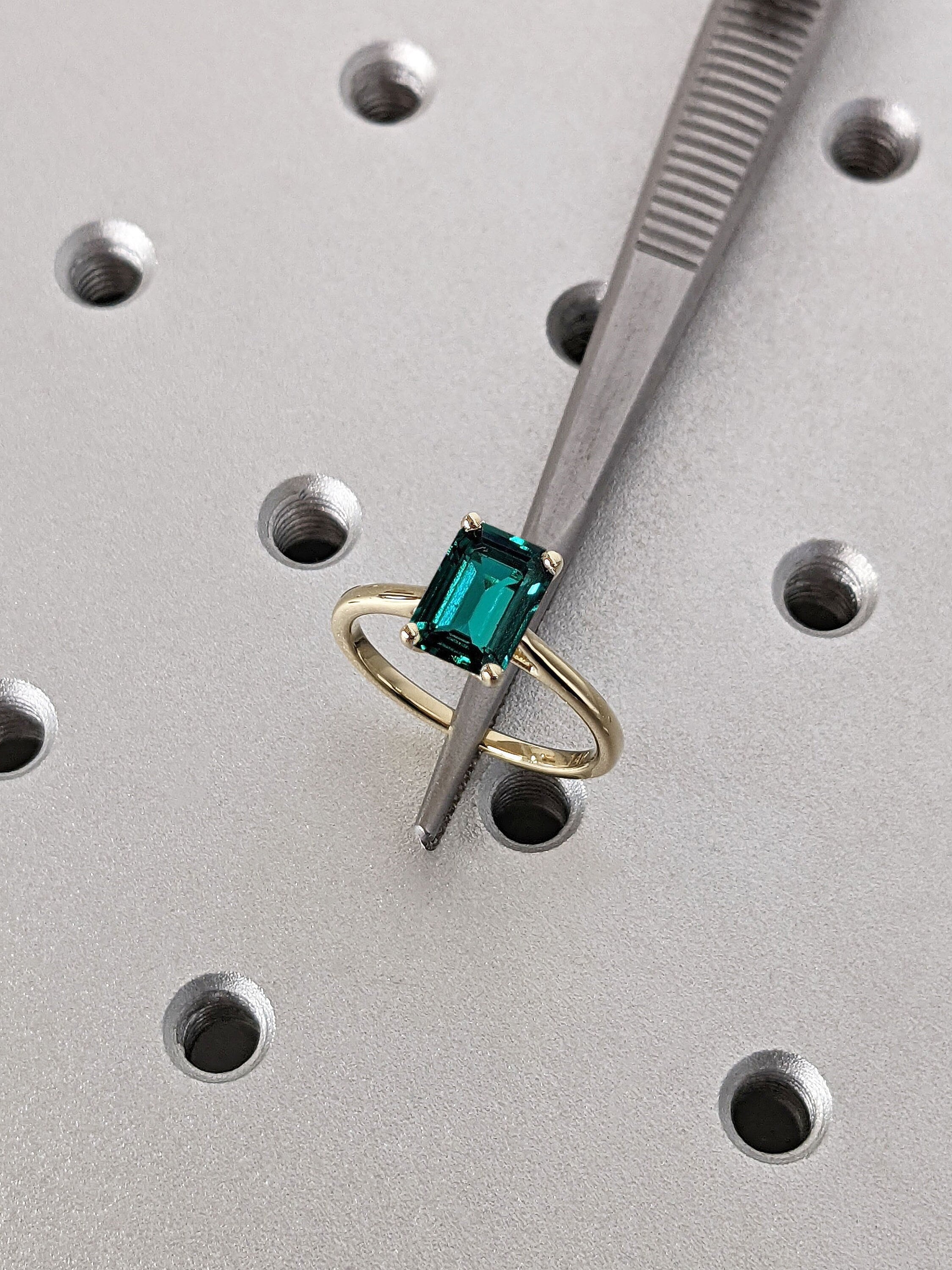 A beautiful emerald shaped Lab Grown Emerald, set with a high basket setting on a dainty rounded thin band of 1.8mm width. This minimalist solitaire ring wears comfortably and its timeless elegance suitable for any occasion.