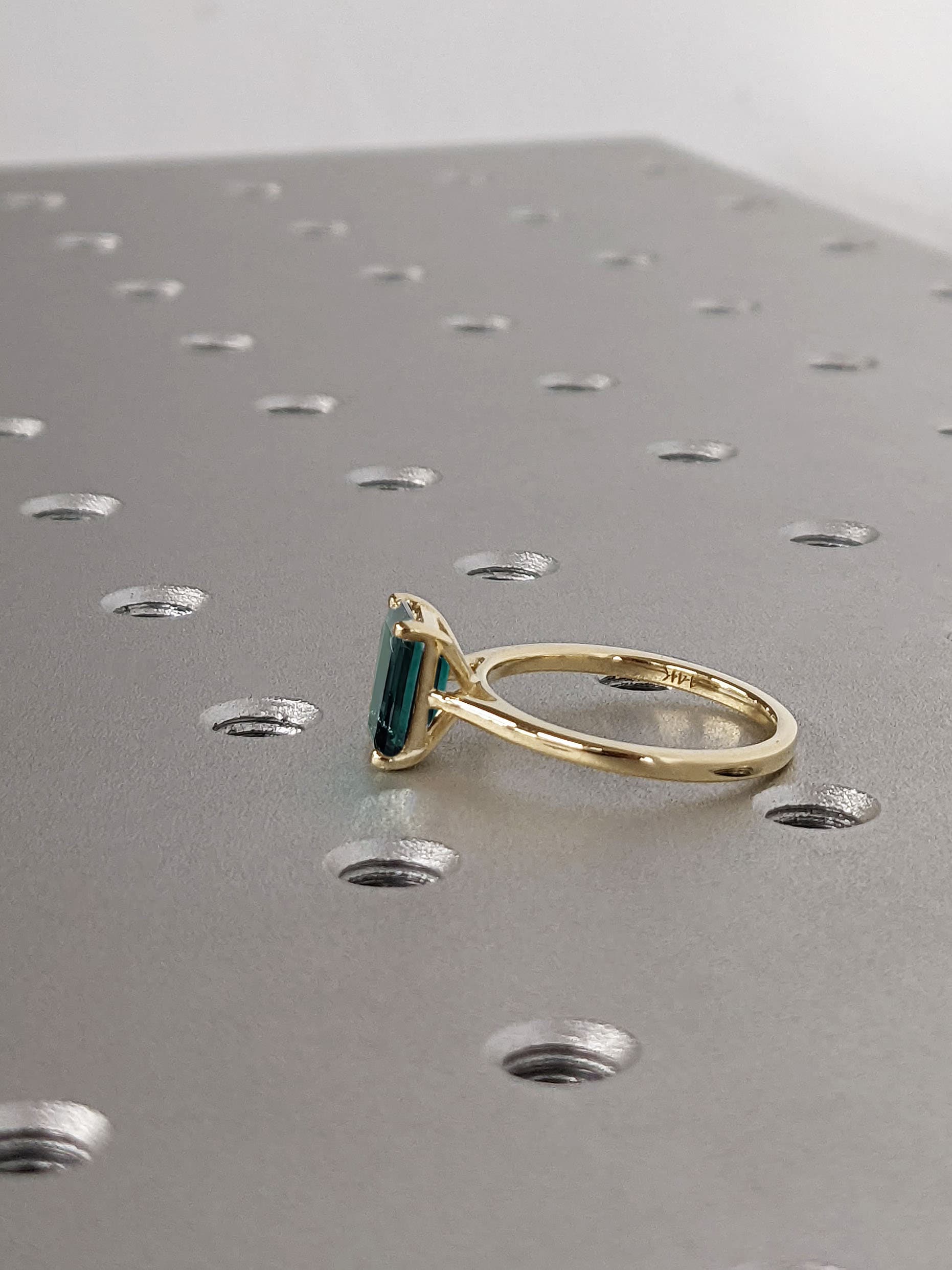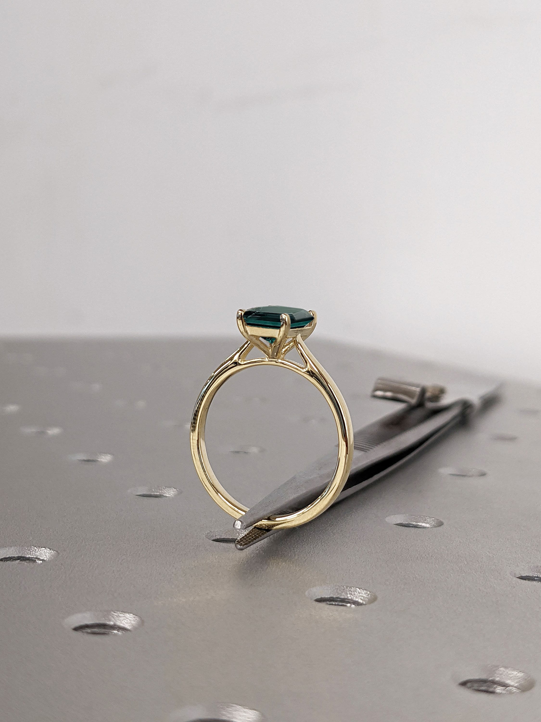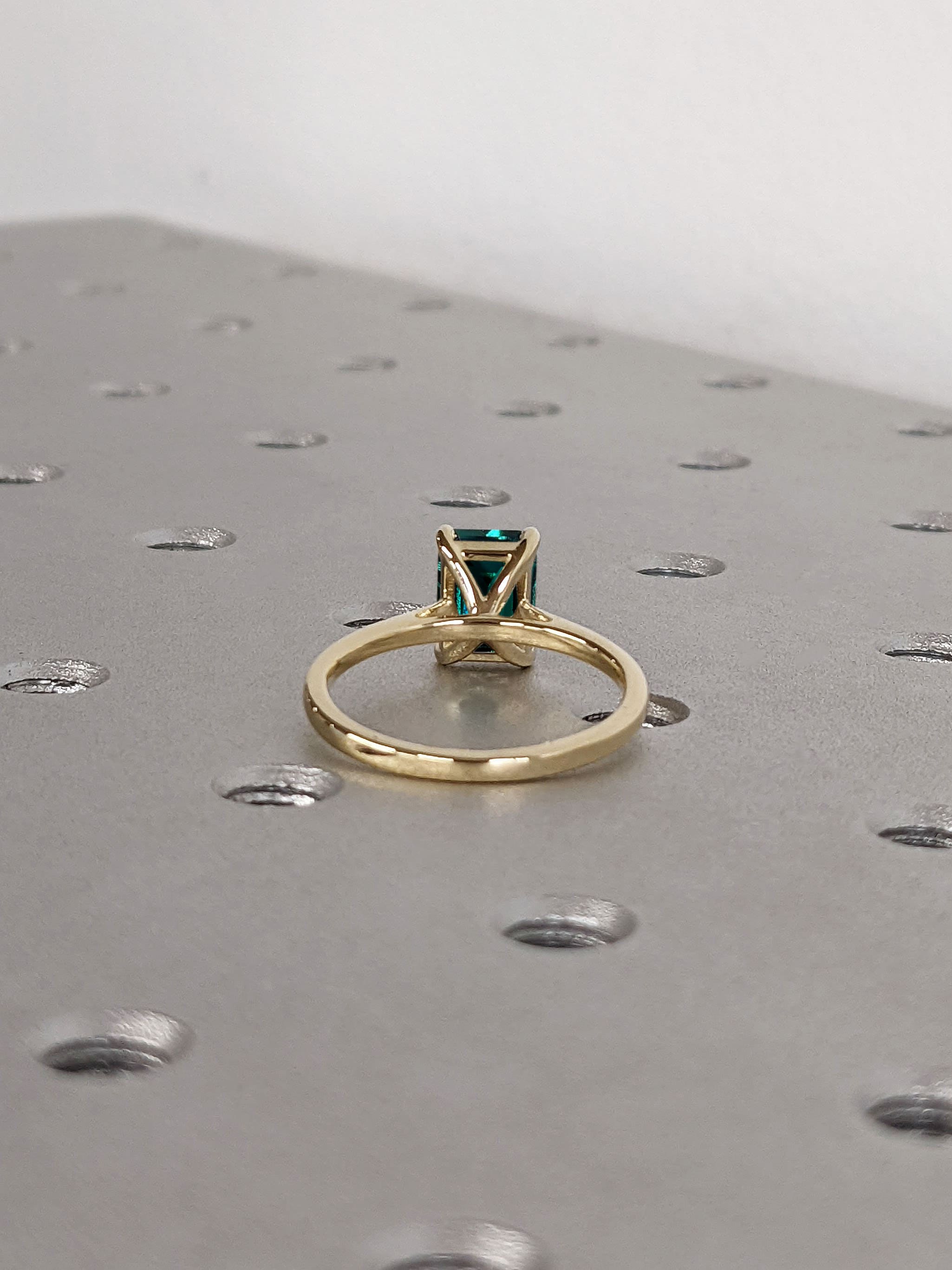 A beautiful emerald shaped Lab Grown Emerald, set with a high basket setting on a dainty rounded thin band of 1.8mm width. This minimalist solitaire ring wears comfortably and its timeless elegance suitable for any occasion.