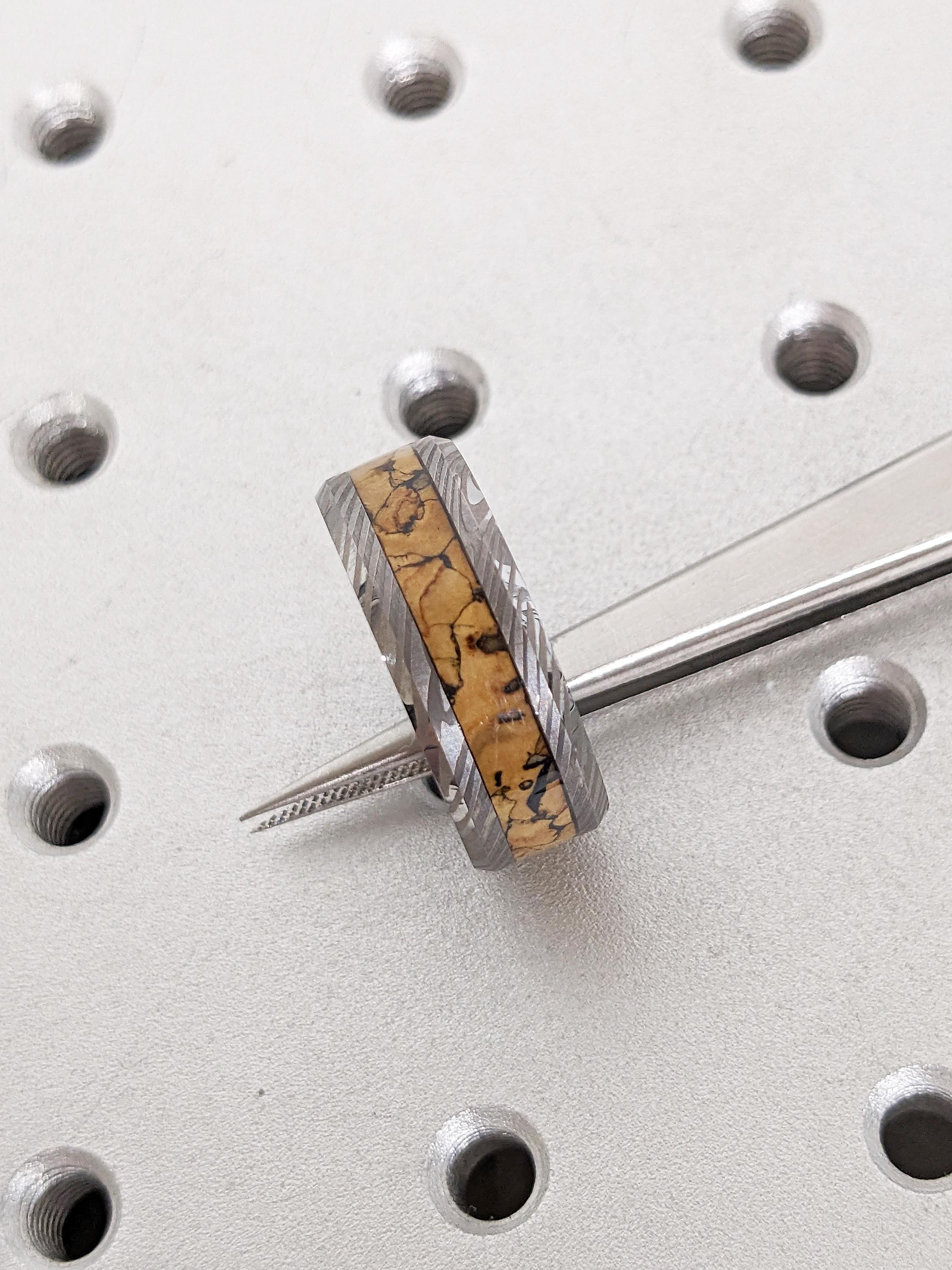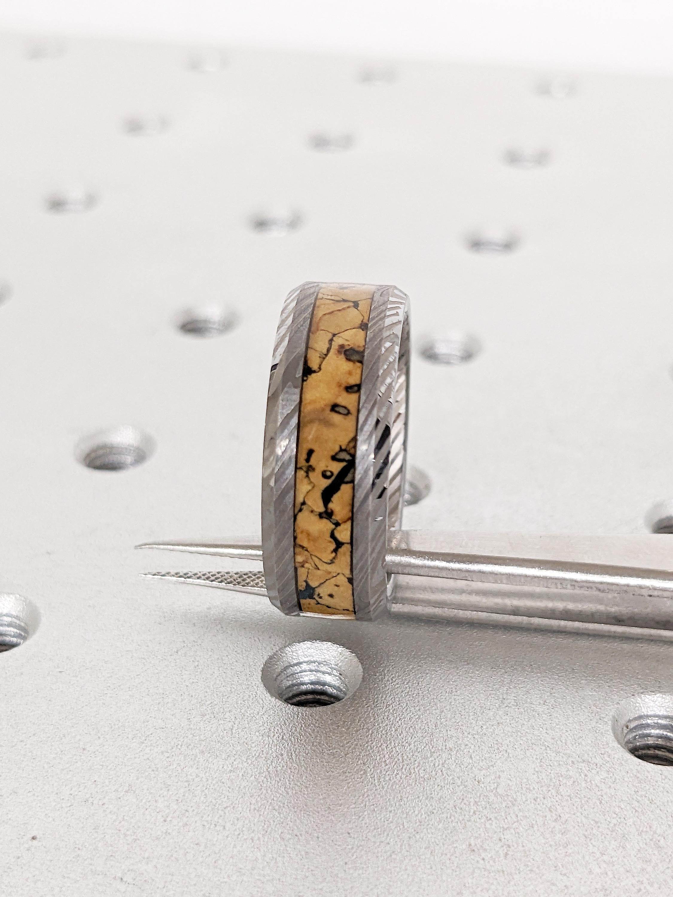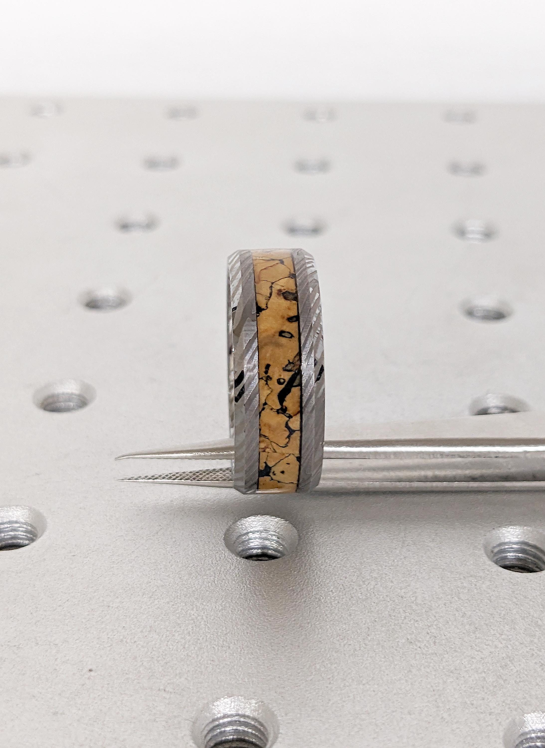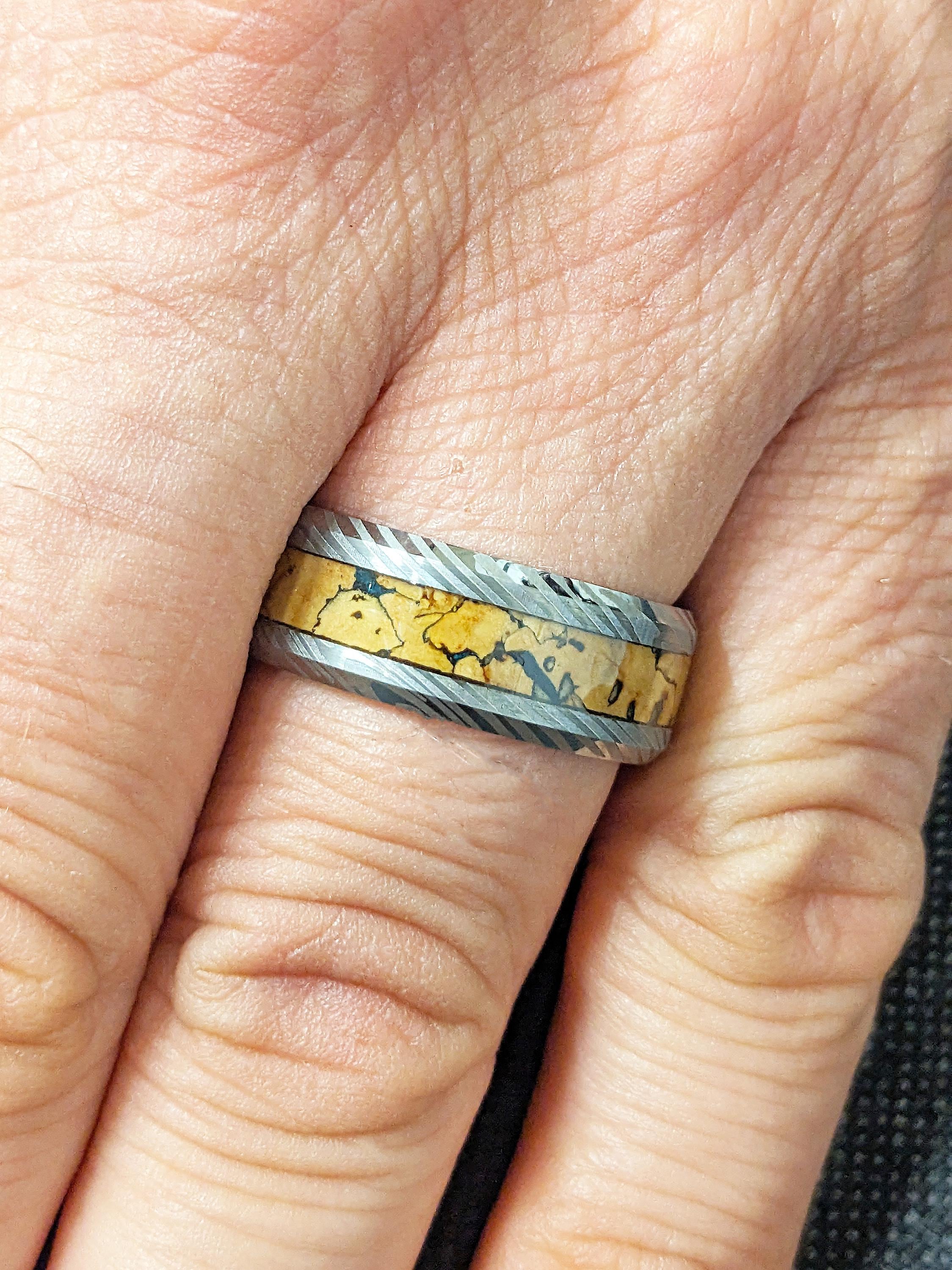 Men Wedding Band, Damascus Ring, 8mm Tungsten Ring Men, Unique Dinosaur Fossil Ring