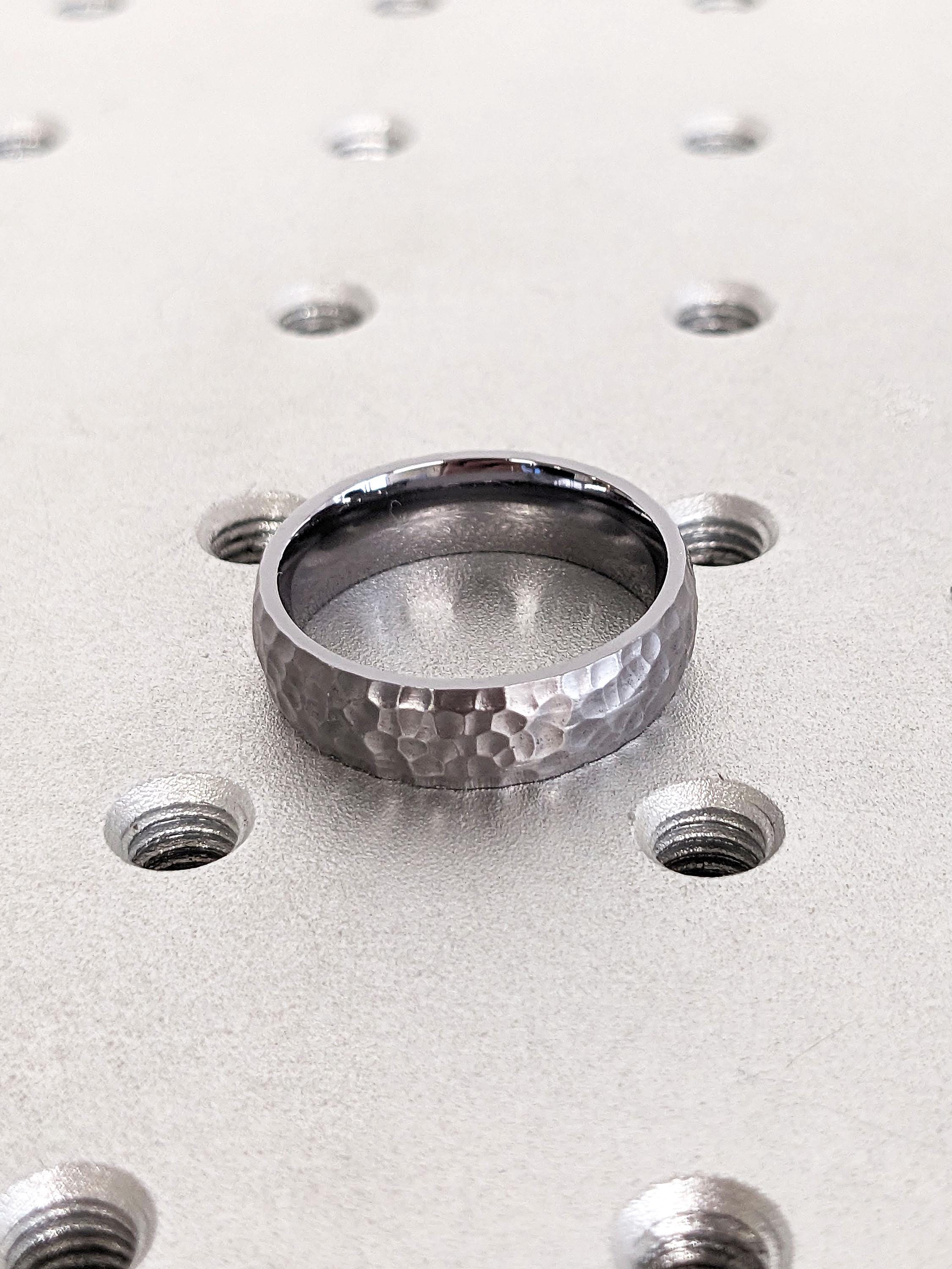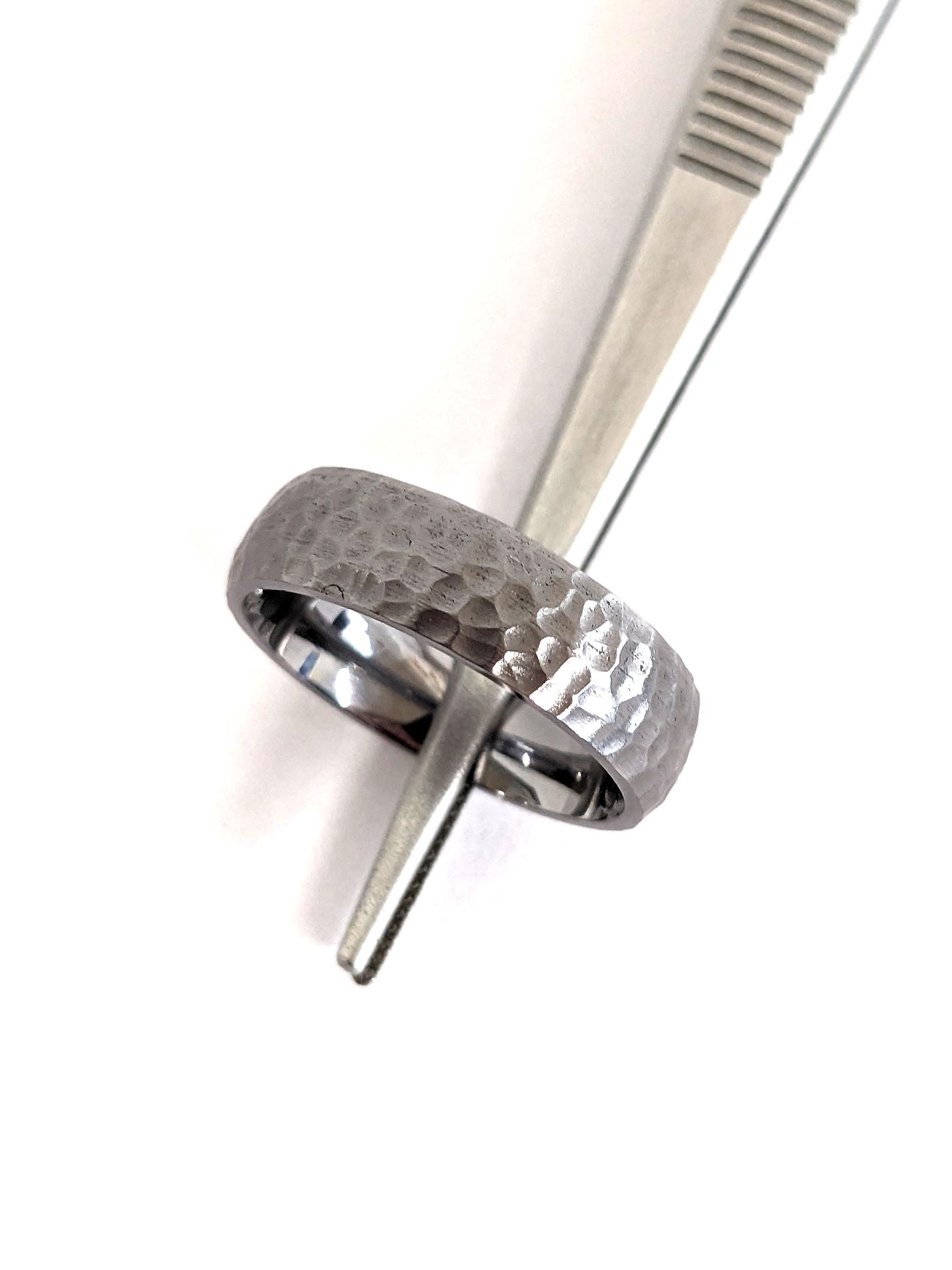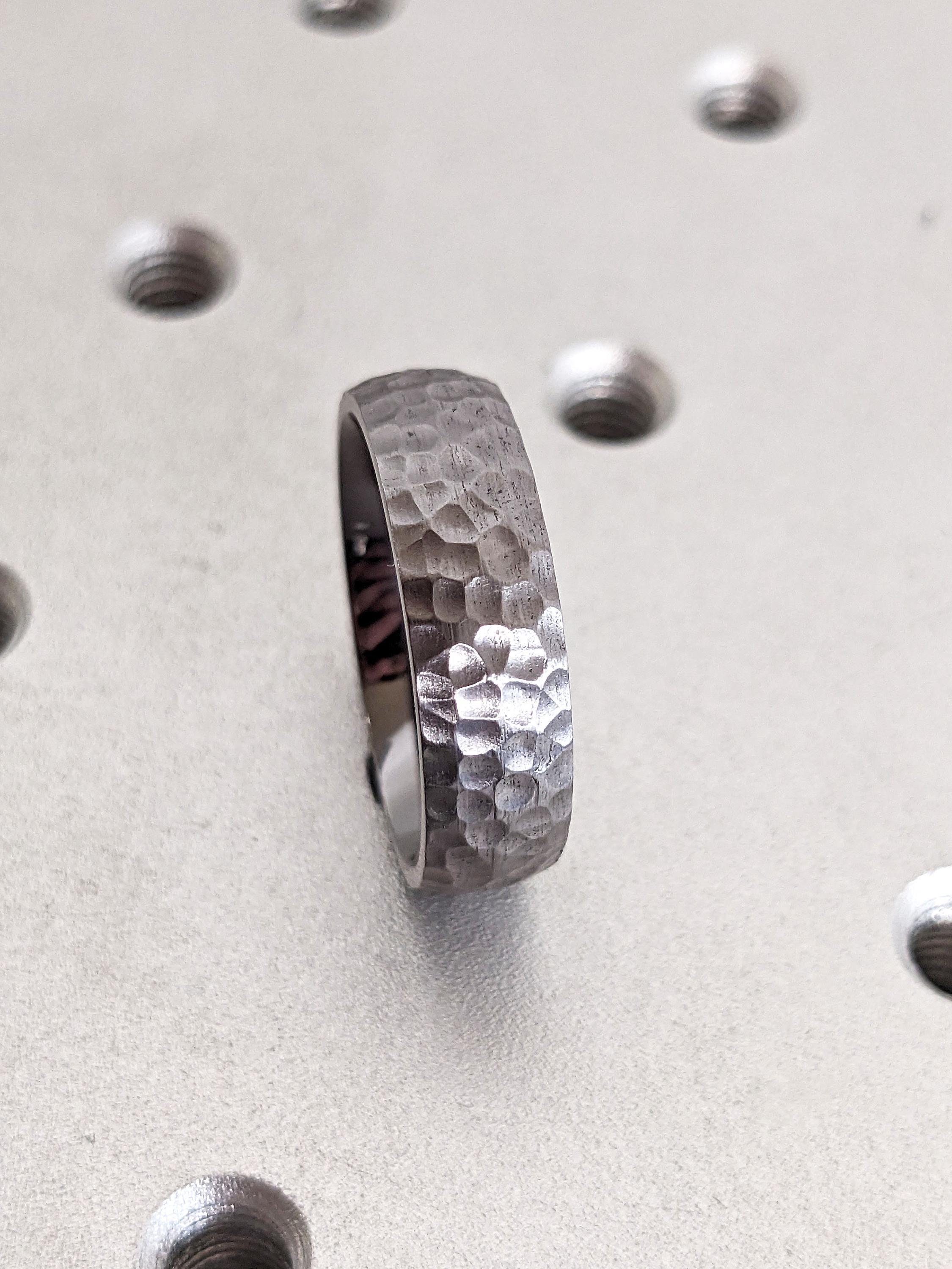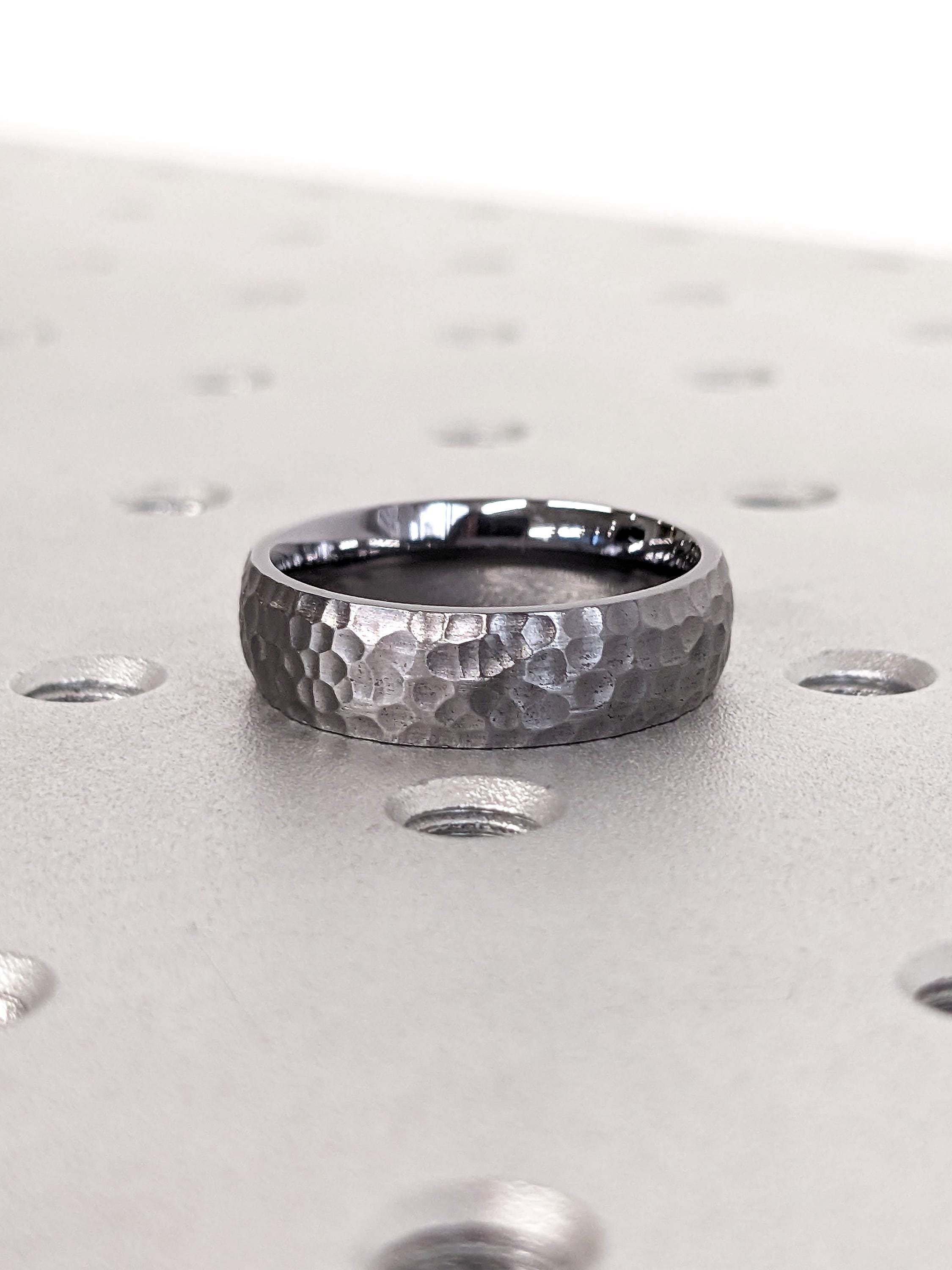 An alternative metal, 6mm width ring for him, with hand hammered faceted surface. With a sophisticated dark grey hue, this ring is hypoallergenic and comes with comfort fit suitable for everyday wear.