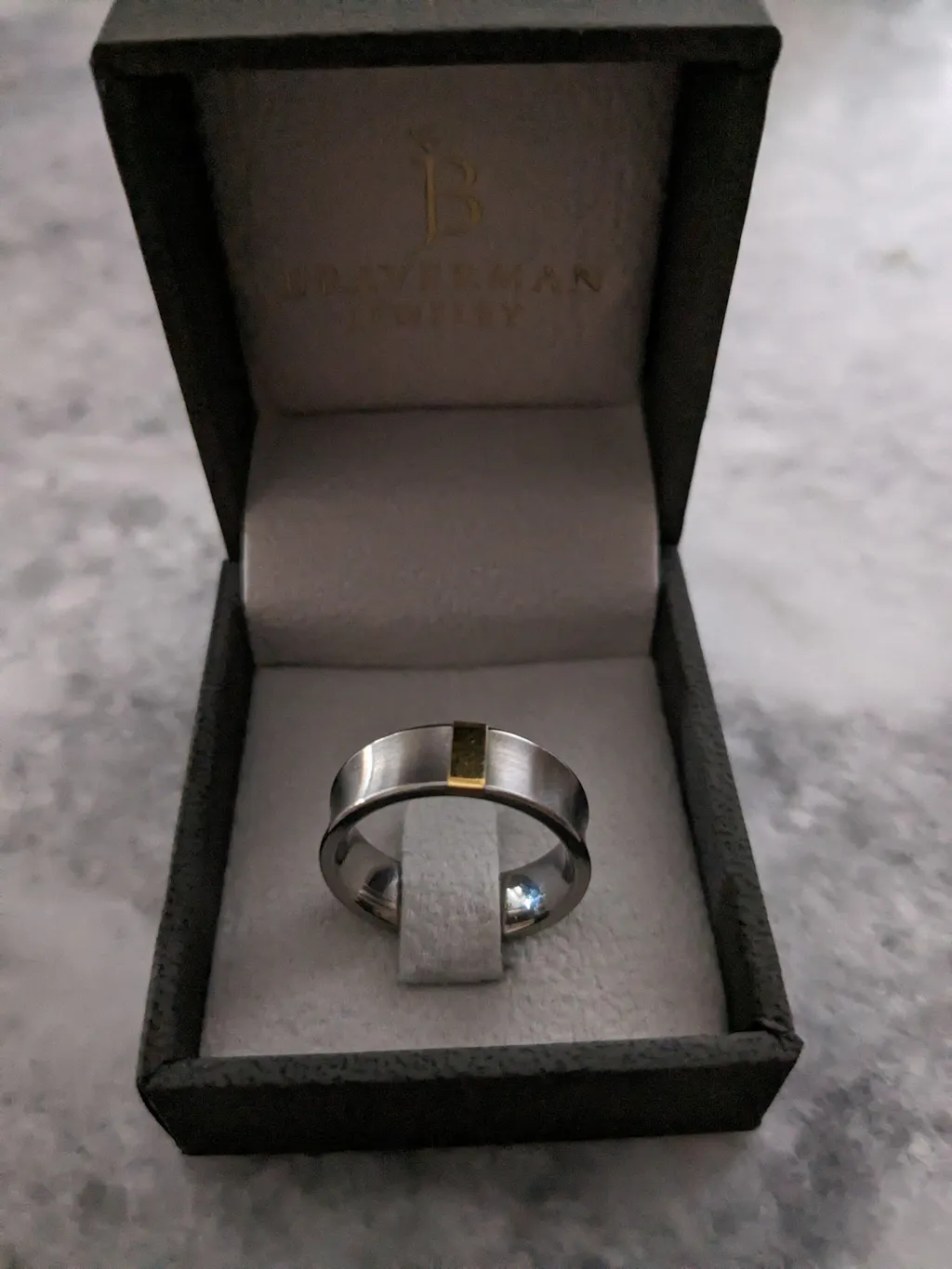 This hand made ring is crafted of the finest quality titanium. The ring has a brushed concave design with yellow gold plated rectangle. It's comfort fit and can be as a day to day accessory or as men’s wedding band or engagement ring.