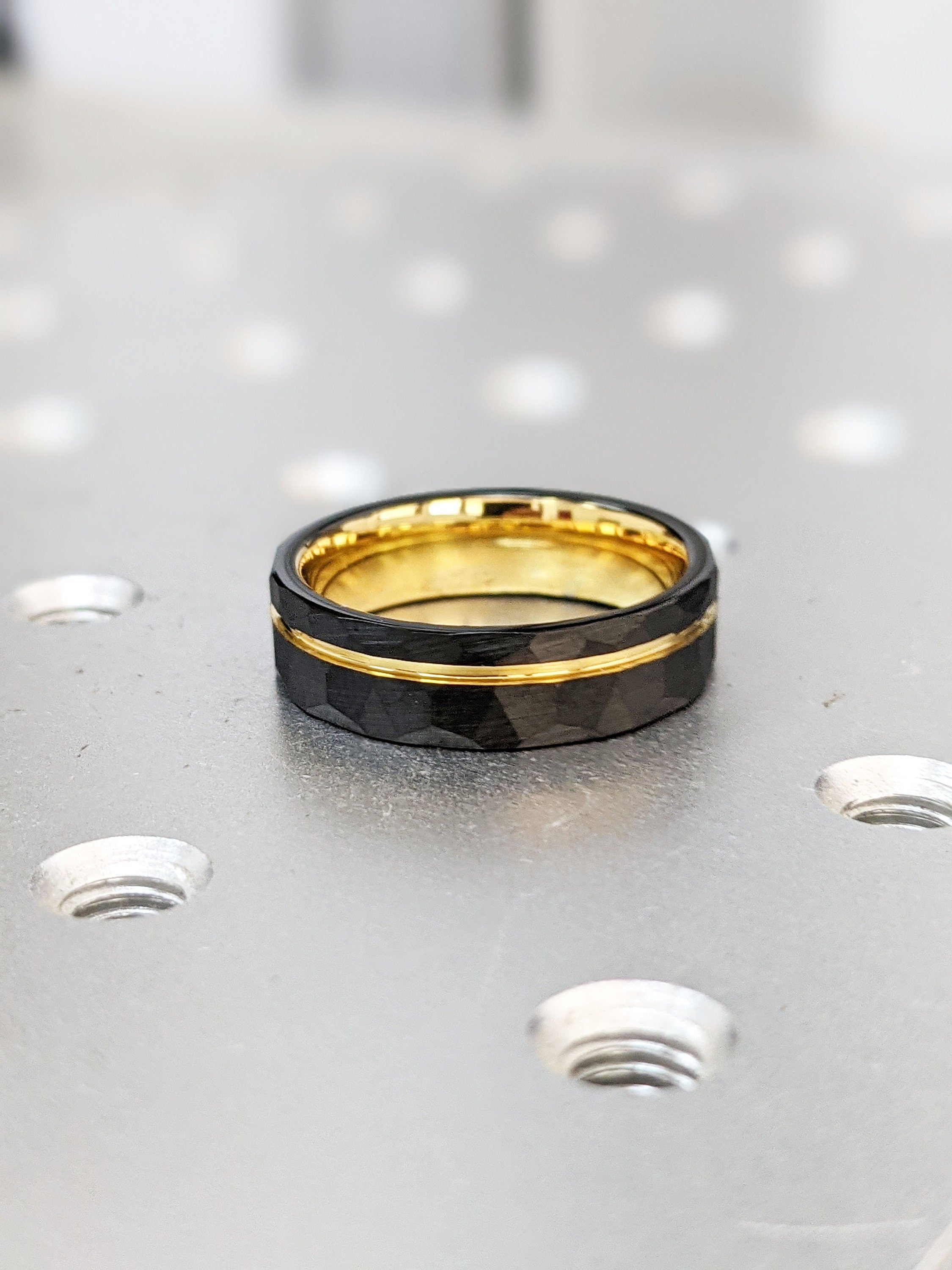 This Tungsten wedding band features a bold black hammered finish with a sleek golden groove, creating a modern and masculine look. Designed in a comfort fit for daily wear, it is hypoallergenic and cobalt-free, offering strength, durability, and style. Perfect for men who value elegance and confidence in their wedding or everyday band.