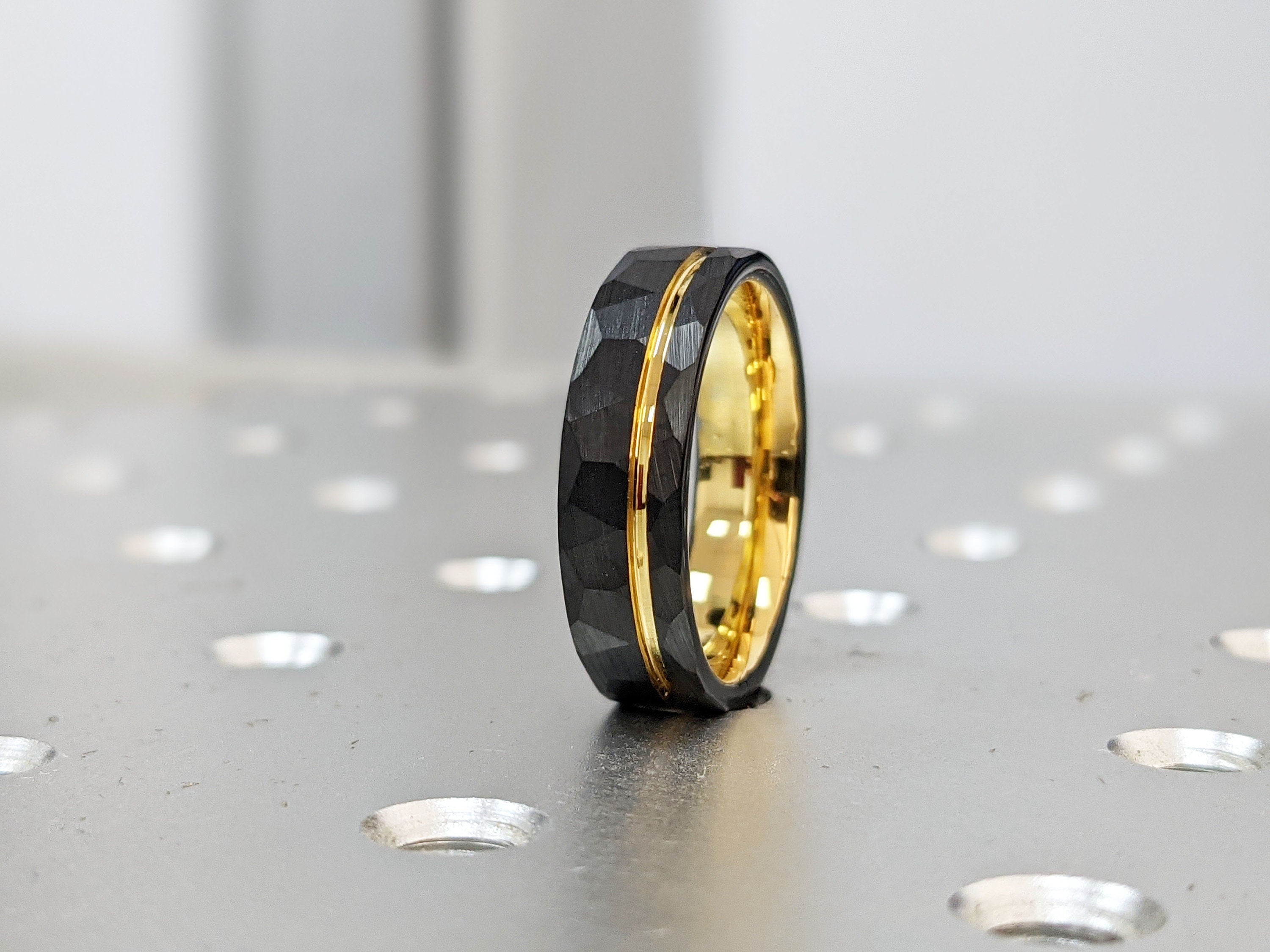 Men’s Tungsten Wedding Band, 6mm Yellow Gold Black Hammered Tungsten Ring, Comfort Fit Men’s Engagement Band, Men's Everyday Wear Ring Gift
