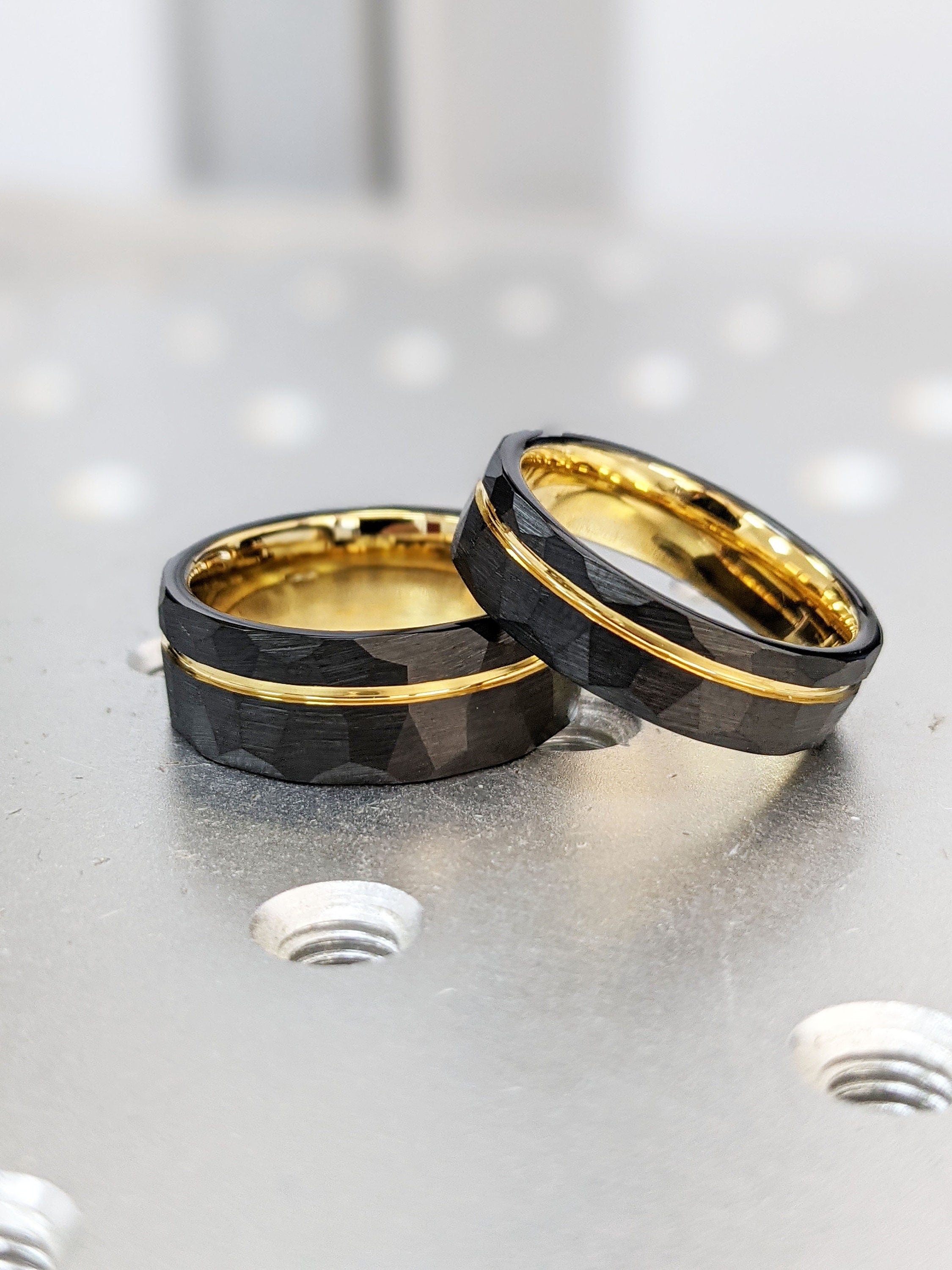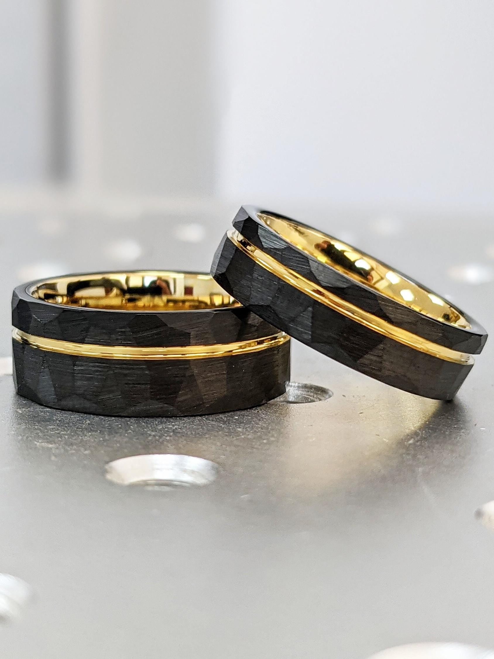 Men’s Tungsten Wedding Band Set, Durable Men's Engagement Ring Set, Black Hammered Yellow Gold Ring, 6mm & 8mm Comfort Fit Everyday Ring