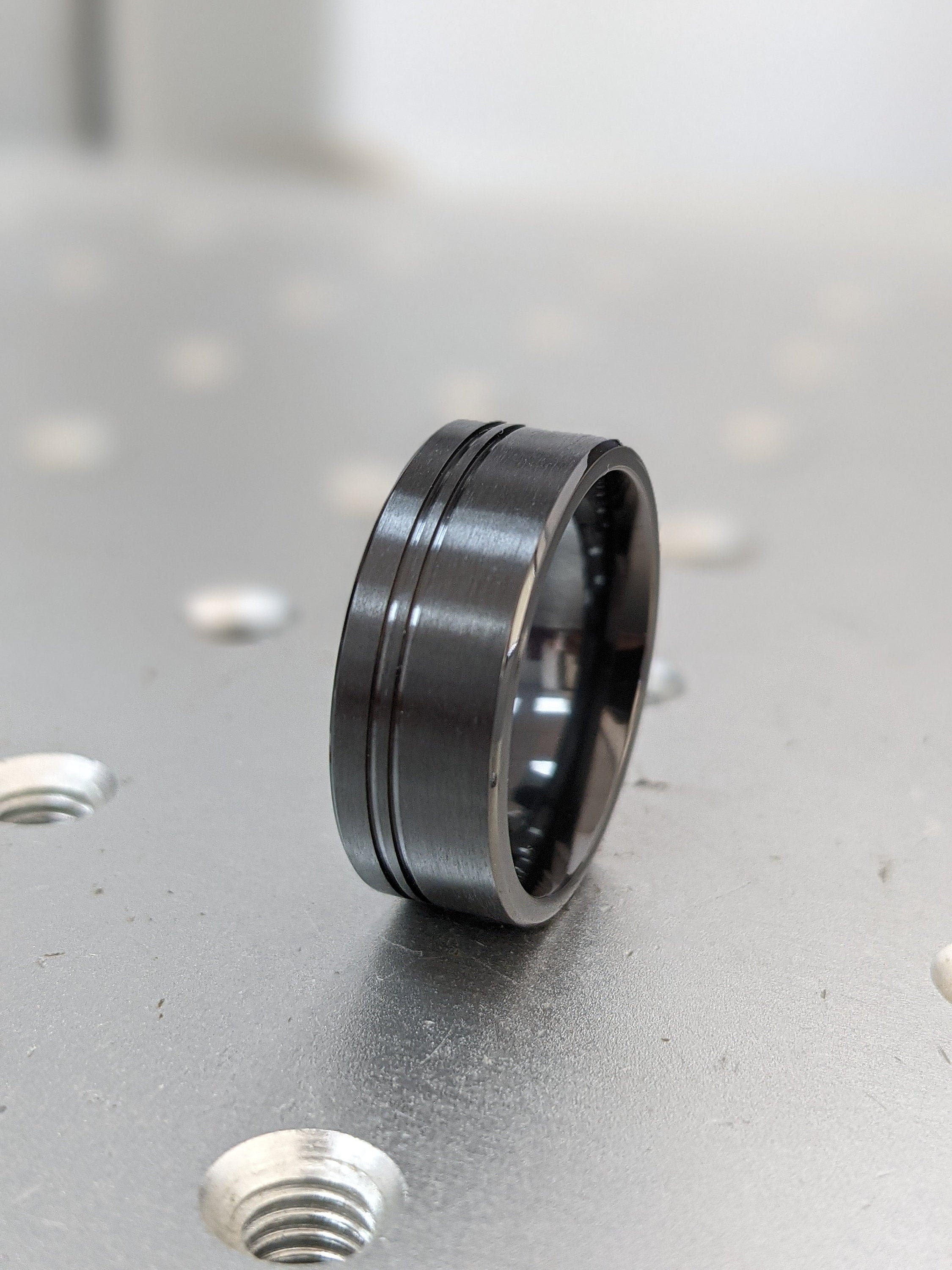 This hand made ring is crafted of the finest quality black zirconium. One of our unique custom handmade Black Zirconium ring, this piece is made with the greatest of care, the black color of the piece with its brushed finish are forever beautiful, a ring suiting as a men's wedding band as well - Double Grooved Line.