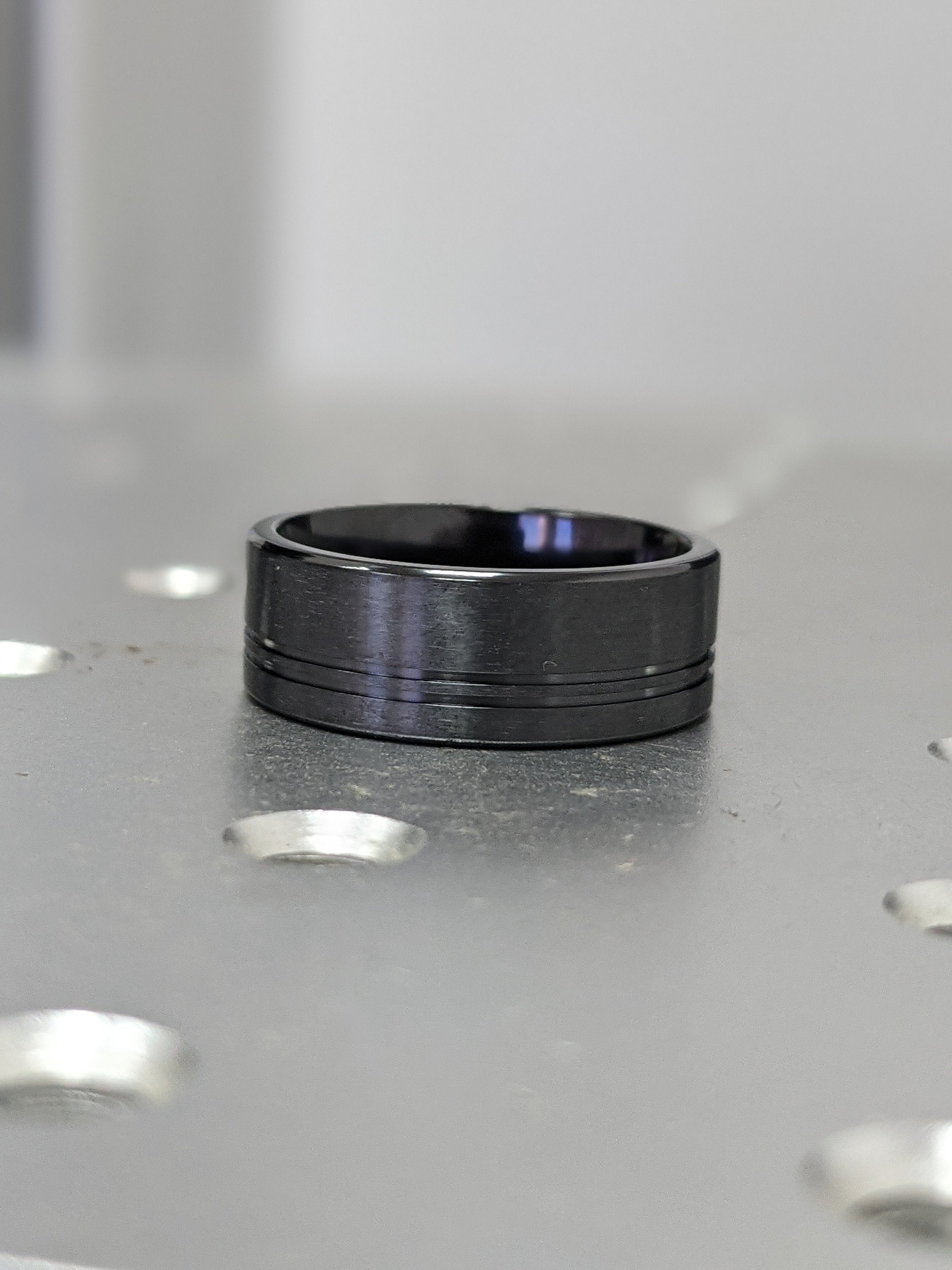 This hand made ring is crafted of the finest quality black zirconium. One of our unique custom handmade Black Zirconium ring, this piece is made with the greatest of care, the black color of the piece with its brushed finish are forever beautiful, a ring suiting as a men's wedding band as well - Double Grooved Line.