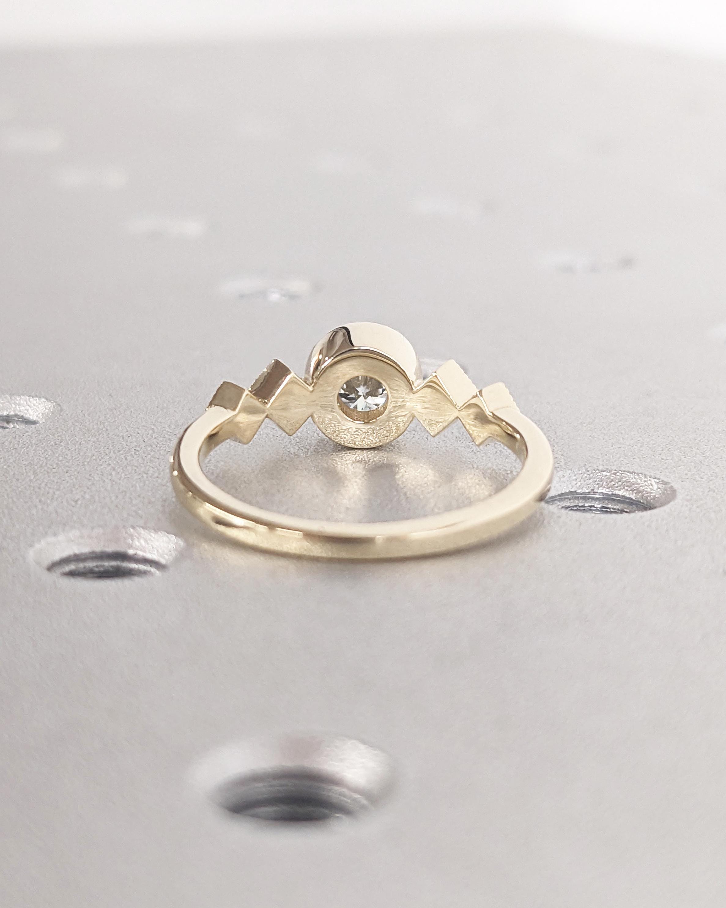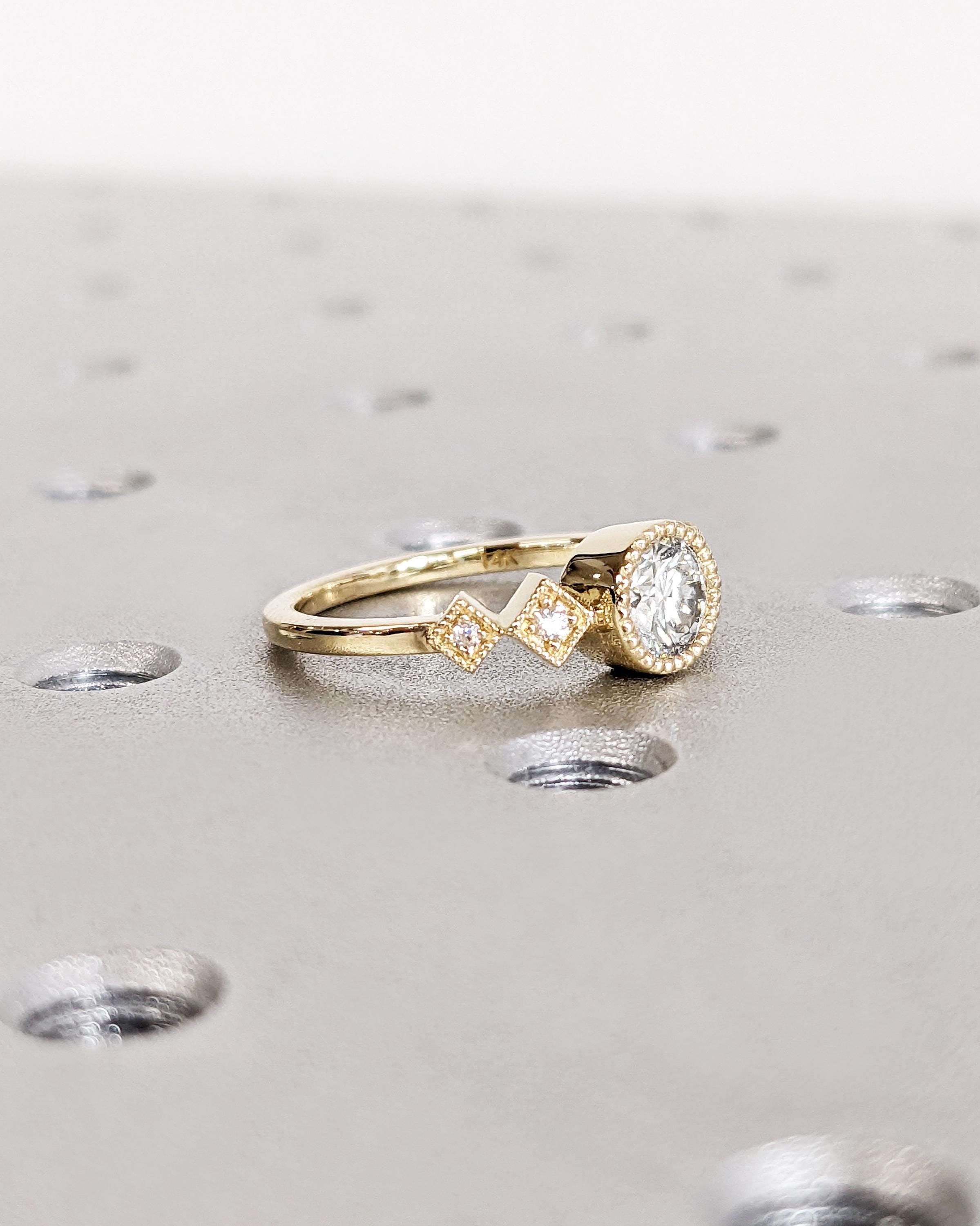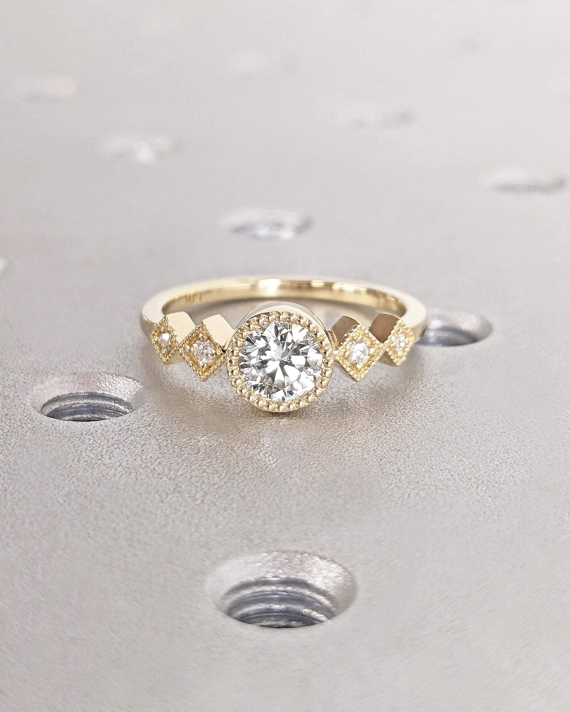 Designed for the alternative bride, this engagement ring combines vintage charm with contemporary style. The centerpiece of this five-stone ring is a dazzling round-cut lab diamond, securely held in a round bezel setting with exquisite milgrain detail. The band is adorned with four round-cut side stones, also bezel-set with matching milgrain detailing. Choose from natural diamonds, lab diamonds, or moissanites for the side stones. This design is a beautiful harmony of shapes, making it an exceptional choice for a modern yet timeless engagement ring.