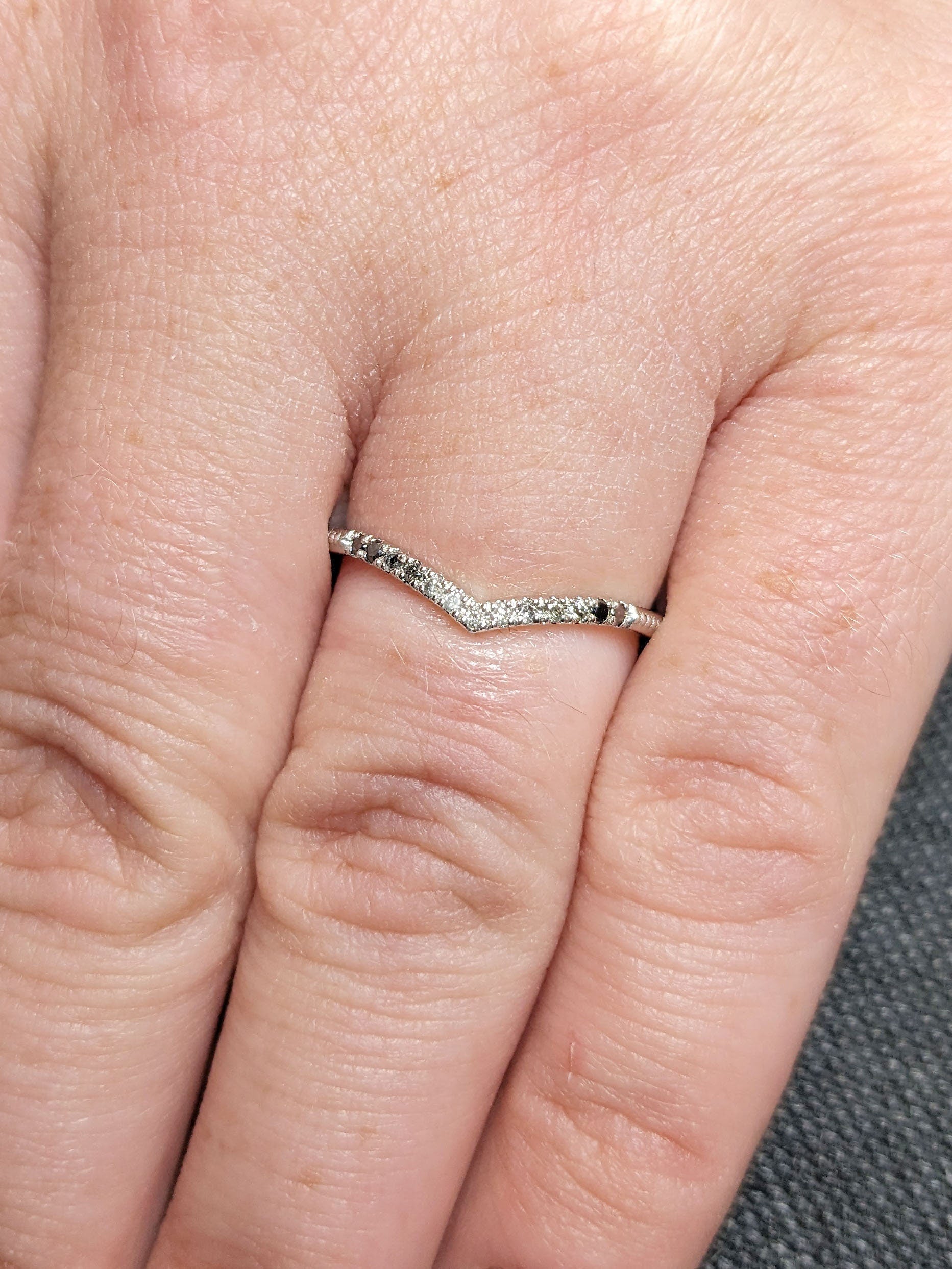 Delicate and refined, this V-shaped band sparkles with micro pavé-set natural ombre diamonds, adding a graceful curve that pairs beautifully with solitaires or worn as a standalone piece. The 1.5mm width keeps the design sleek and lightweight, while the milgrain detailing lends a vintage-inspired touch of texture and craftsmanship. Perfect as a stacking band, wedding band, or a subtle accent of brilliance.