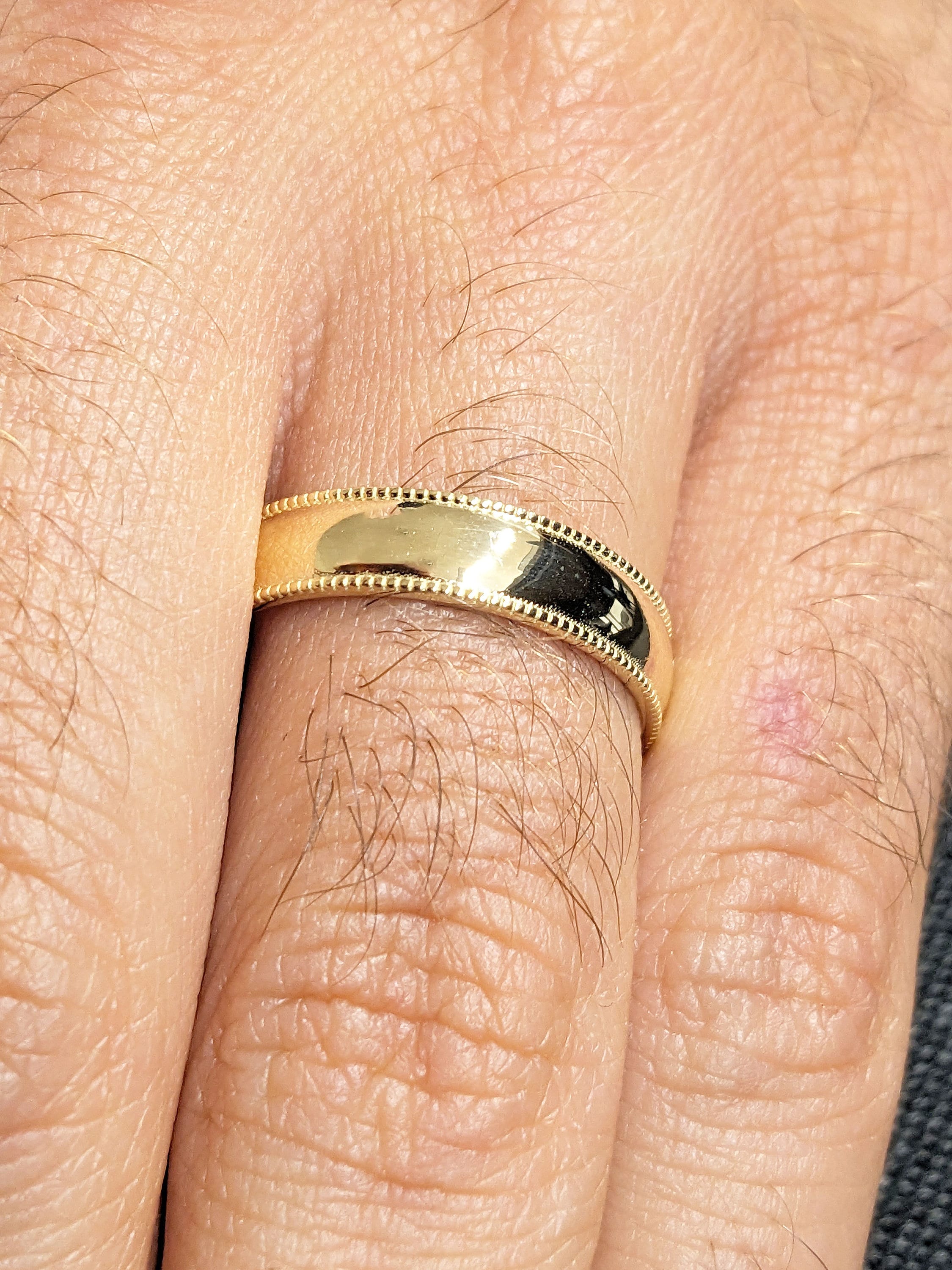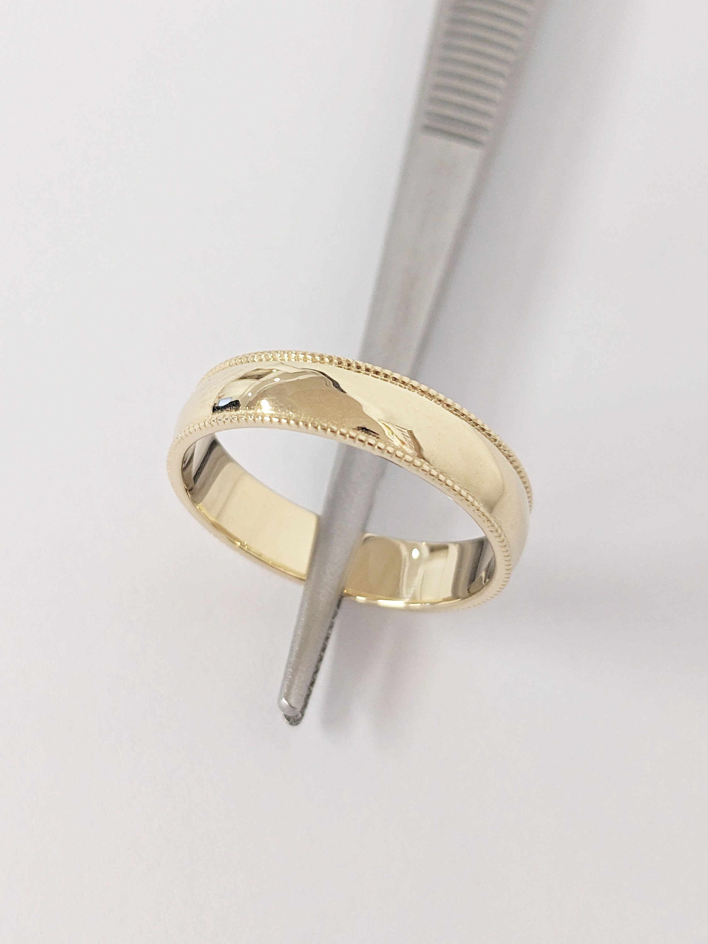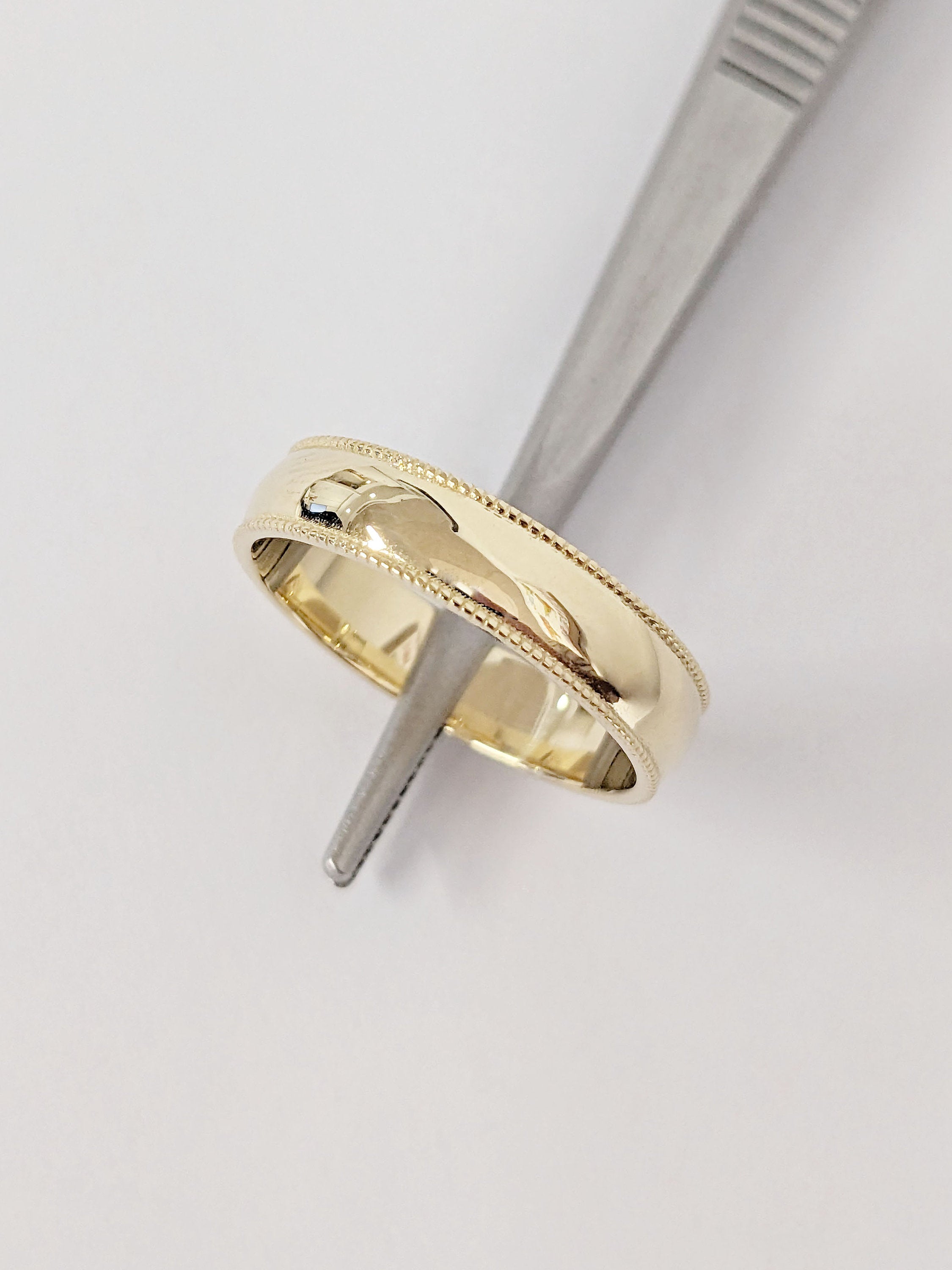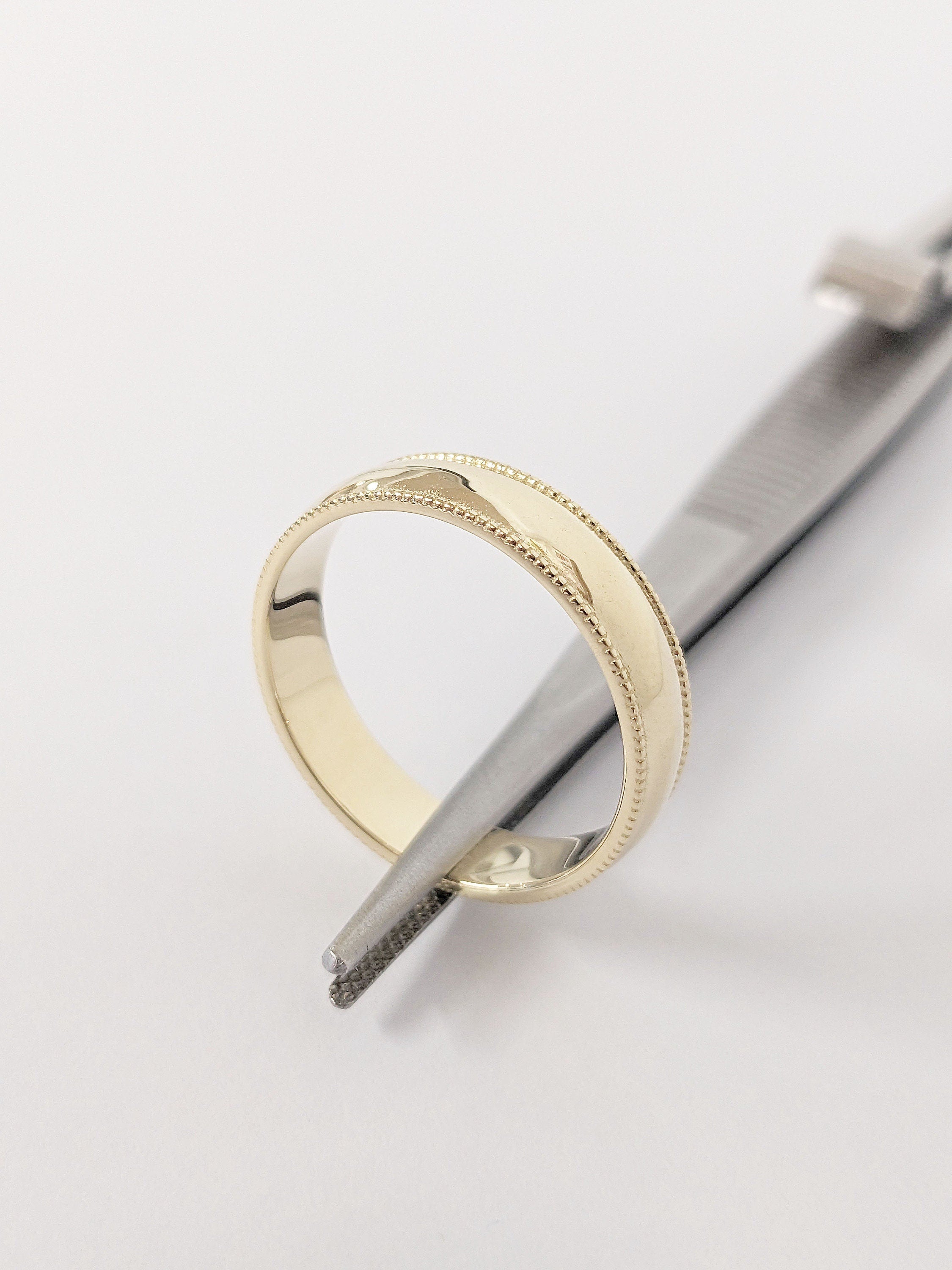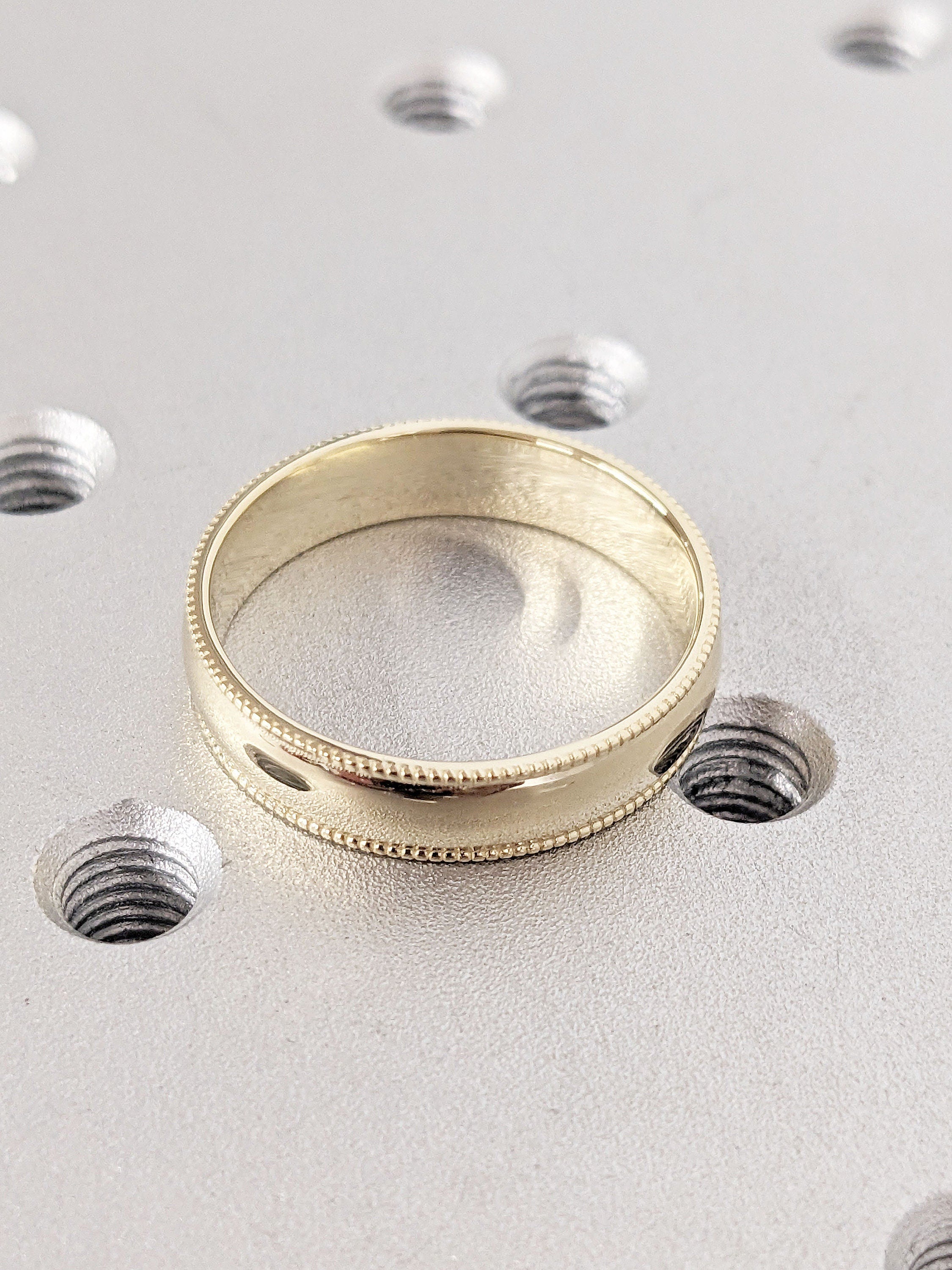 With its sleek and minimalist aesthetic, this handmade 5mm width band features delicate milgrain beaded edge. Effortlessly blending modern and vintage charm, this timeless ring is perfect as an understated everyday jewelry for him.